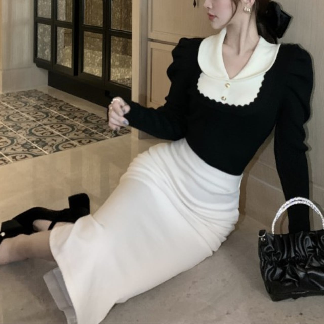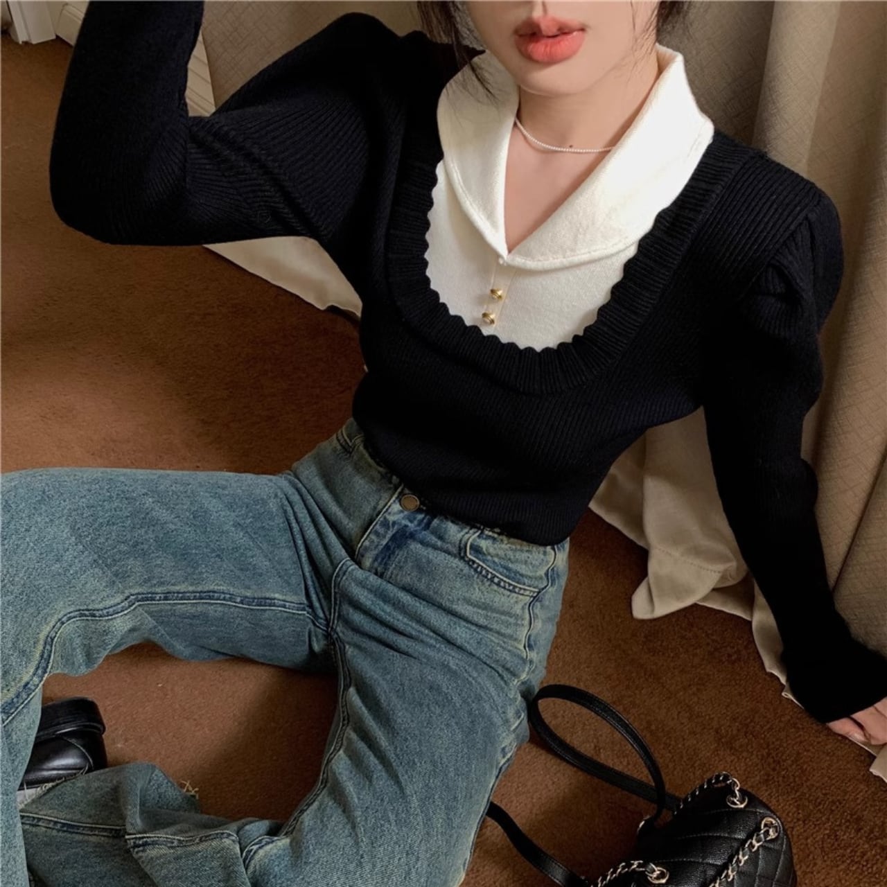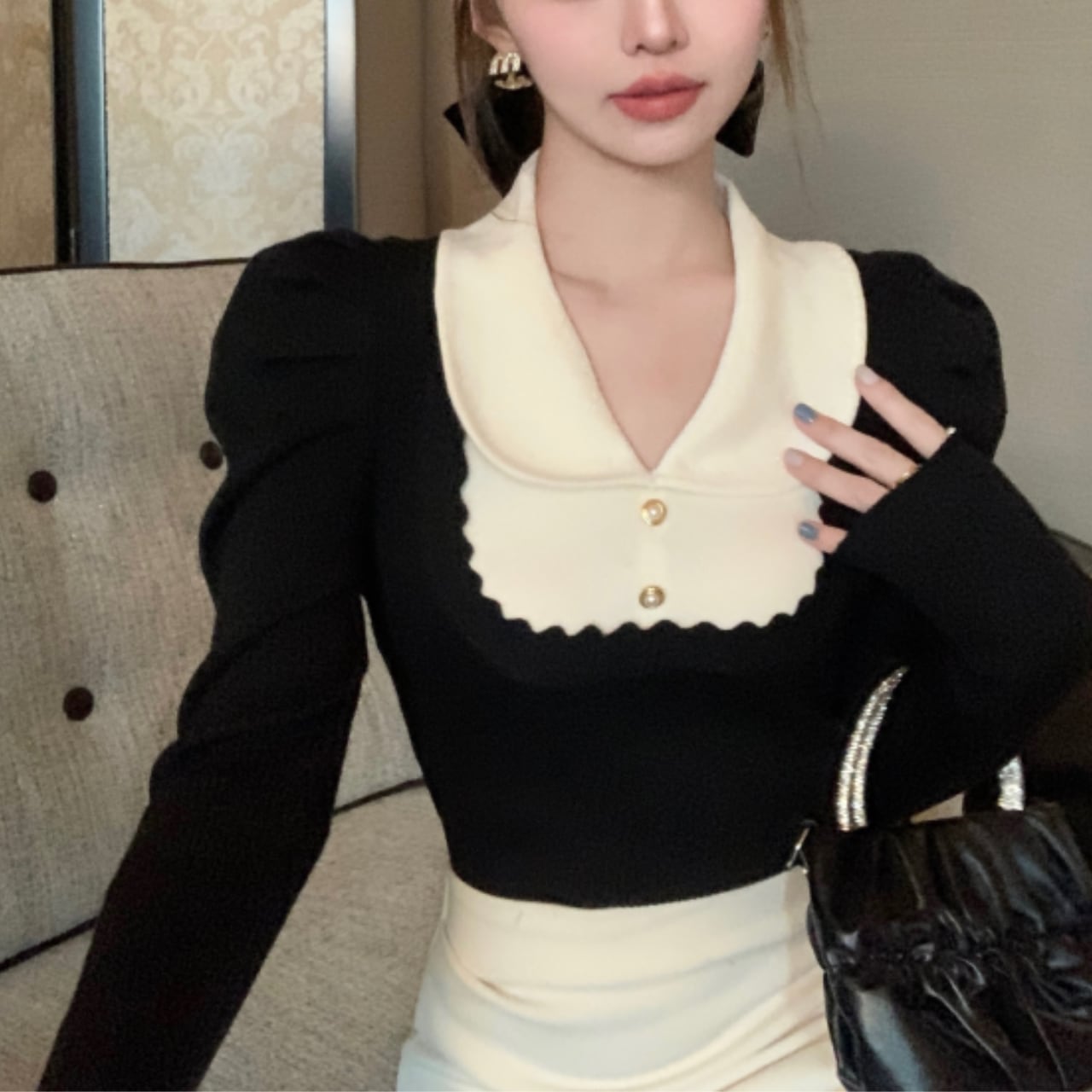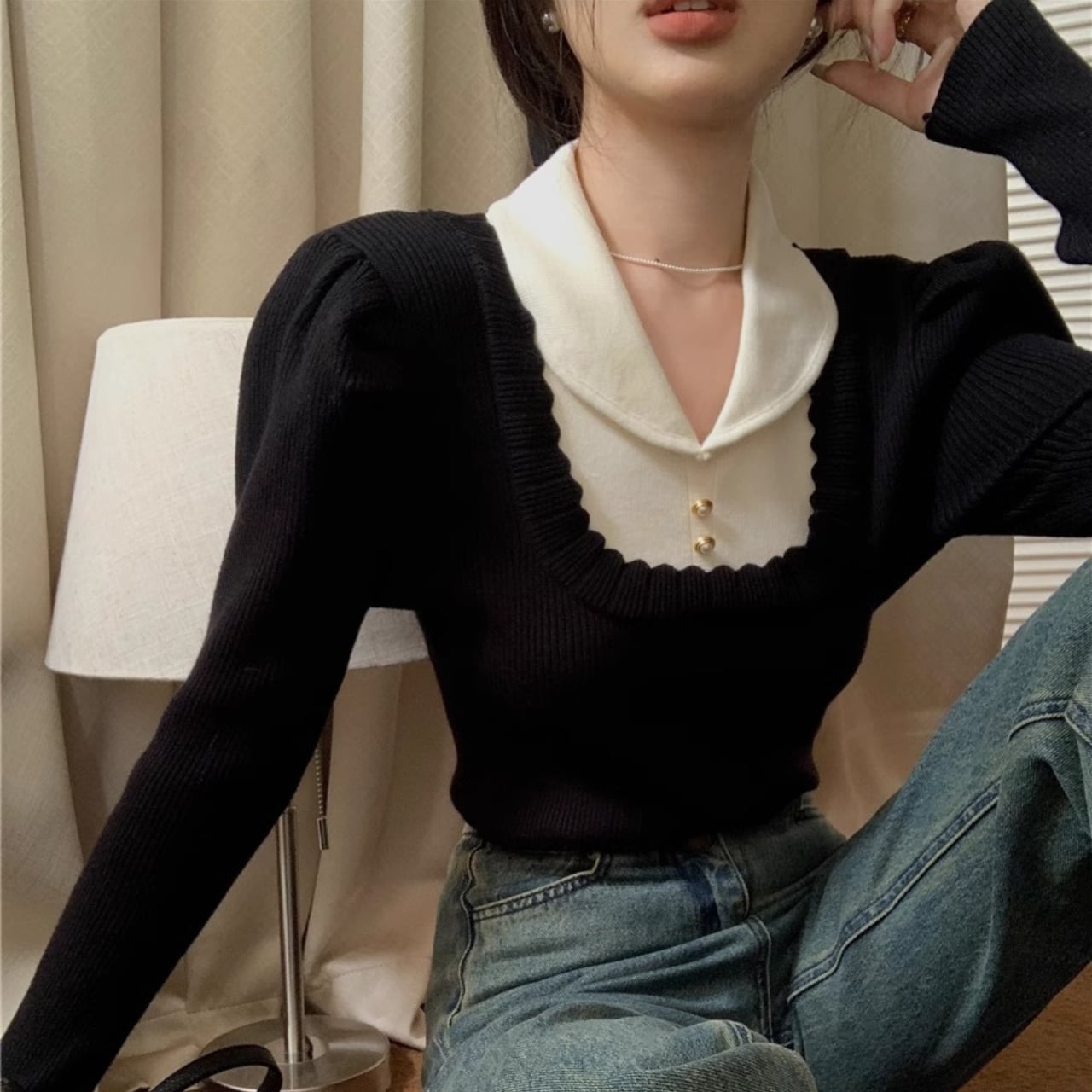 配色デザインとパフスリーブが、ただの黒ニットを特別にしてくれます。