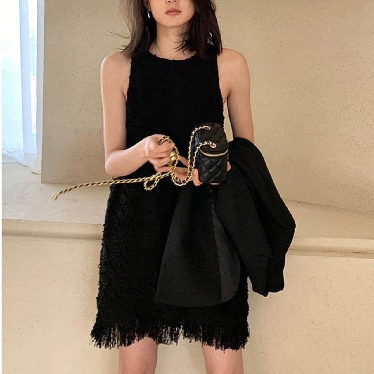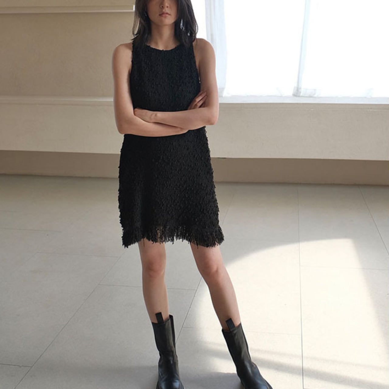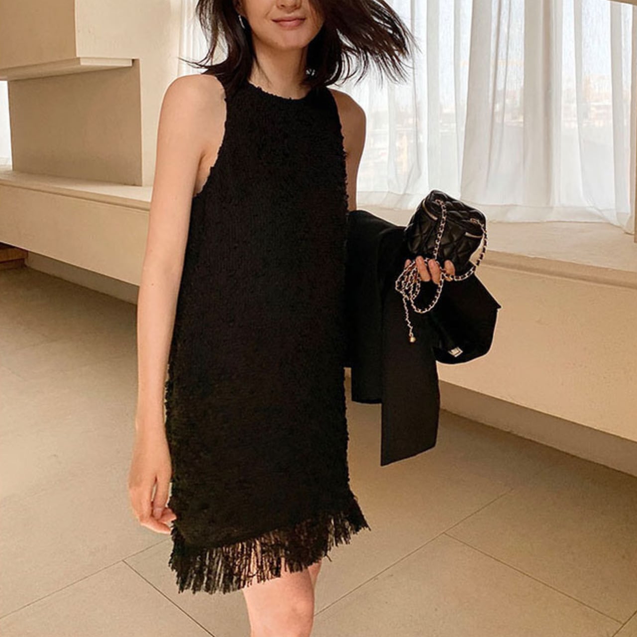 ・シンプルで魅力的なブラックのフリンジワンピースです。