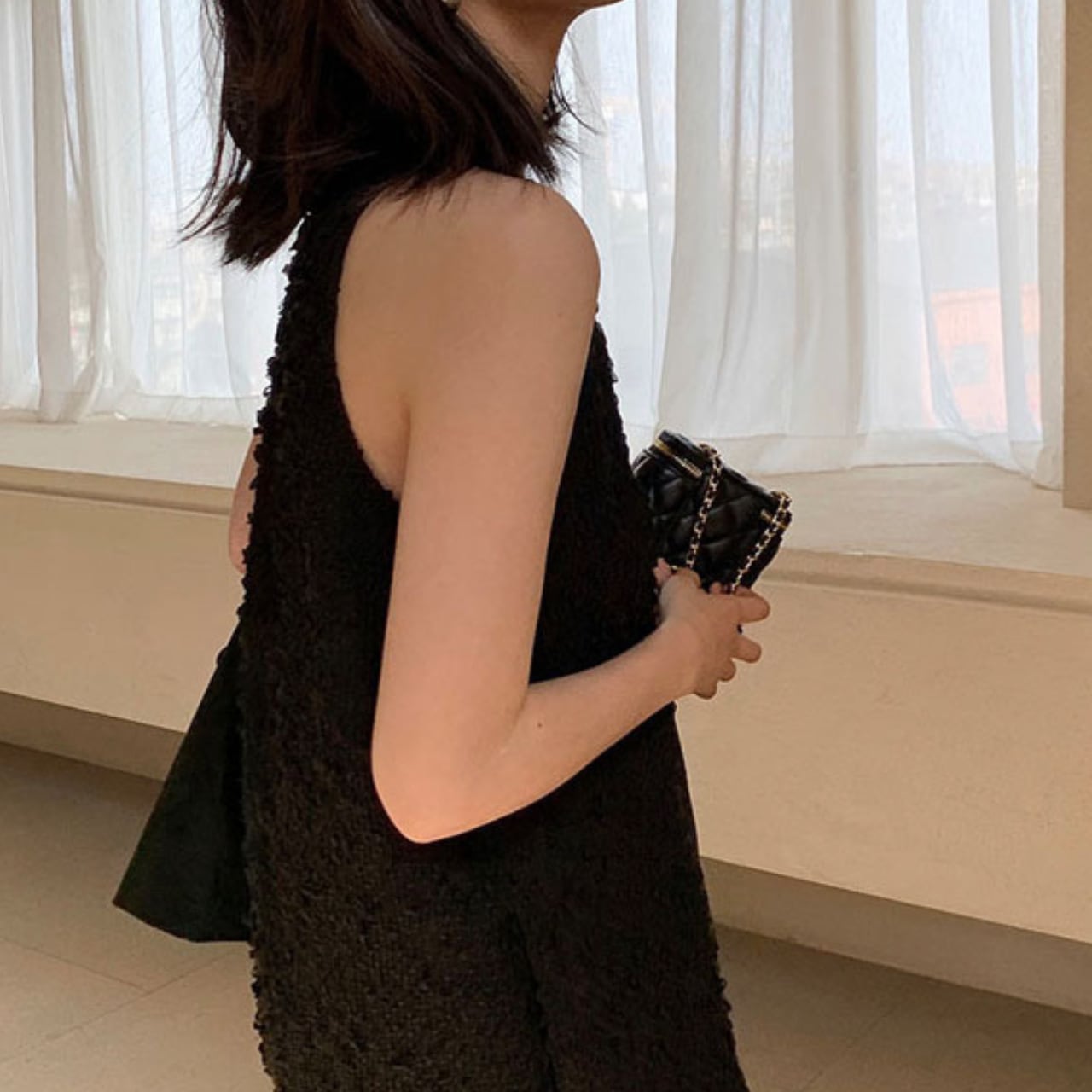 このフリンジワンピースは、華やかなフリンジが施されており、動くたびに軽やかに揺れるデザインが特徴です。ノースリーブのシルエットが女性らしさを強調し、特別な日やカジュアルなシーンにもぴったりの一着です。ミニ丈で足元をすっきりと見せ、さまざまなシューズと合わせることができるため、コーディネートの幅が広がります。さらに、ブラックカラーはどんなシーンでも活躍し、着るたびに気分を高めてくれるアイテムです。