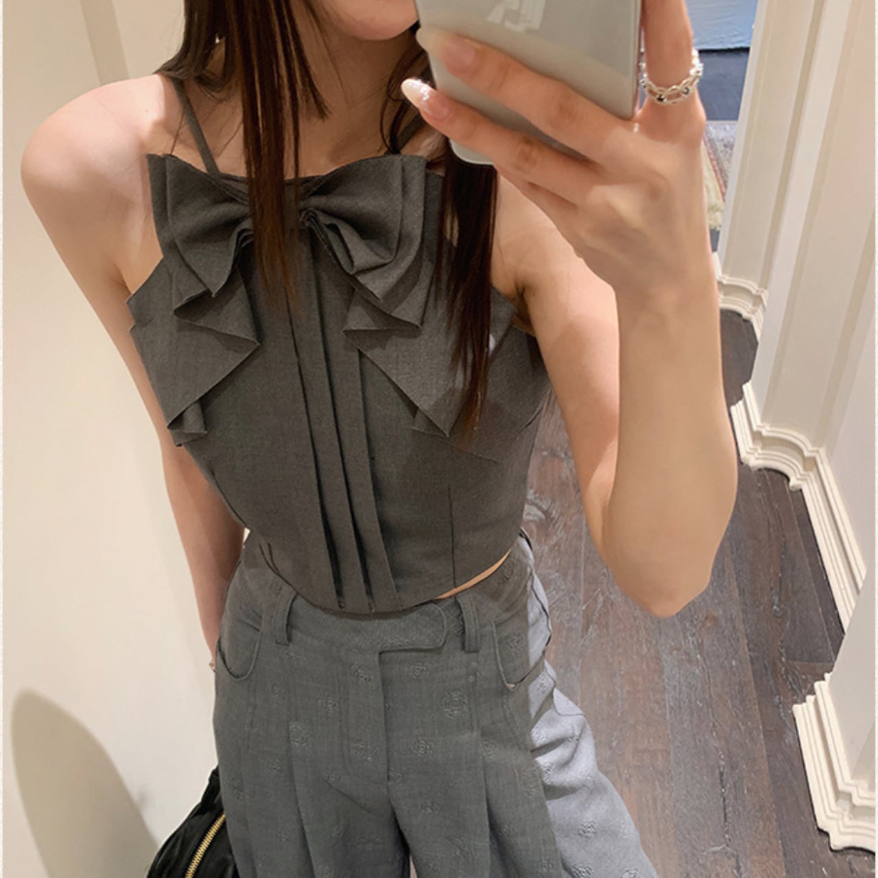 ・魅力的なビッグリボンがアクセントのキャミソール、洗練されたグレーの色合いで、SからLまでのサイズを揃えております。