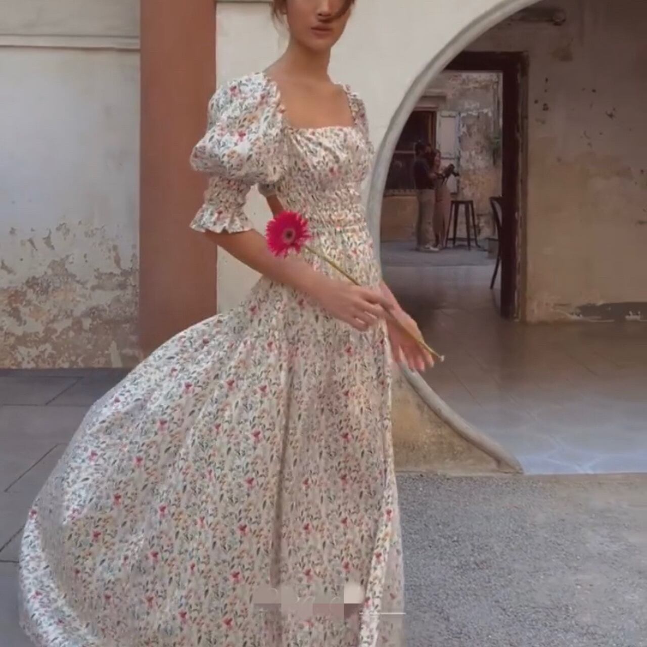 ・可憐な小花柄が魅力のマキシ丈ワンピース、柔らかな色合いで、SからLまでのサイズをご用意しております。