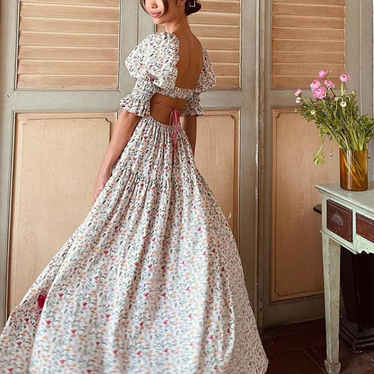 ・バックレスデザインとパフスリーブが女性らしさを引き立て、さまざまな体型にフィットするスタイリッシュなシルエットを実現しています。