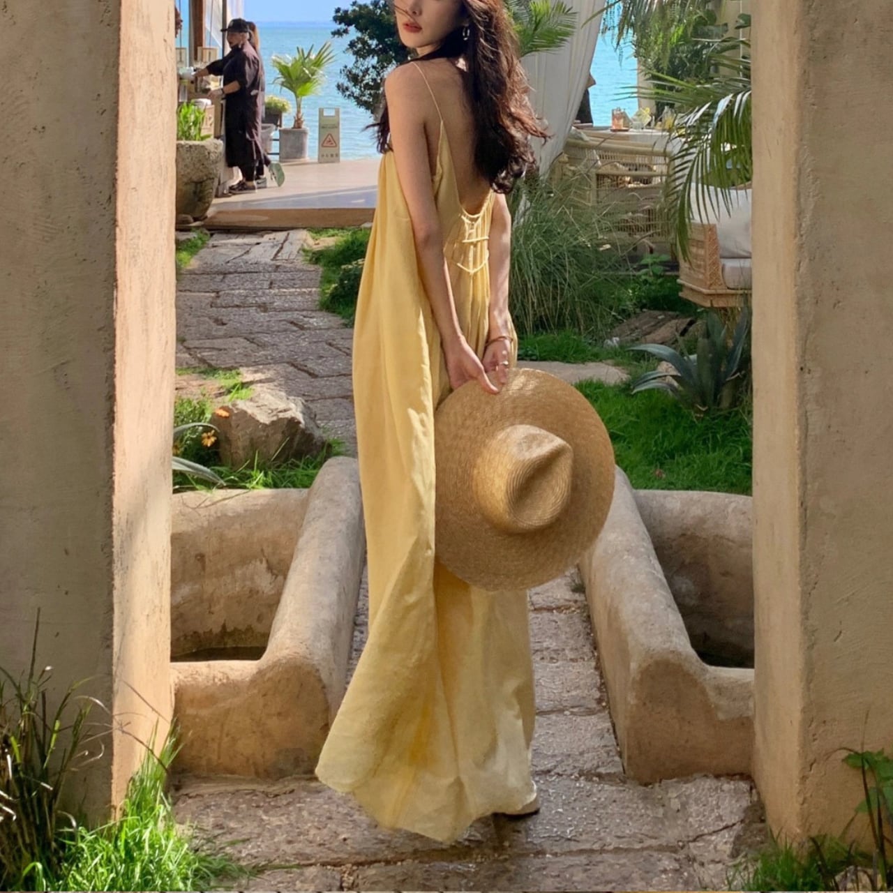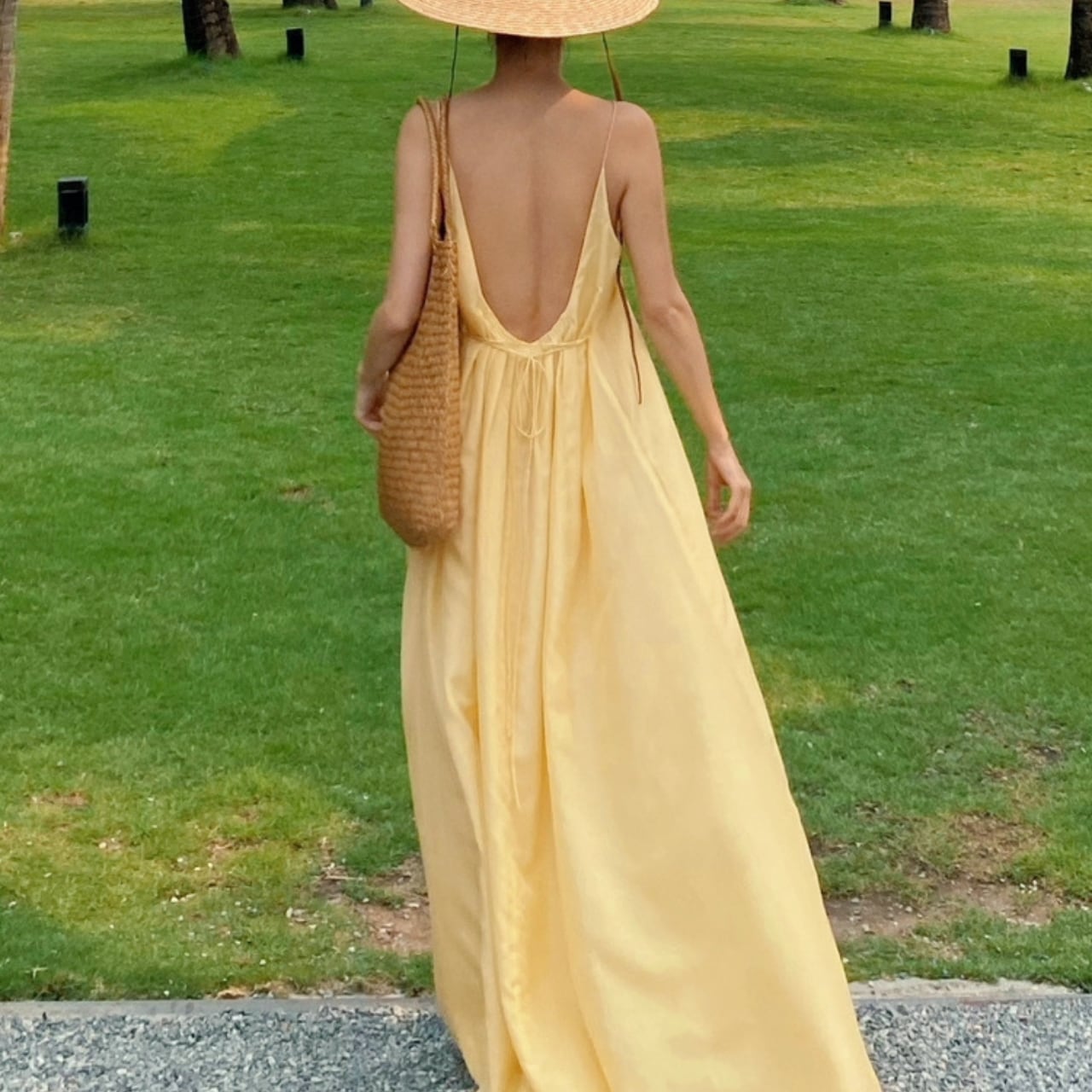 ・鮮やかなイエローが魅力的なバックレスデザインのマキシ丈ワンピース、SからLまでのサイズをご用意しております。