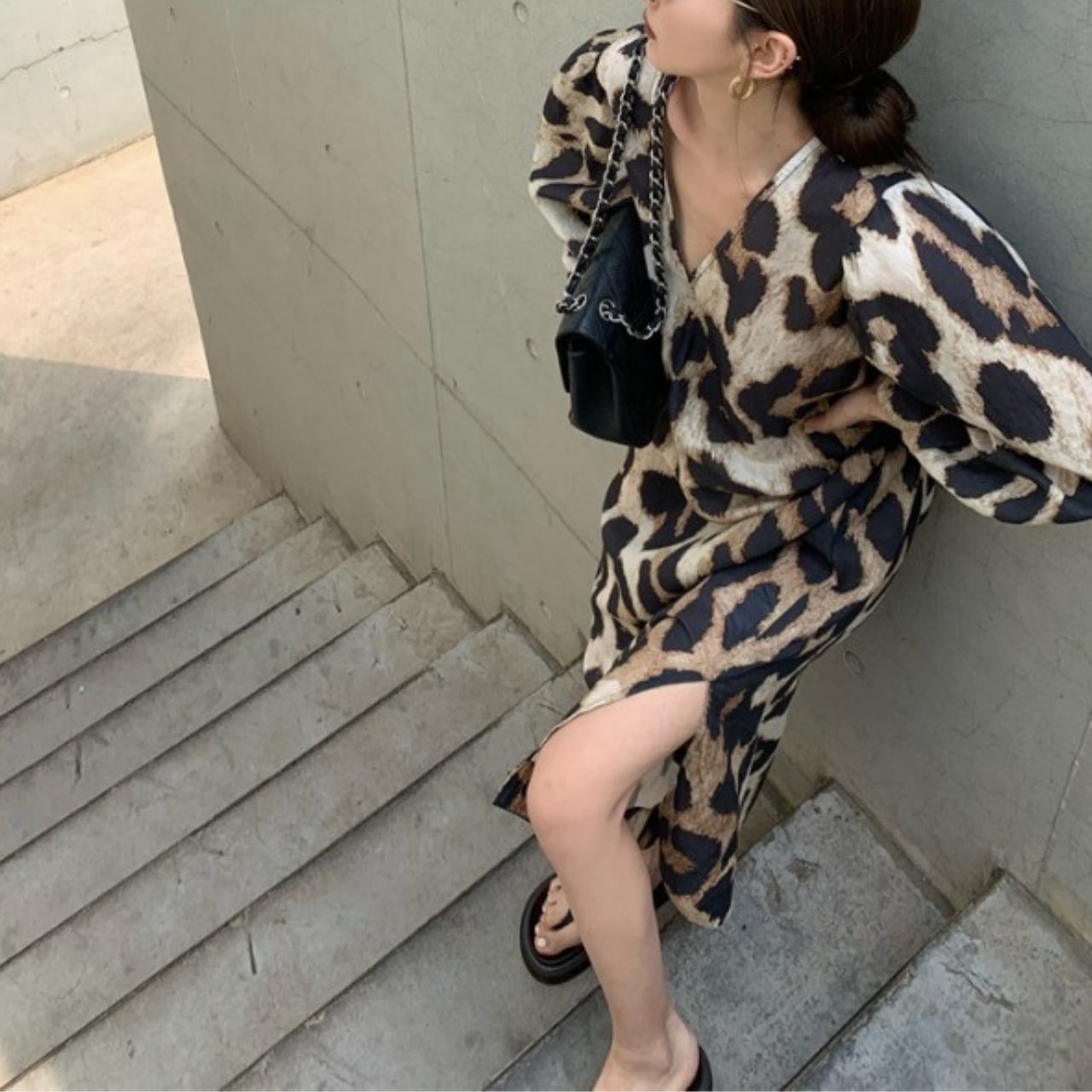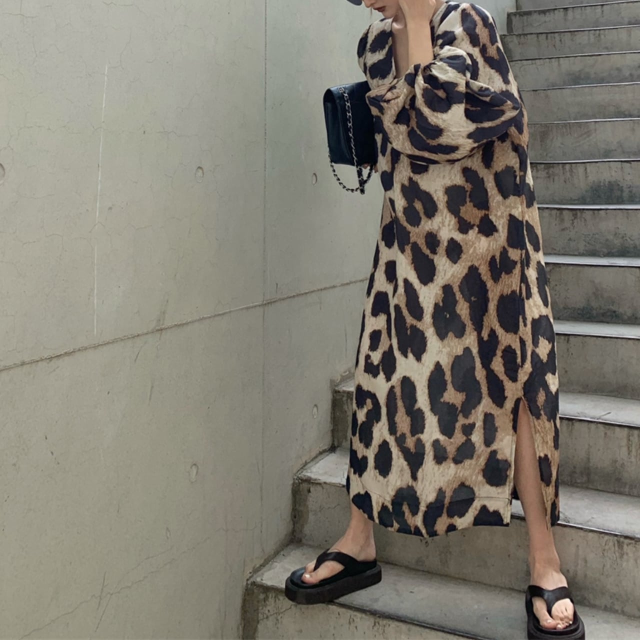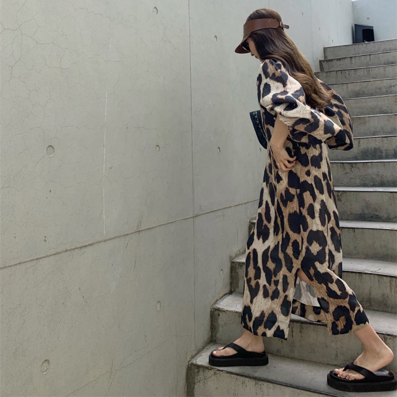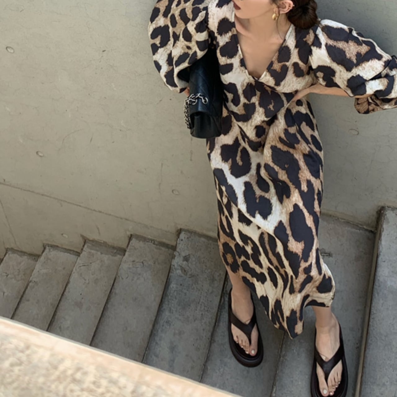 大人の抜け感レオパード|Vネック カフタンロングワンピース(体型カバー/マキシ丈)