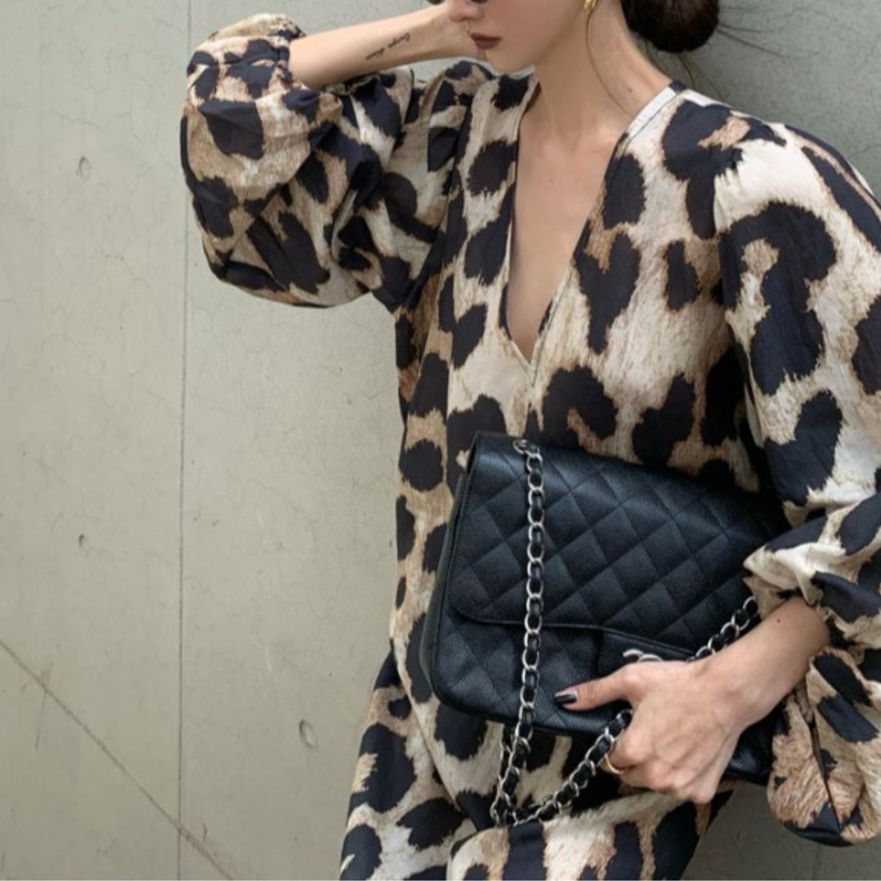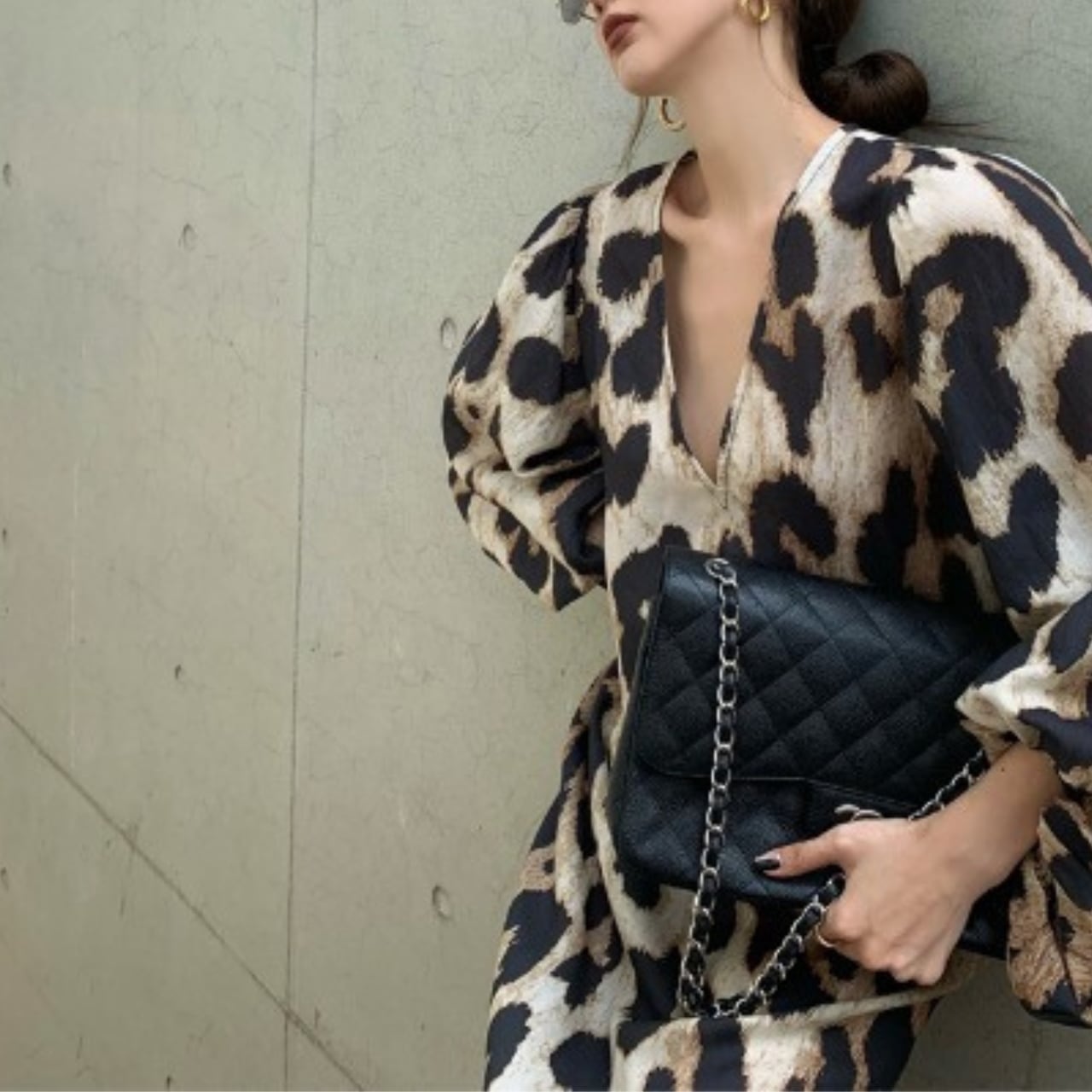 大柄レオパードが主役級の存在感。合わせるのはシンプルな小物だけでOK。