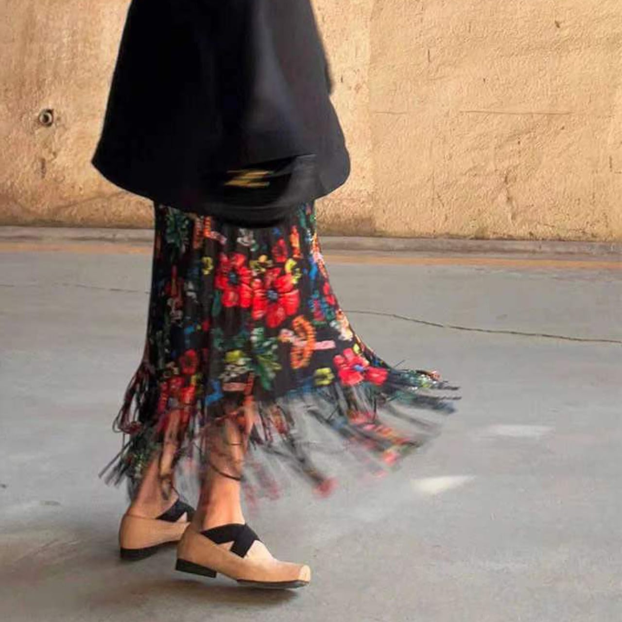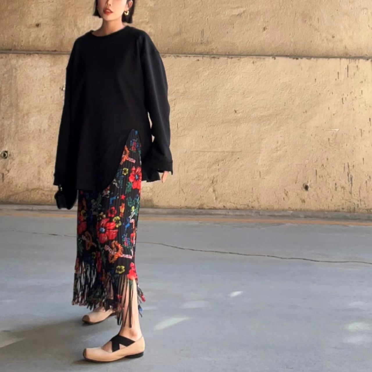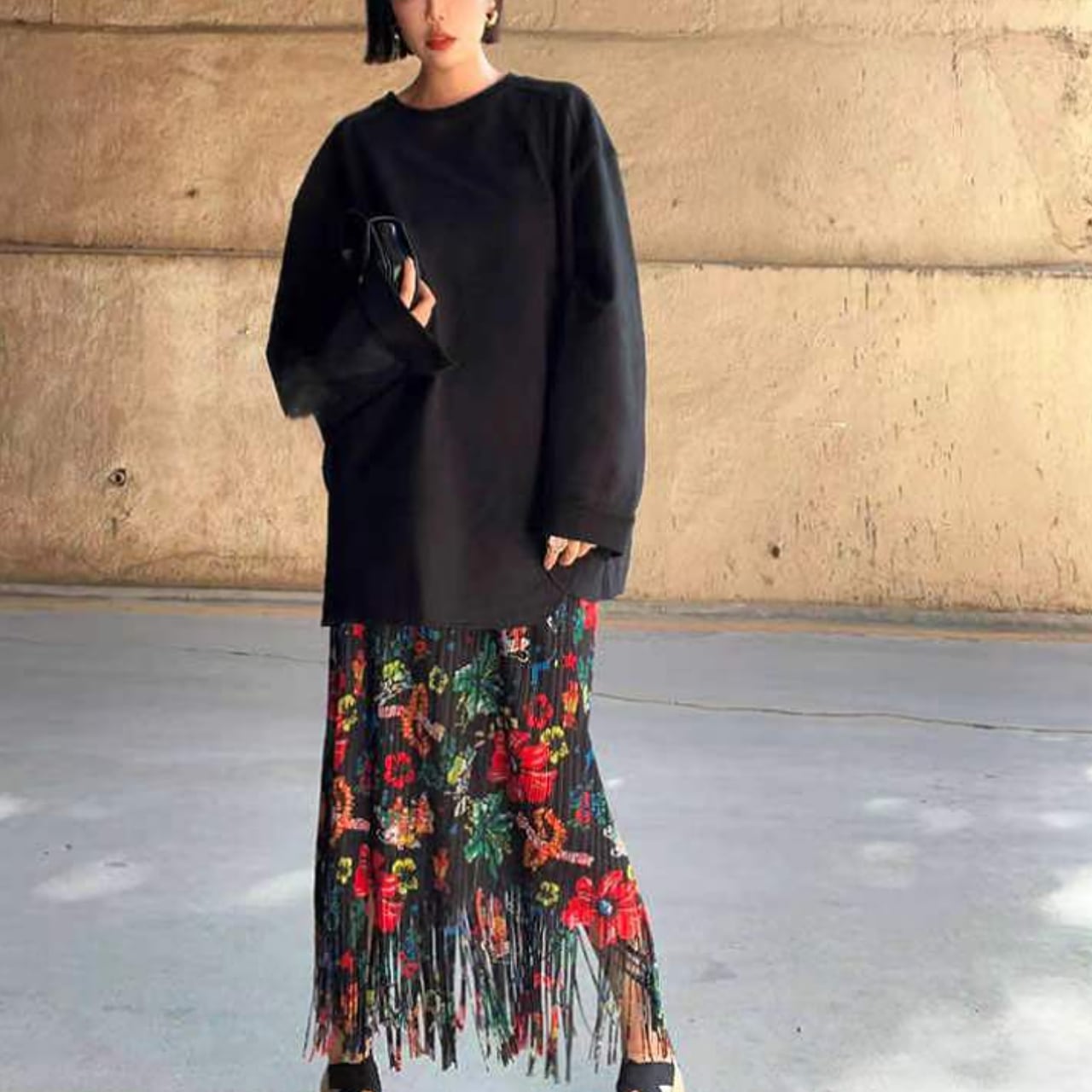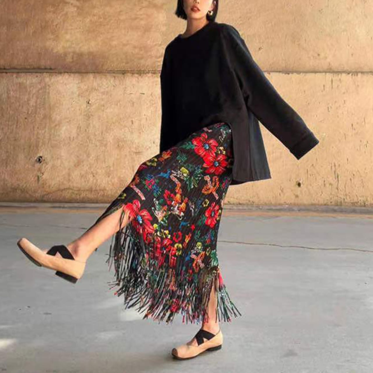 この花柄フリンジスカートは、日常のコーディネートに華を添えるアイテムです。色とりどりの花柄が目を引き、フリンジが足元を軽やかに演出します。カジュアルなお出かけはもちろん、友人とのランチやパーティーなど特別なシーンでも輝きを放つこと間違いなしです。シンプルなトップスと合わせることで、スタイリッシュに魅力を引き立てるコーディネートが楽しめます。