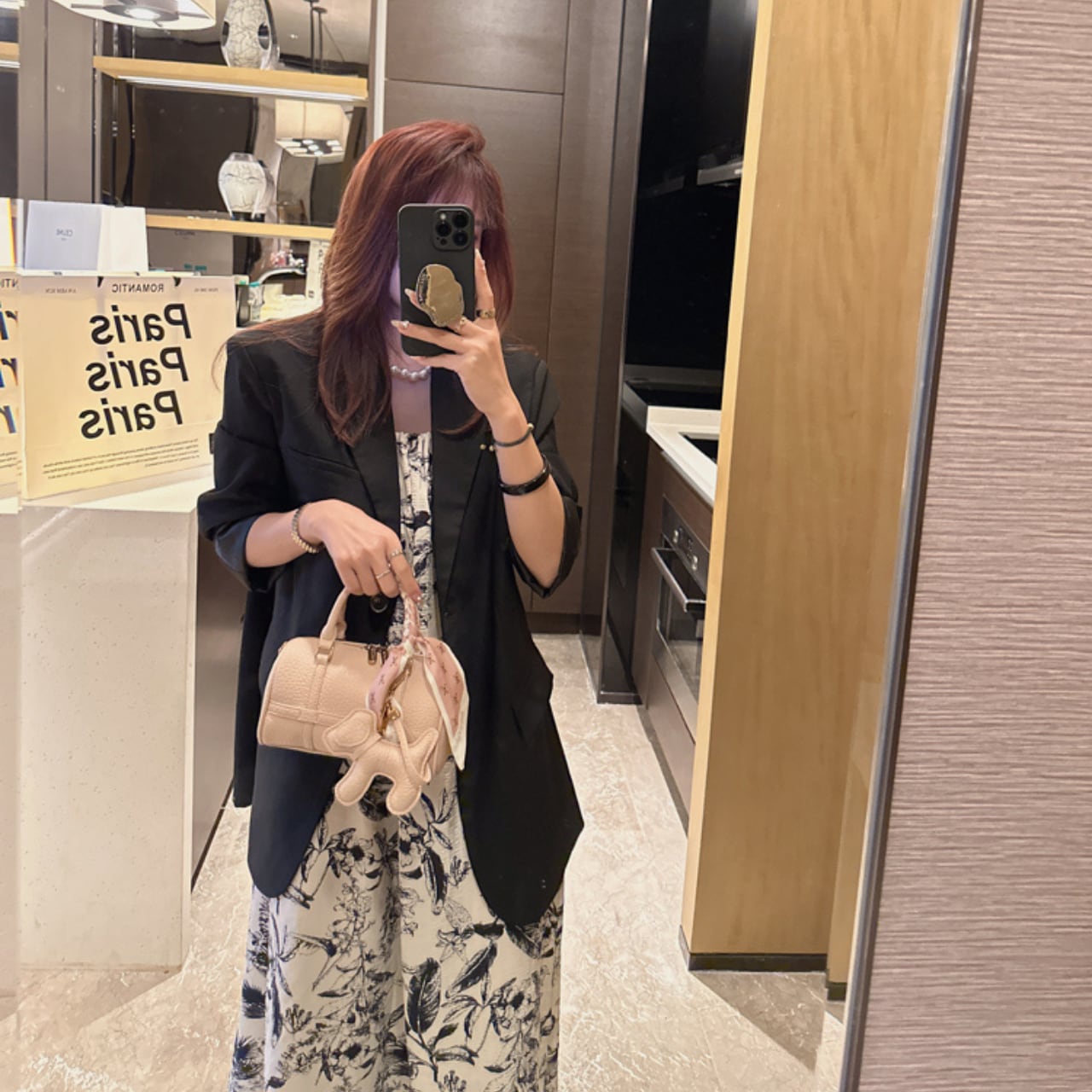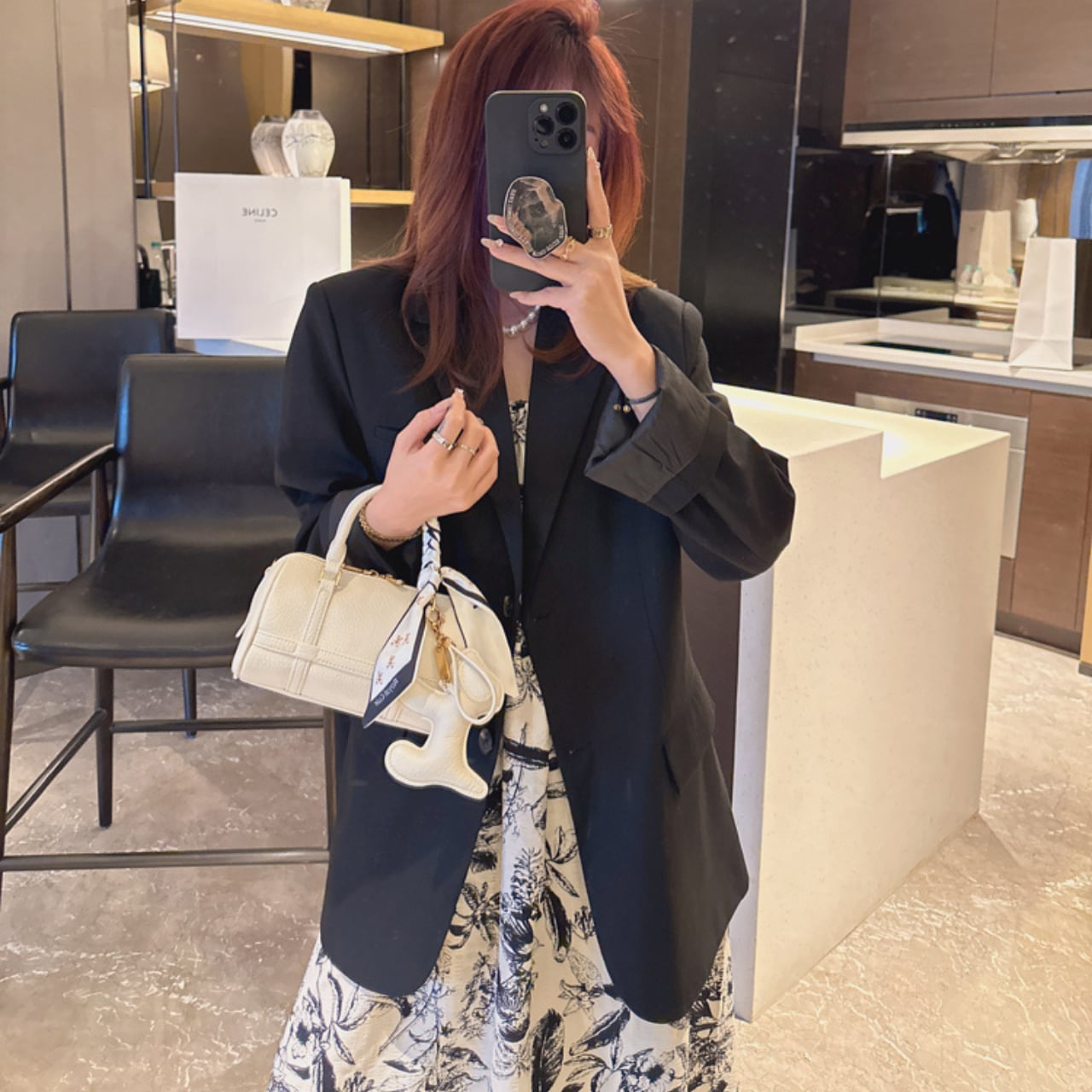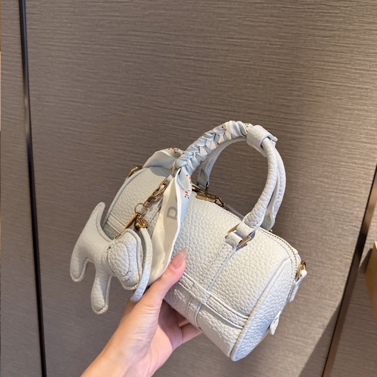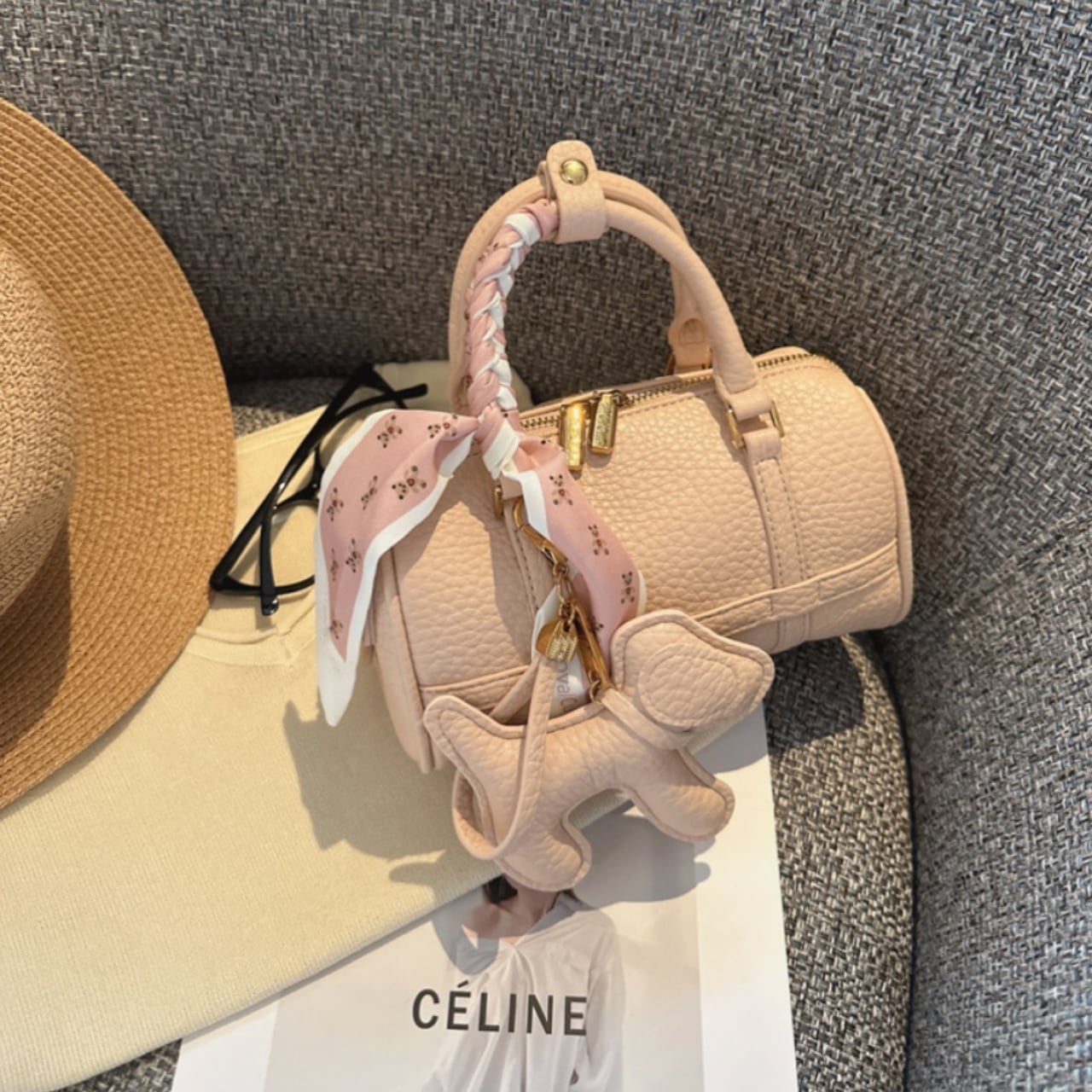 このミニボストンバッグは、コンパクトながらもしっかりとした収納力が魅力です。デイリー使いはもちろん、小旅行やお出かけにもピッタリ。スカーフをアクセントにしてスタイリングを楽しむことができるので、さまざまなシーンで活躍します。犬のキーホルダーは愛らしいポイントで、バッグを持つ喜びを倍増させてくれます。自分だけのスタイルを見つけて、ファッションの楽しさを感じてください。