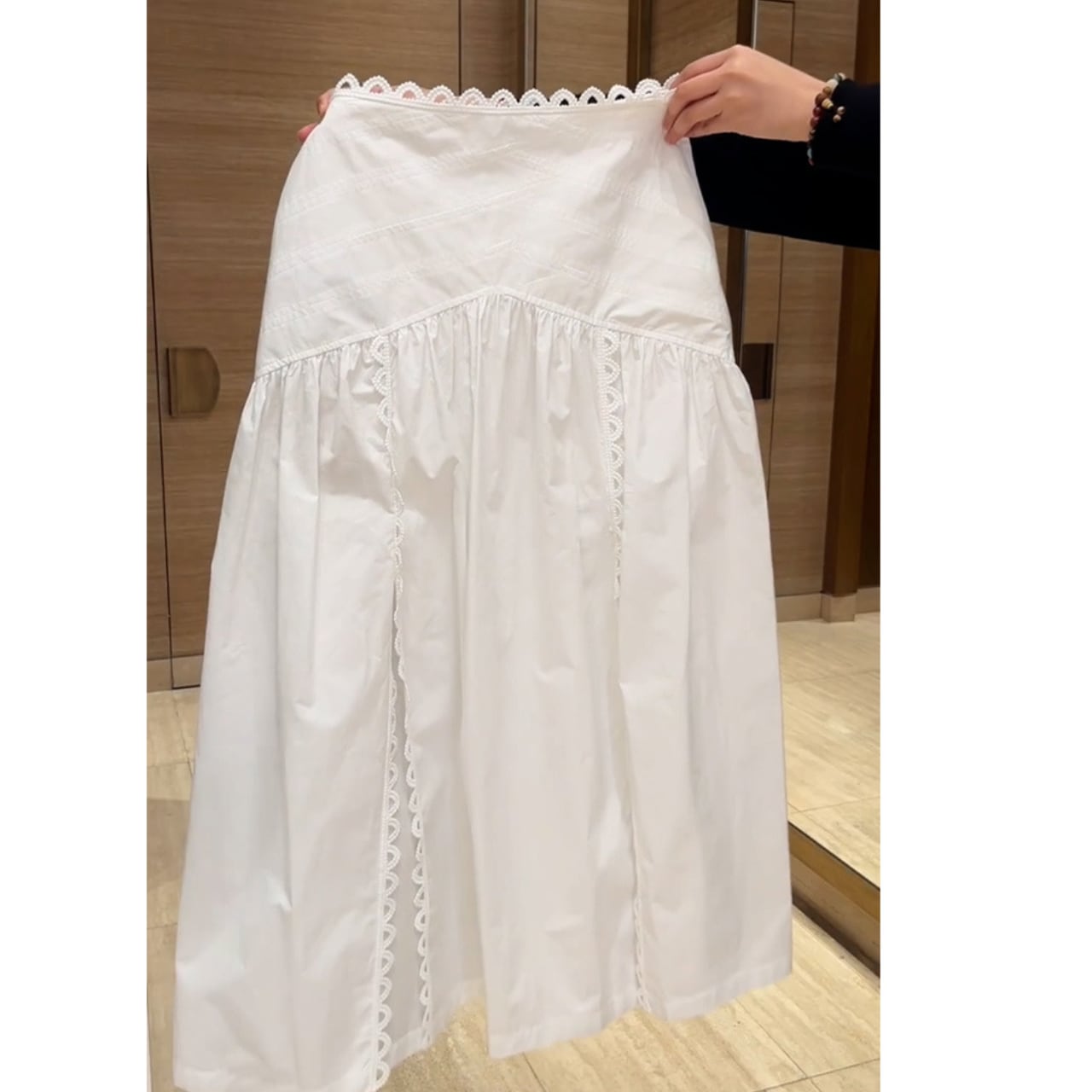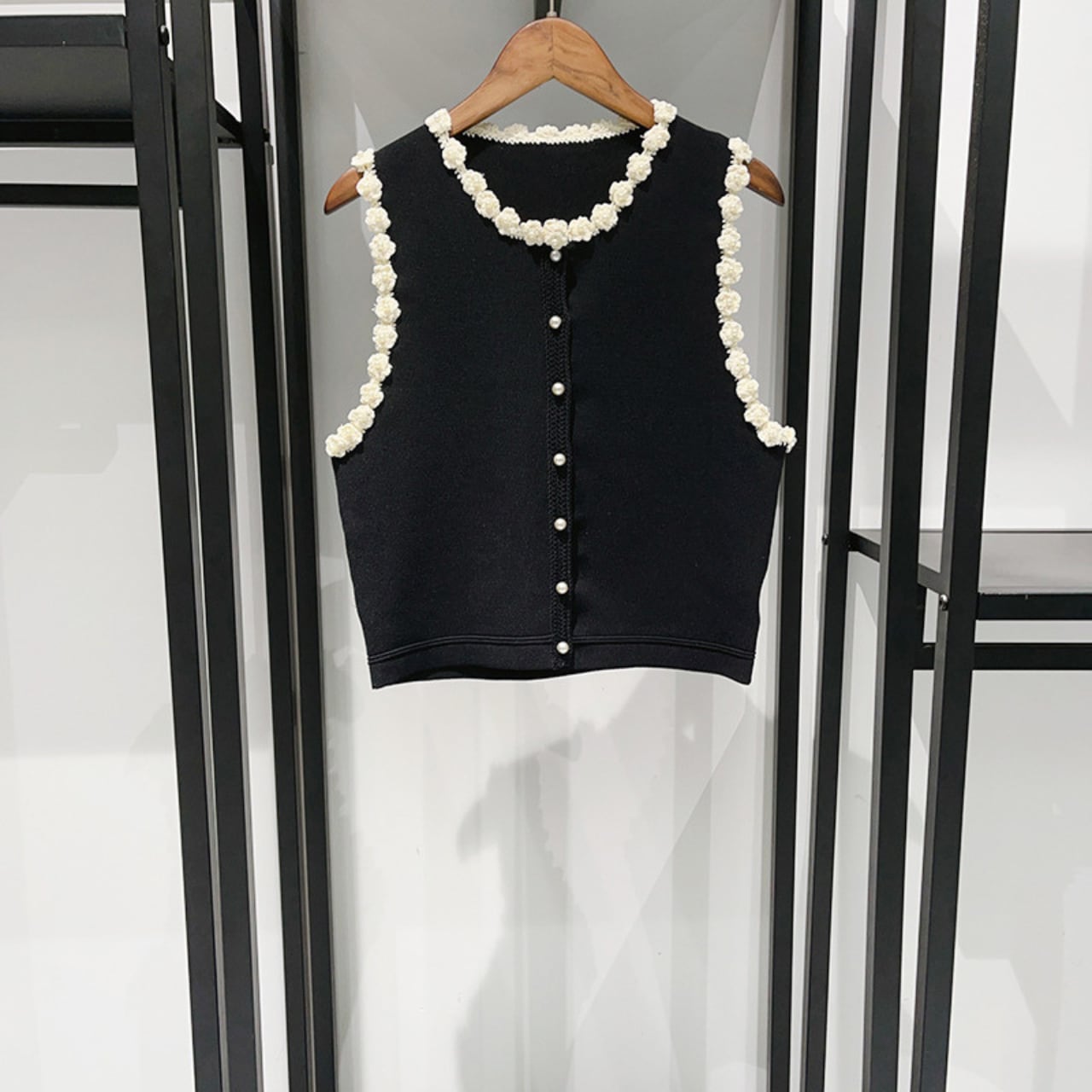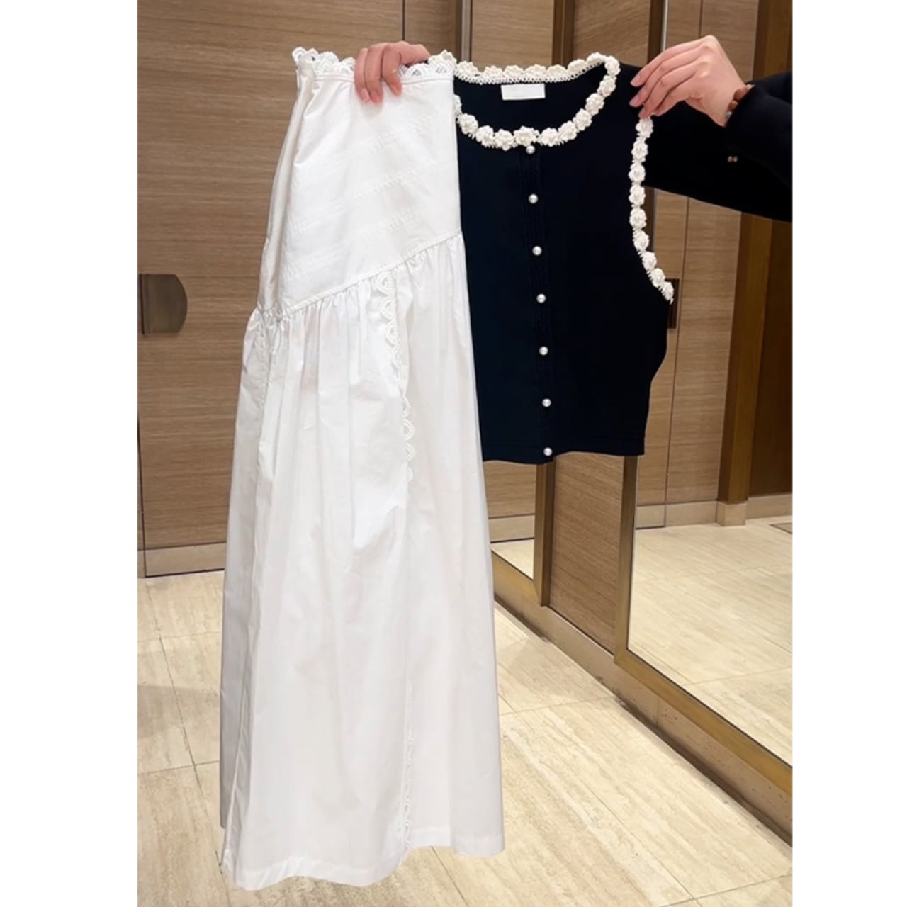 ・華やかなフラワークロシェブラックベストと爽やかなホワイトスカートのセットアップ。
