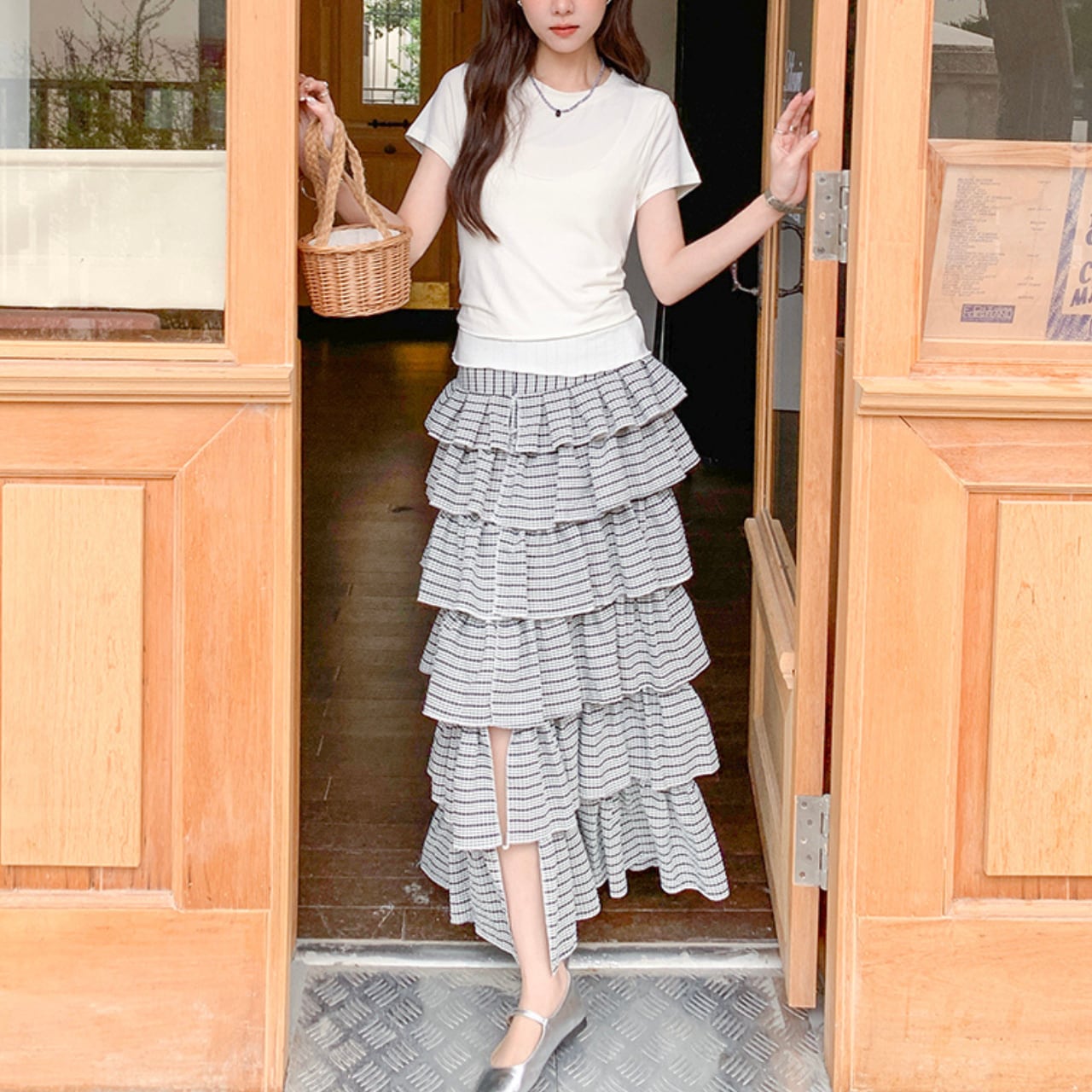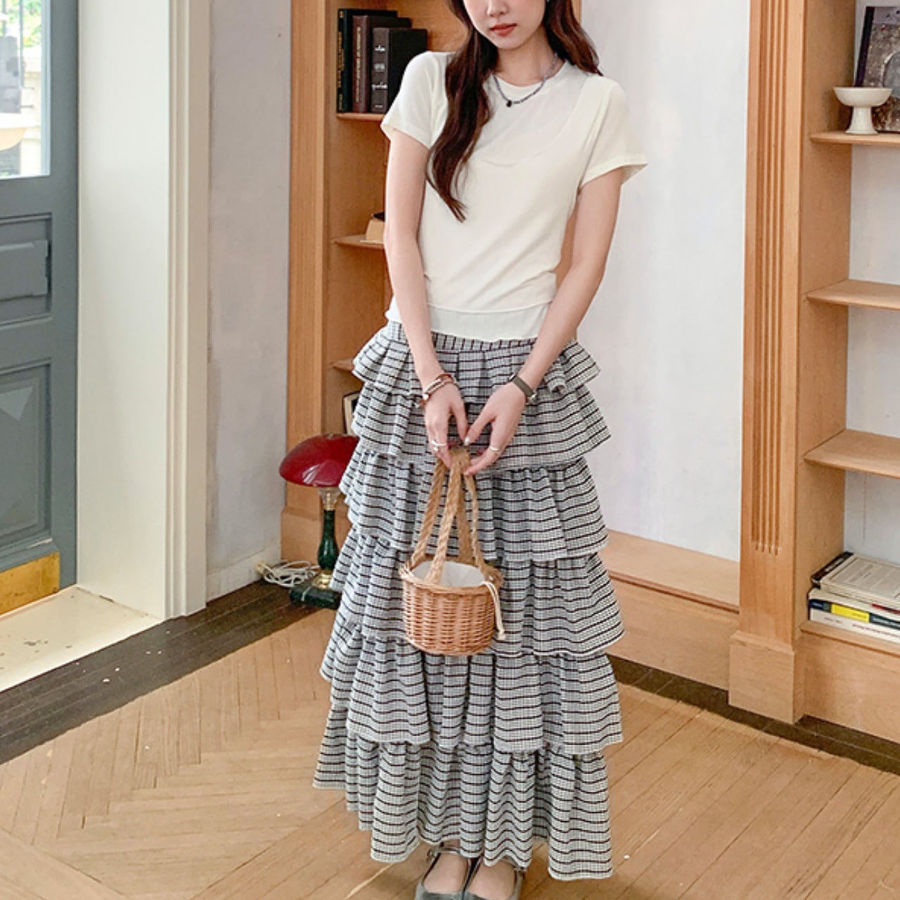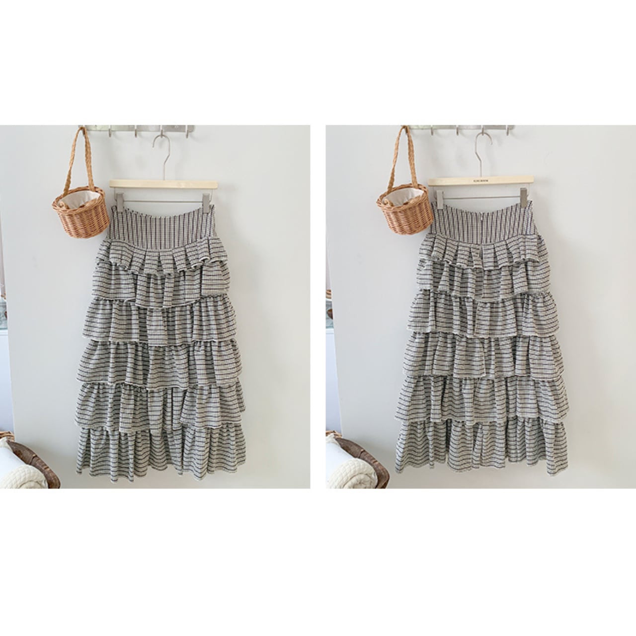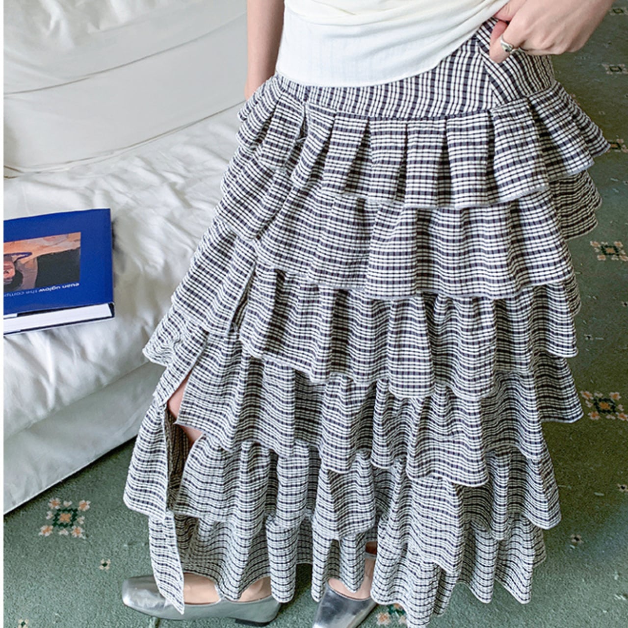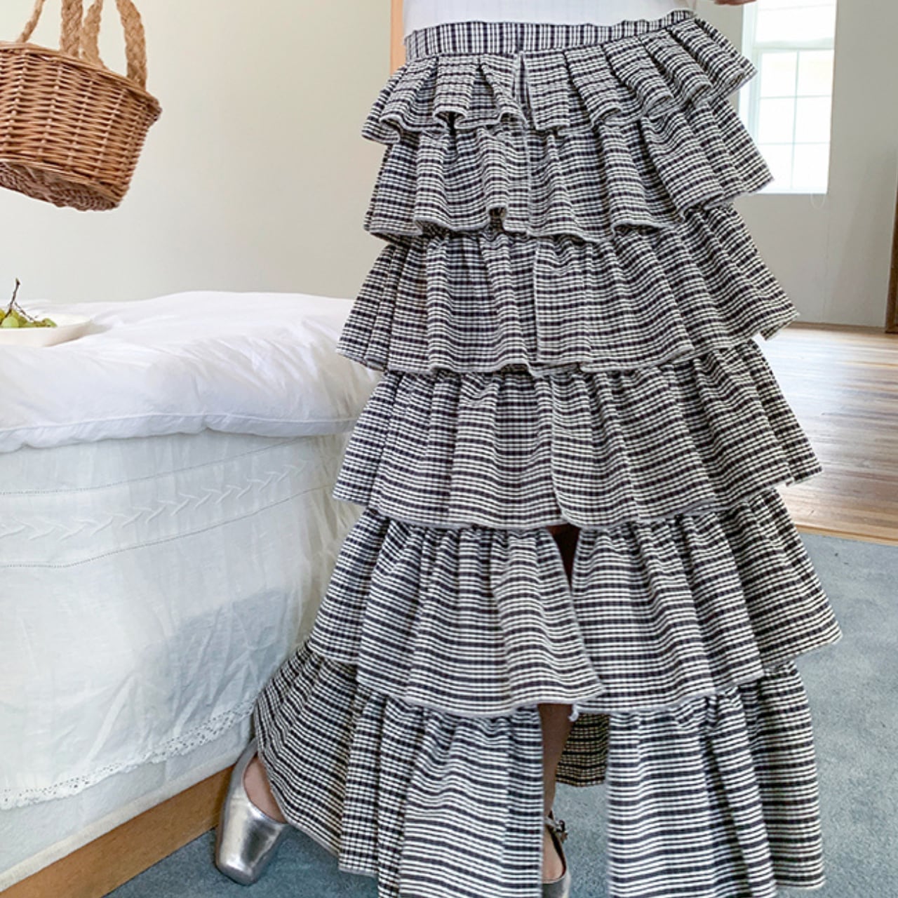 ・クラシカルなチェック柄とフリルデザインが魅力のロングスカート。
