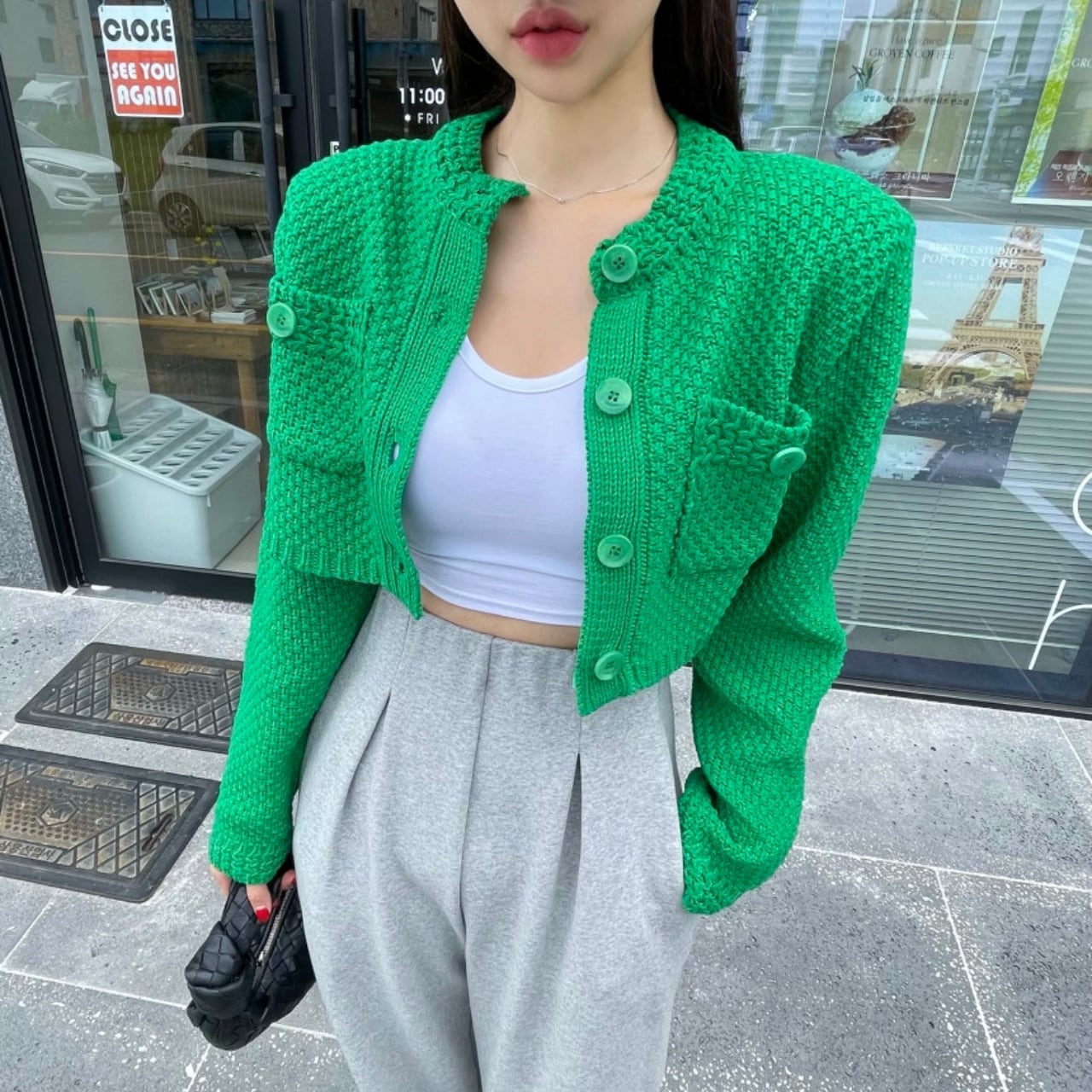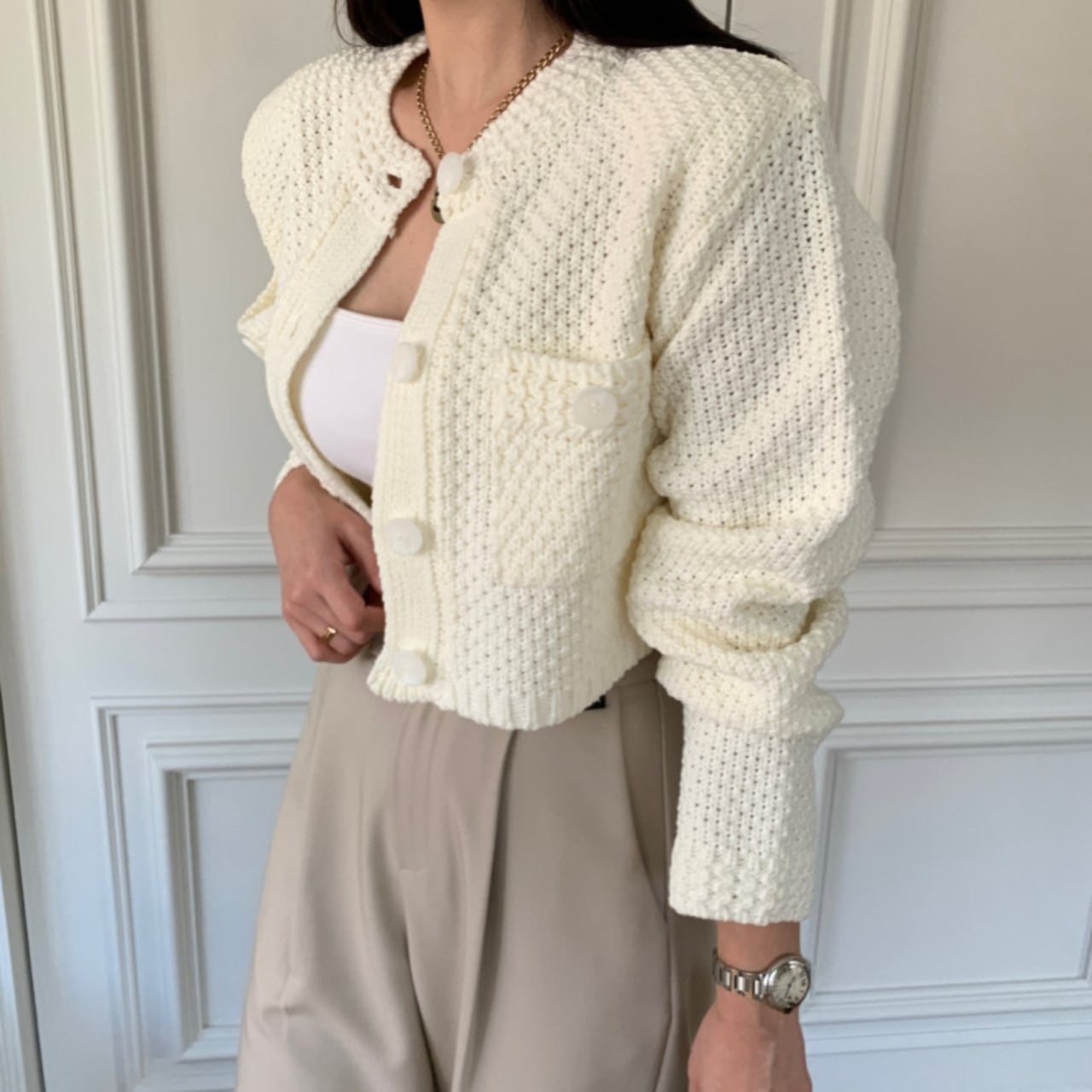 ・春秋にぴったりなクロップド丈のニットカーディガン。