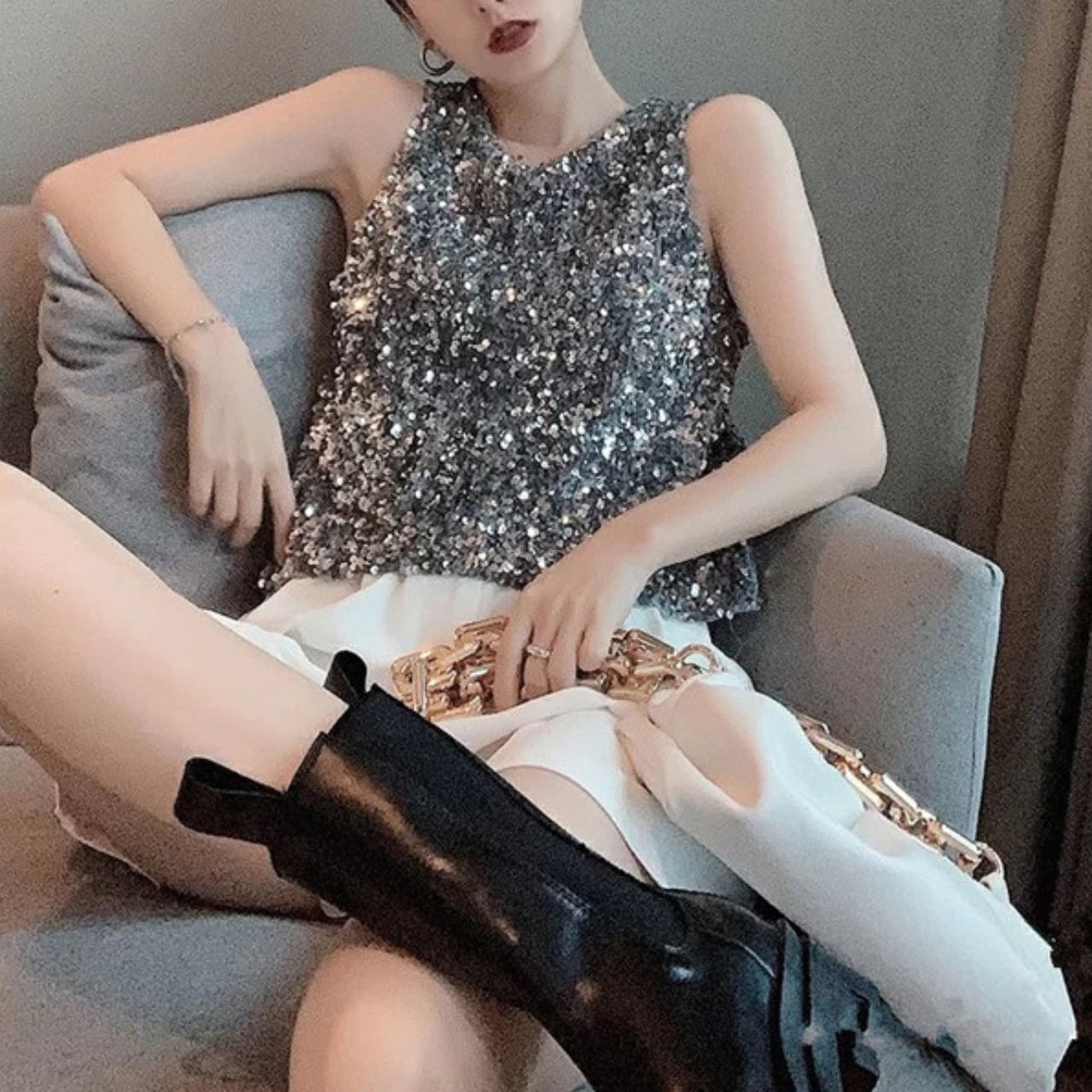 輝くスパンコールデザインのノースリーブトップス