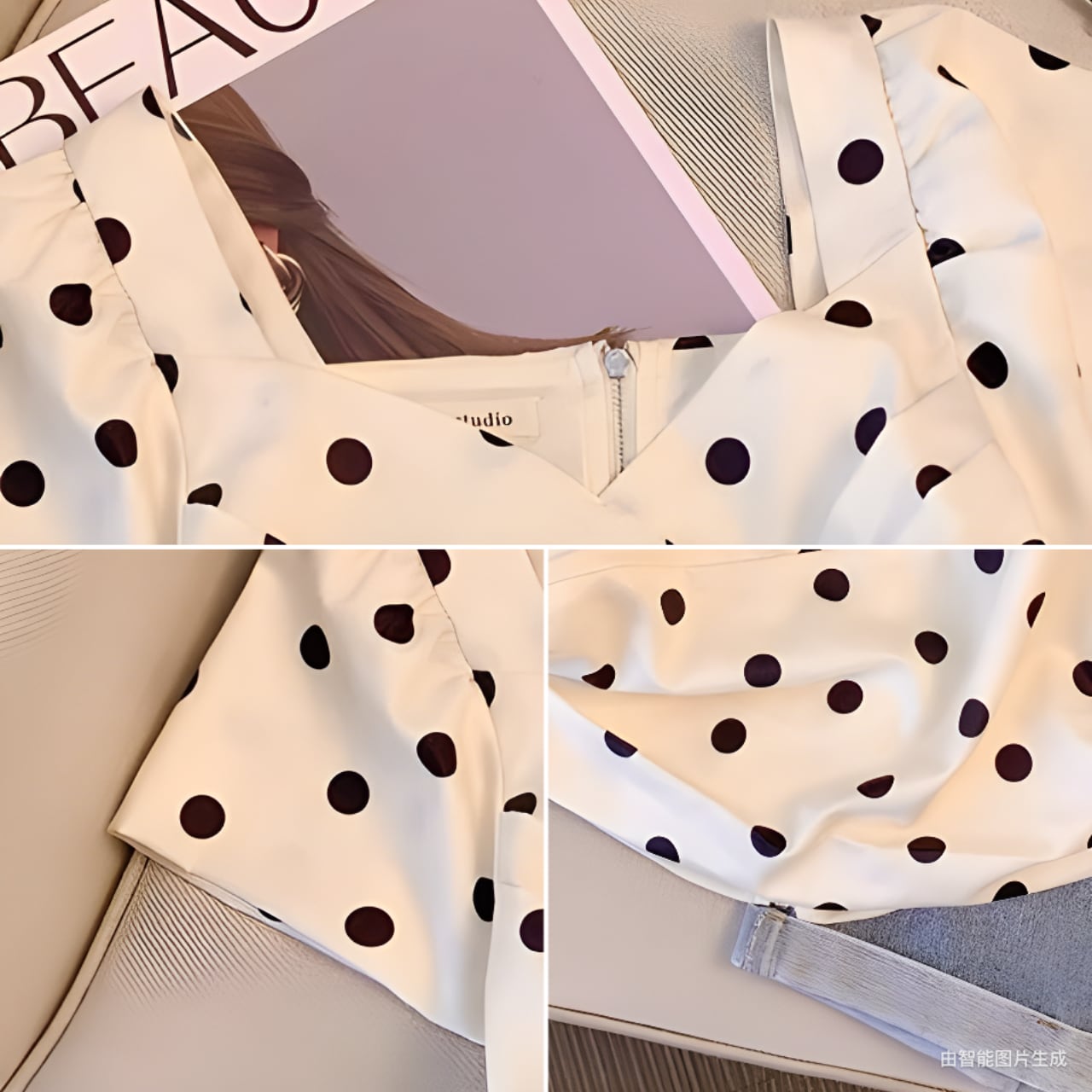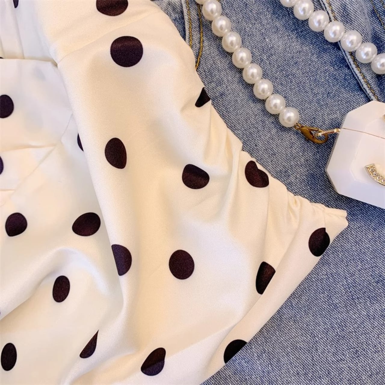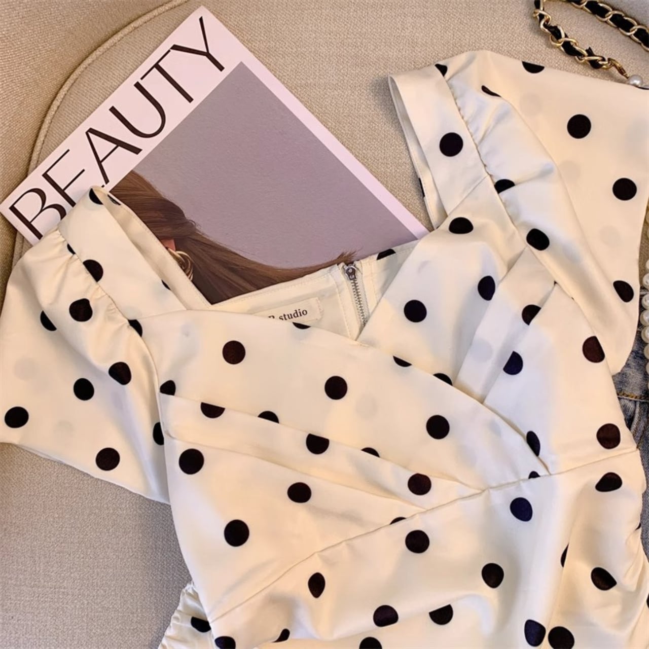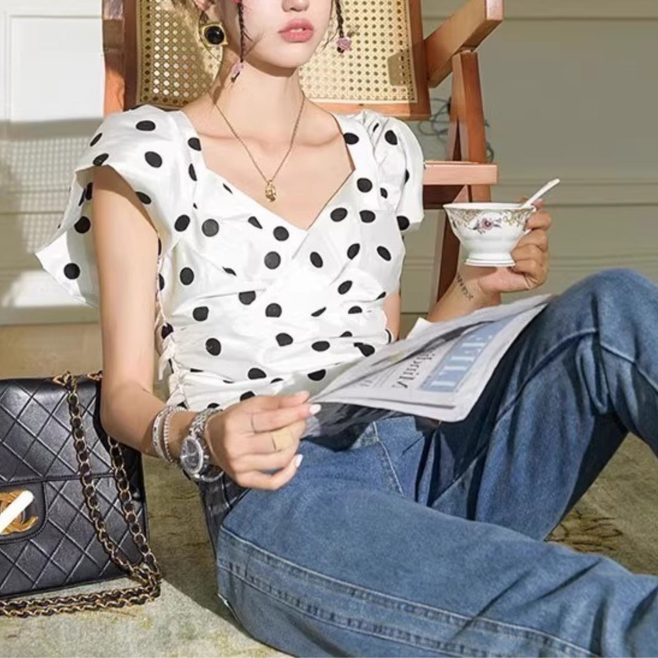 ・可愛らしいドット柄が特徴のカシュクールトップスです。