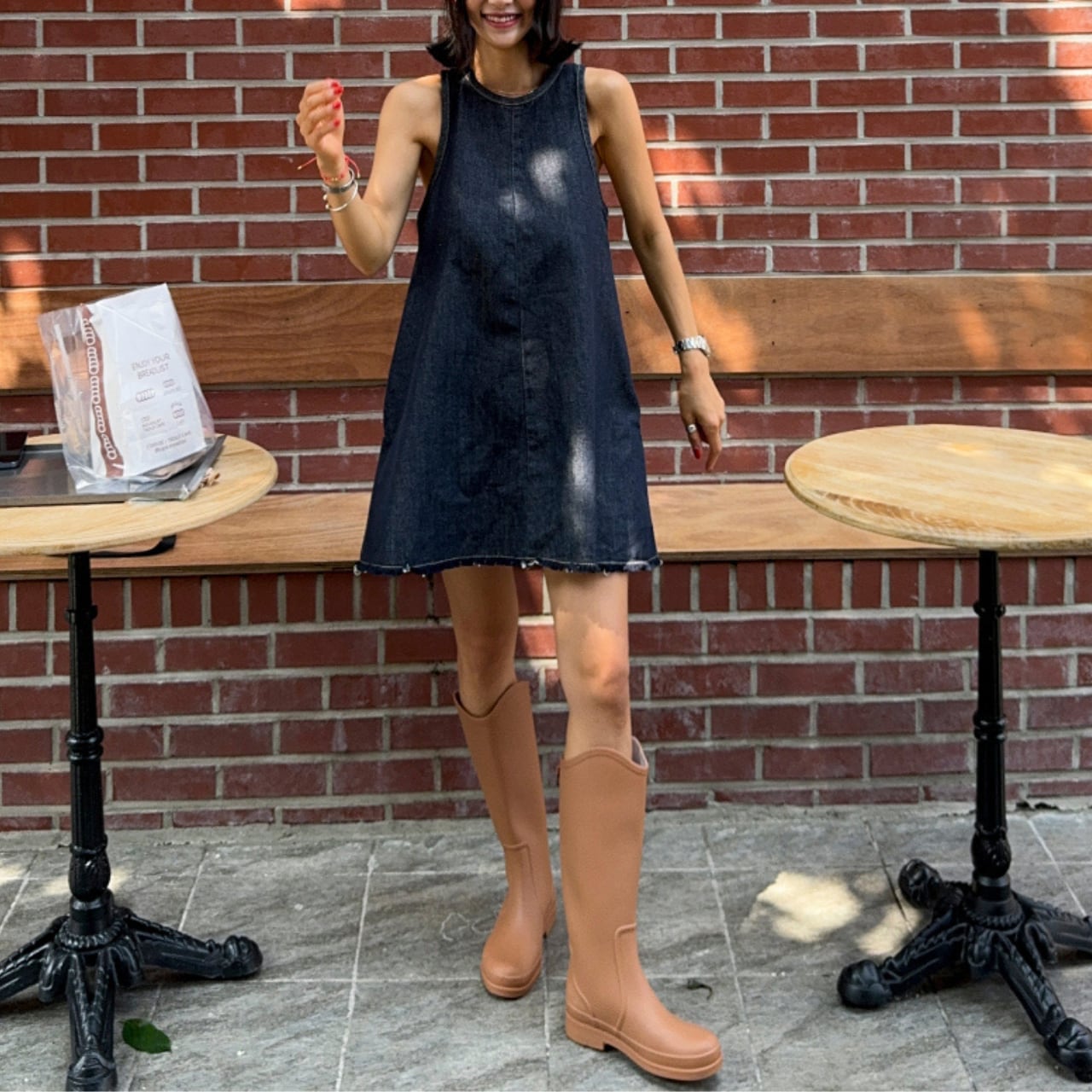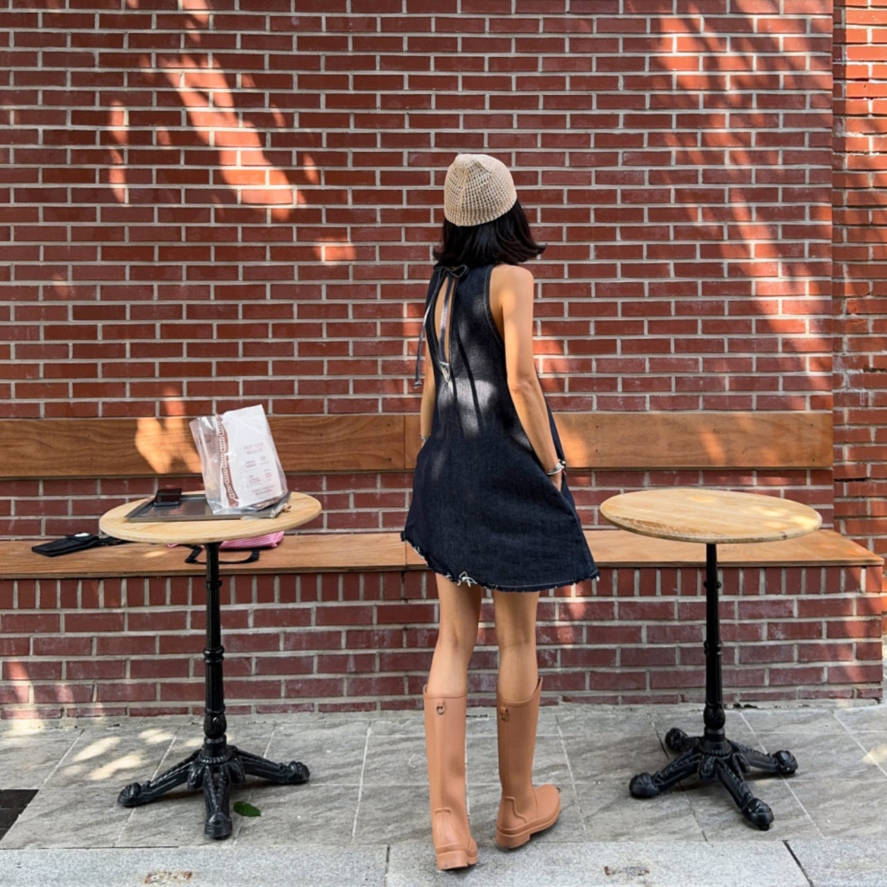 洗練されたバックレスデザインで抜け感を演出するデニムワンピース