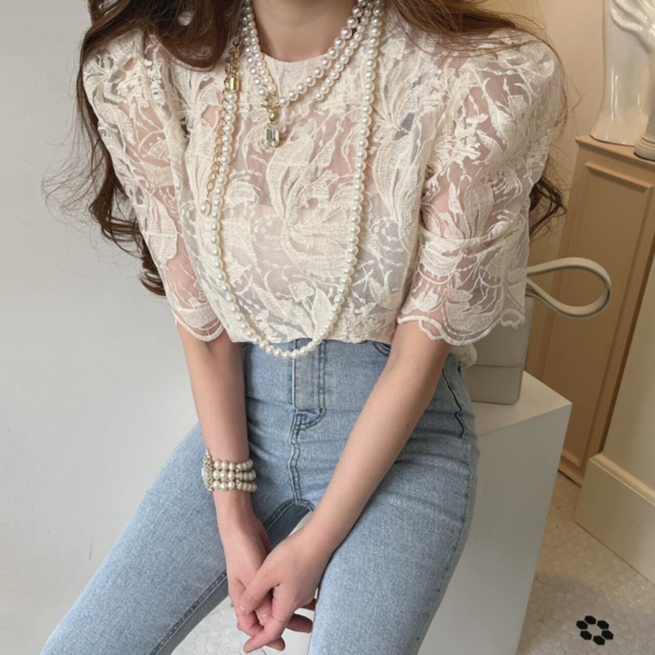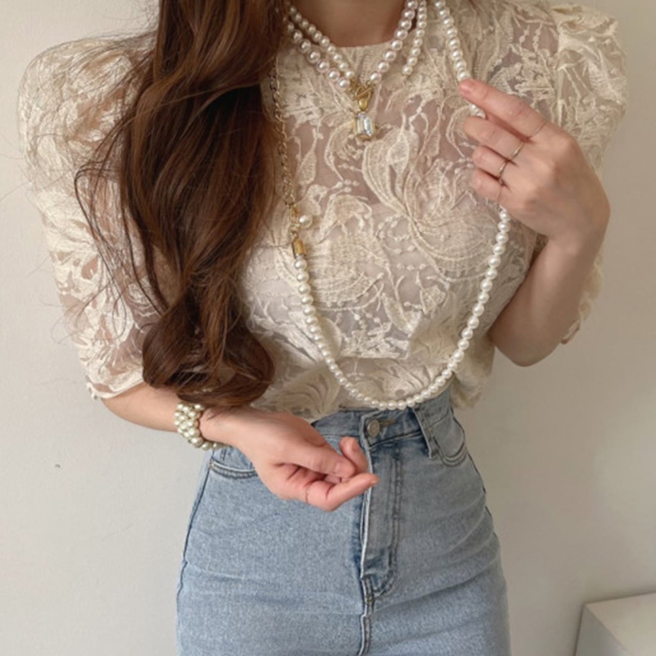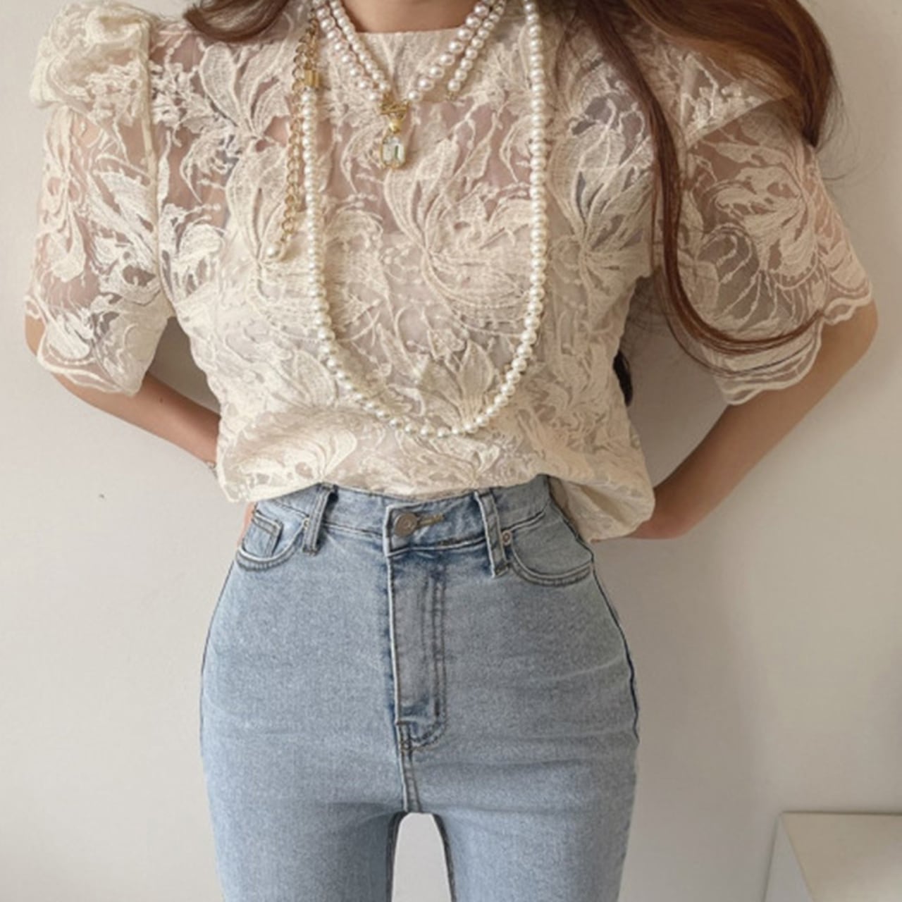 華やかさと快適さが共存するパフスリーブレースブラウス