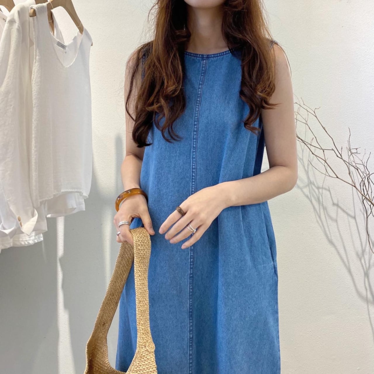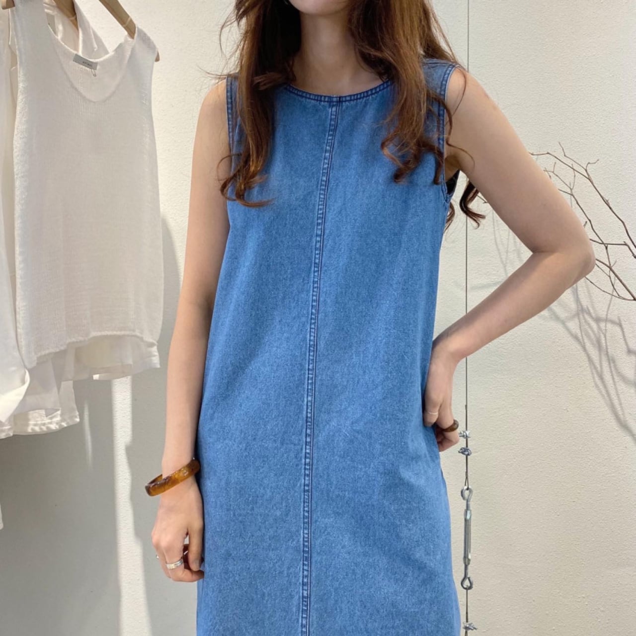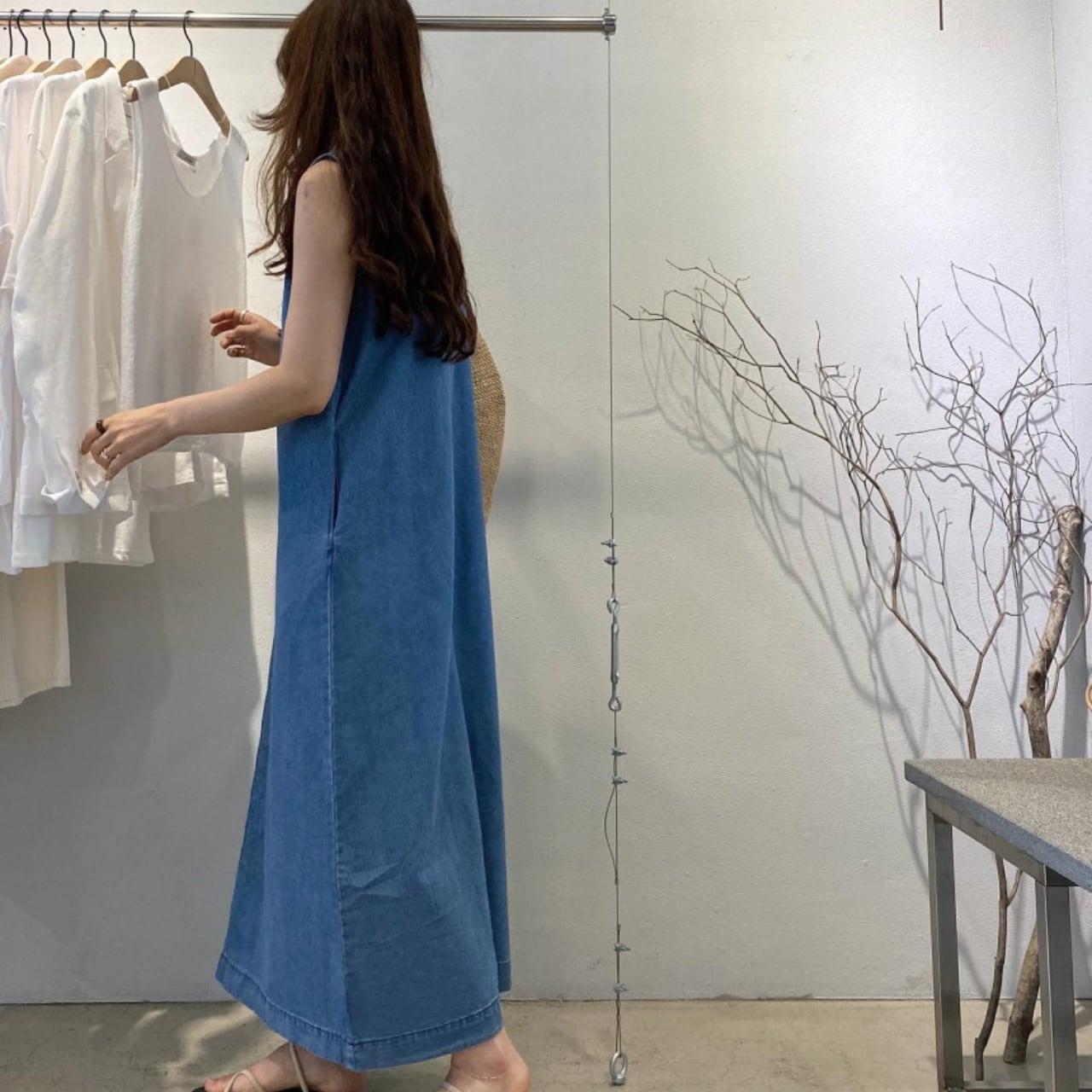 ・シンプルでありながら存在感のあるデニム素材を使用した、ホワイトとブルーの2色展開のロングワンピースです。