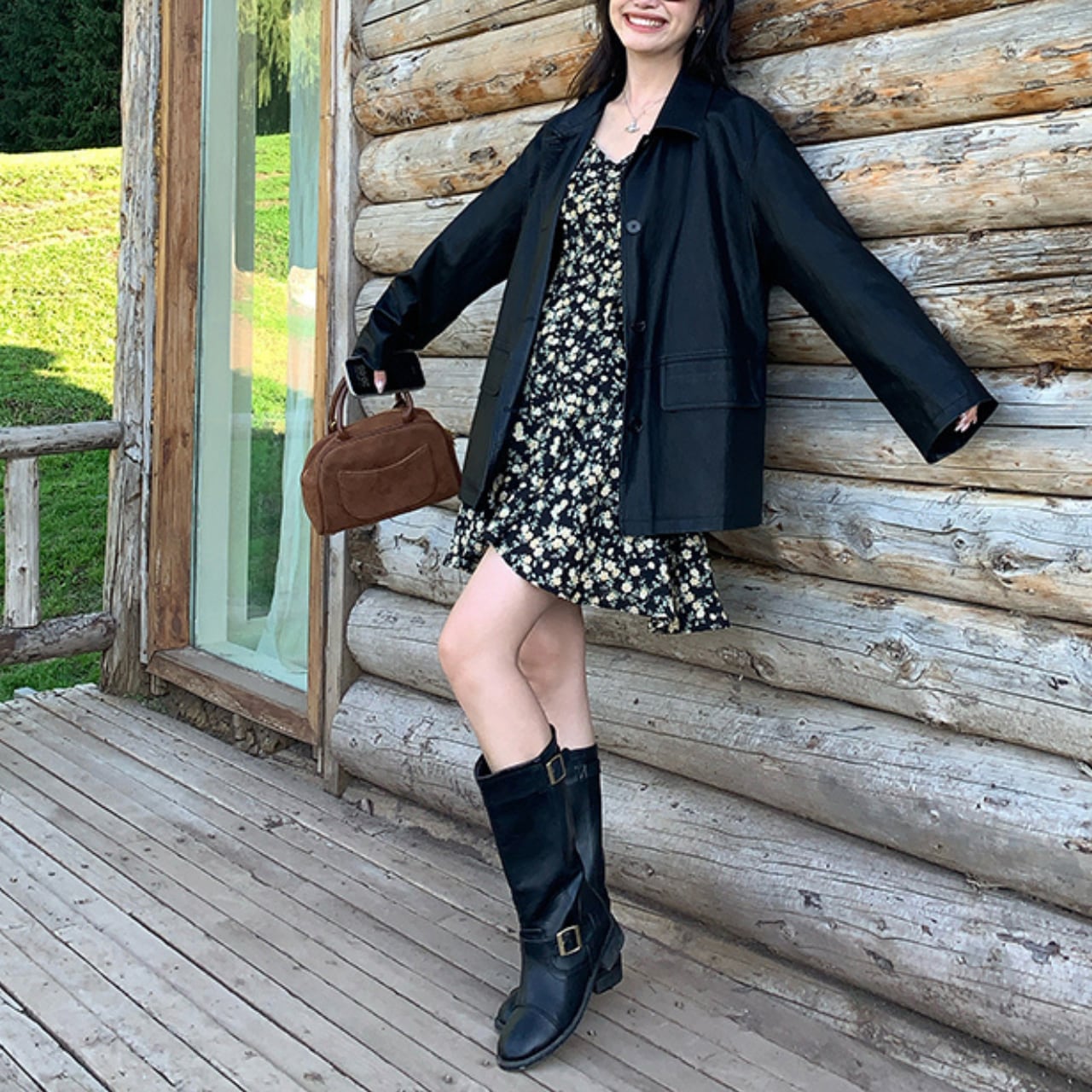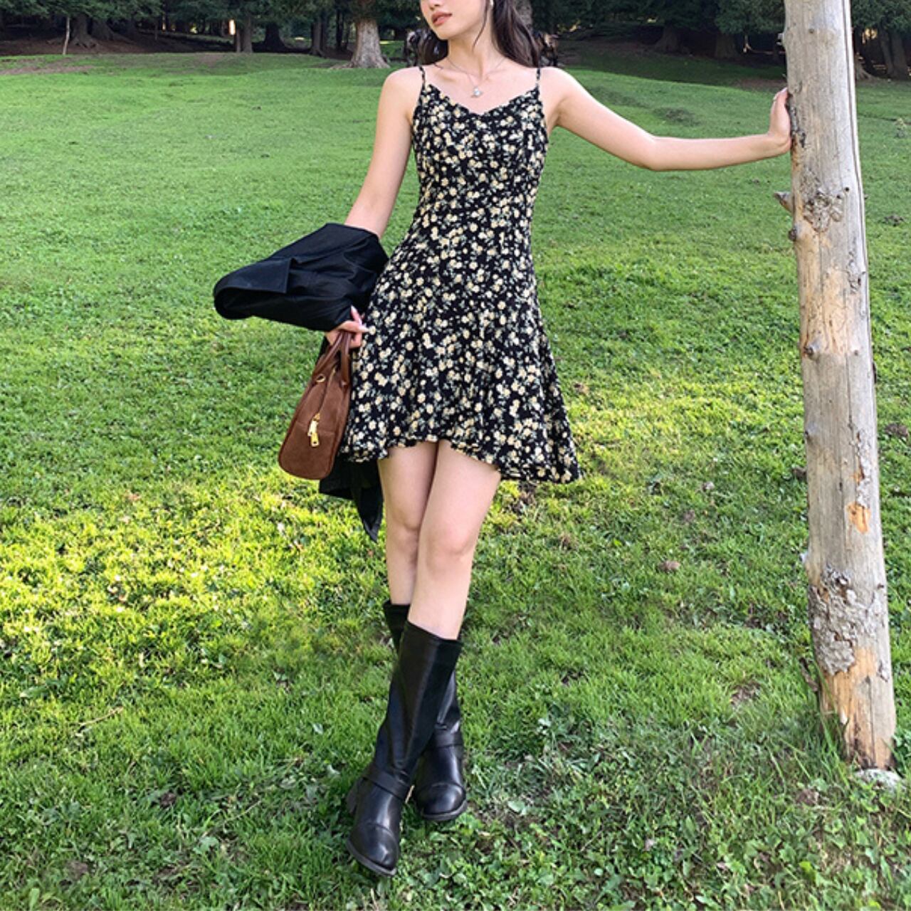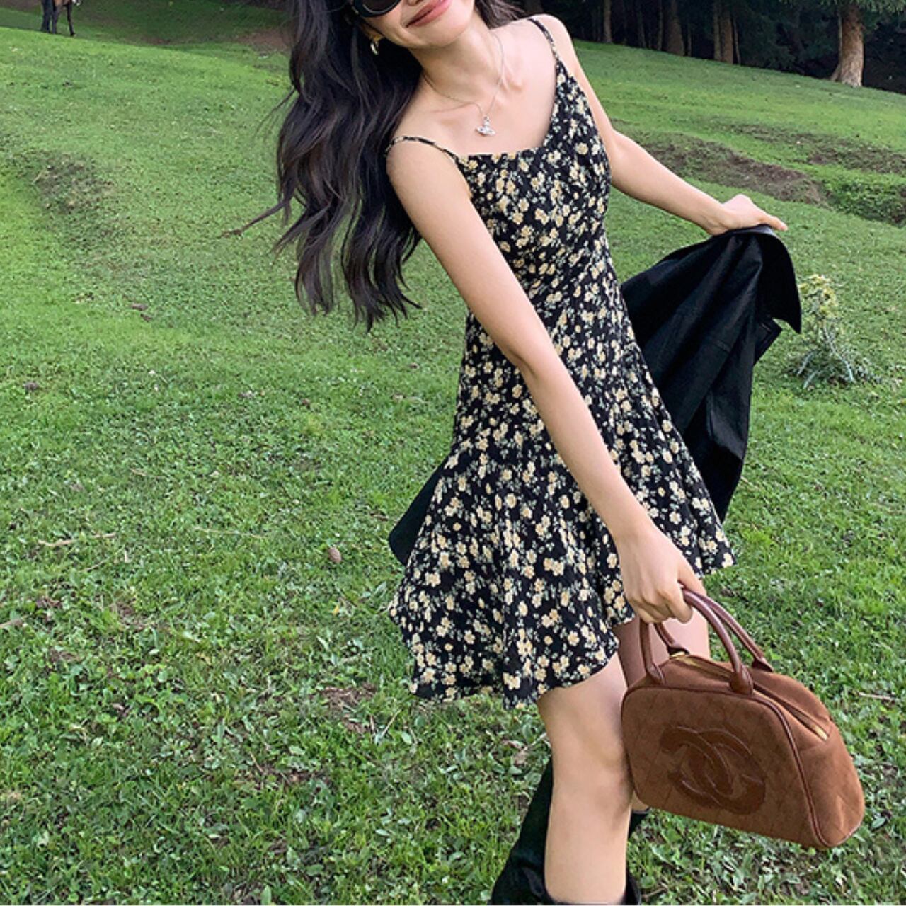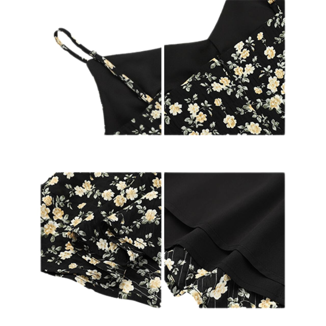 ・ブラックの小花柄が魅力的なキャミソールワンピースです。SからLまでのサイズ展開があり、自分の体型に合ったスタイルを楽しむことができます。シンプルでありながら、華やかさを感じさせるアイテムです。