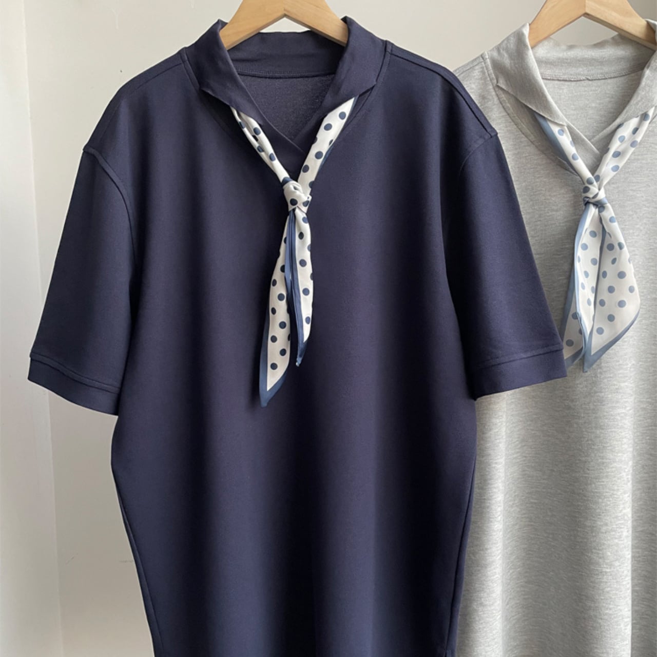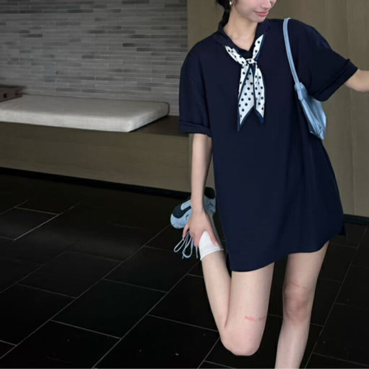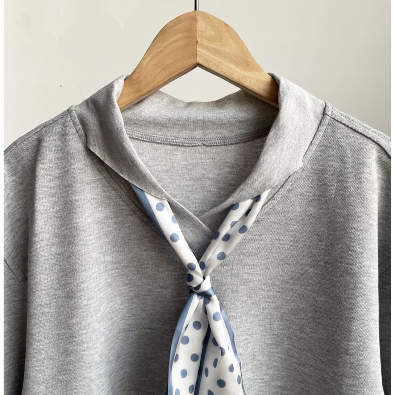 ・水玉蝶ネクタイデザインが可愛らしい、スカーフ付きのセーラーネックロングTシャツワンピースです。グレーとネイビーの2色展開で、MとLのサイズが揃っており、自分にぴったりのスタイルを楽しむことができます。