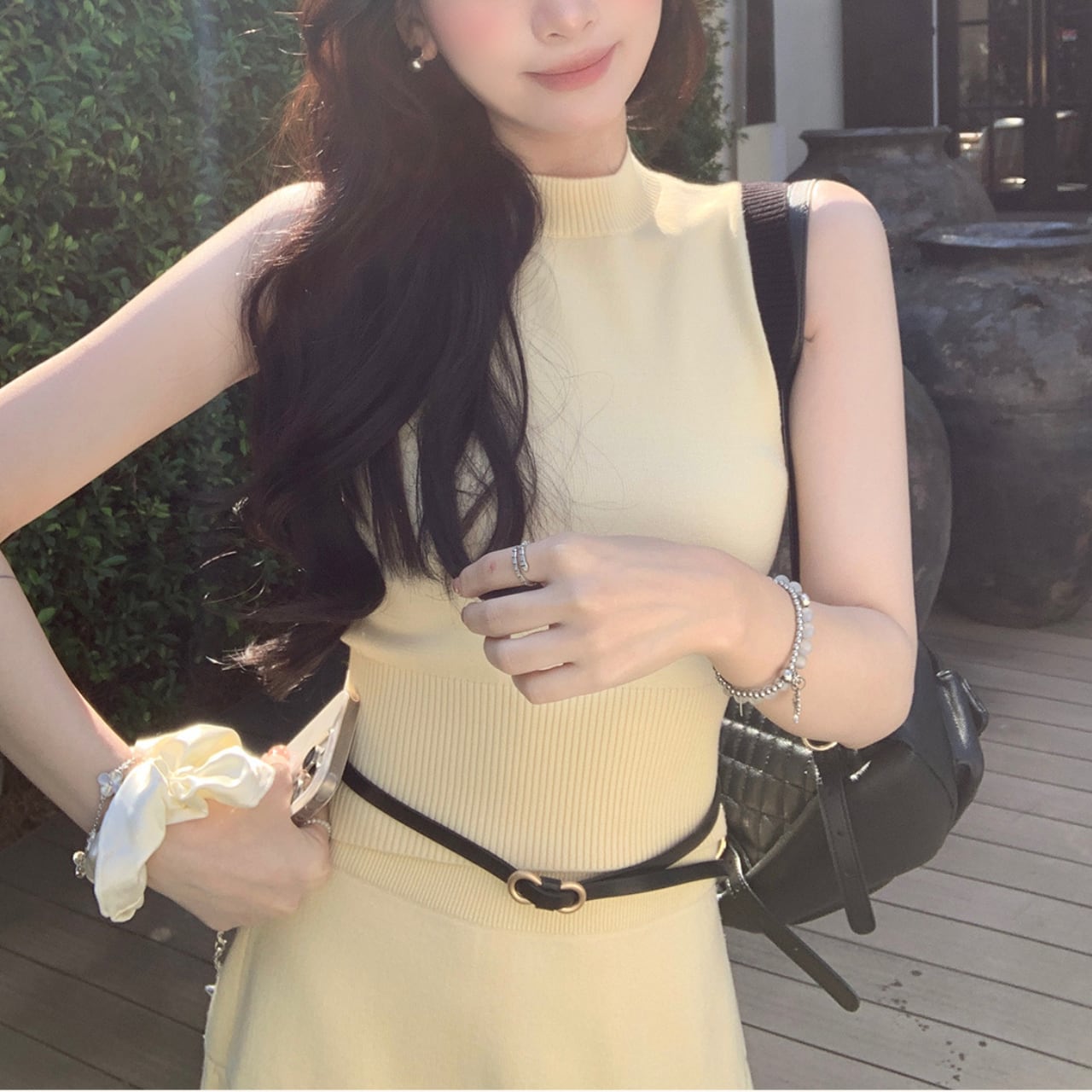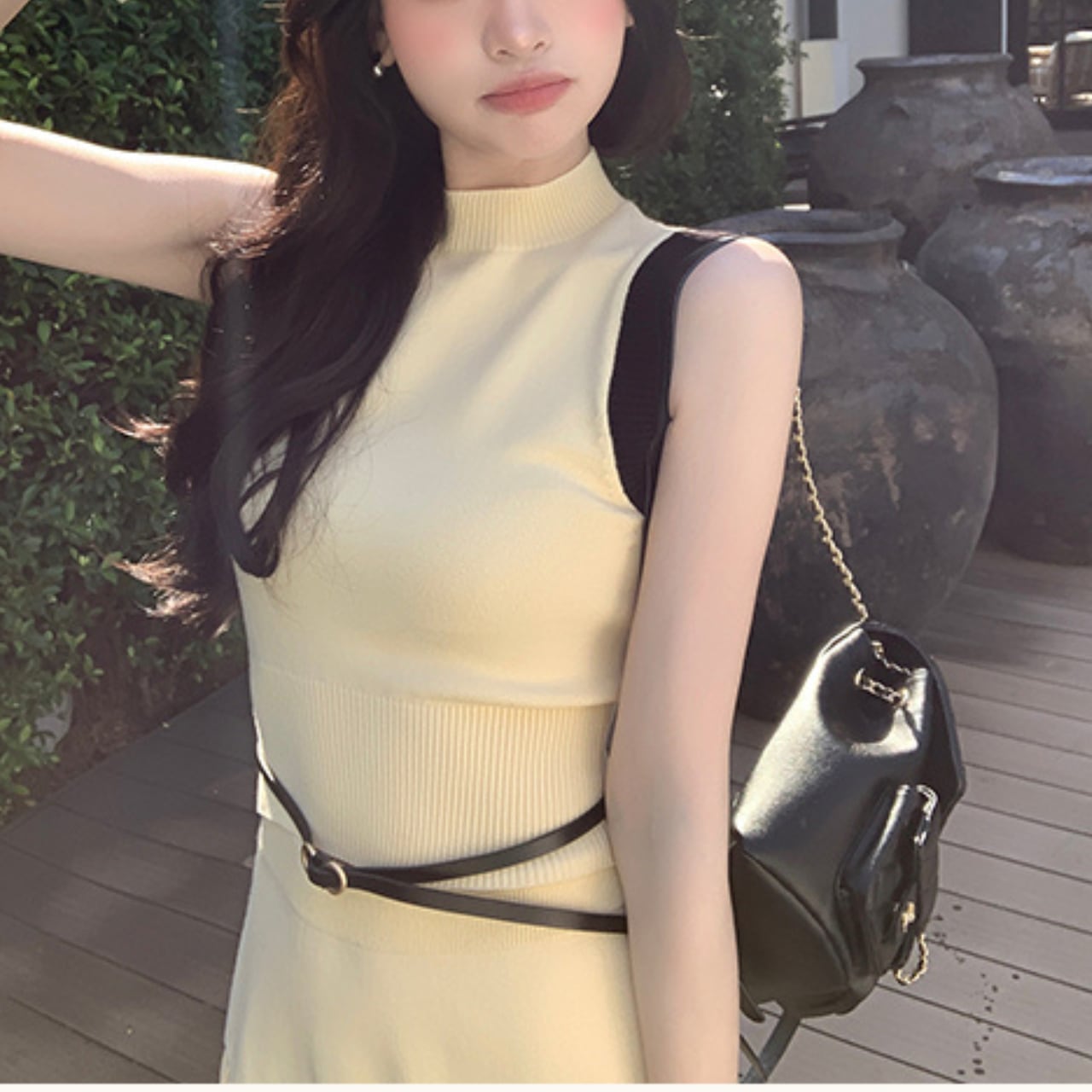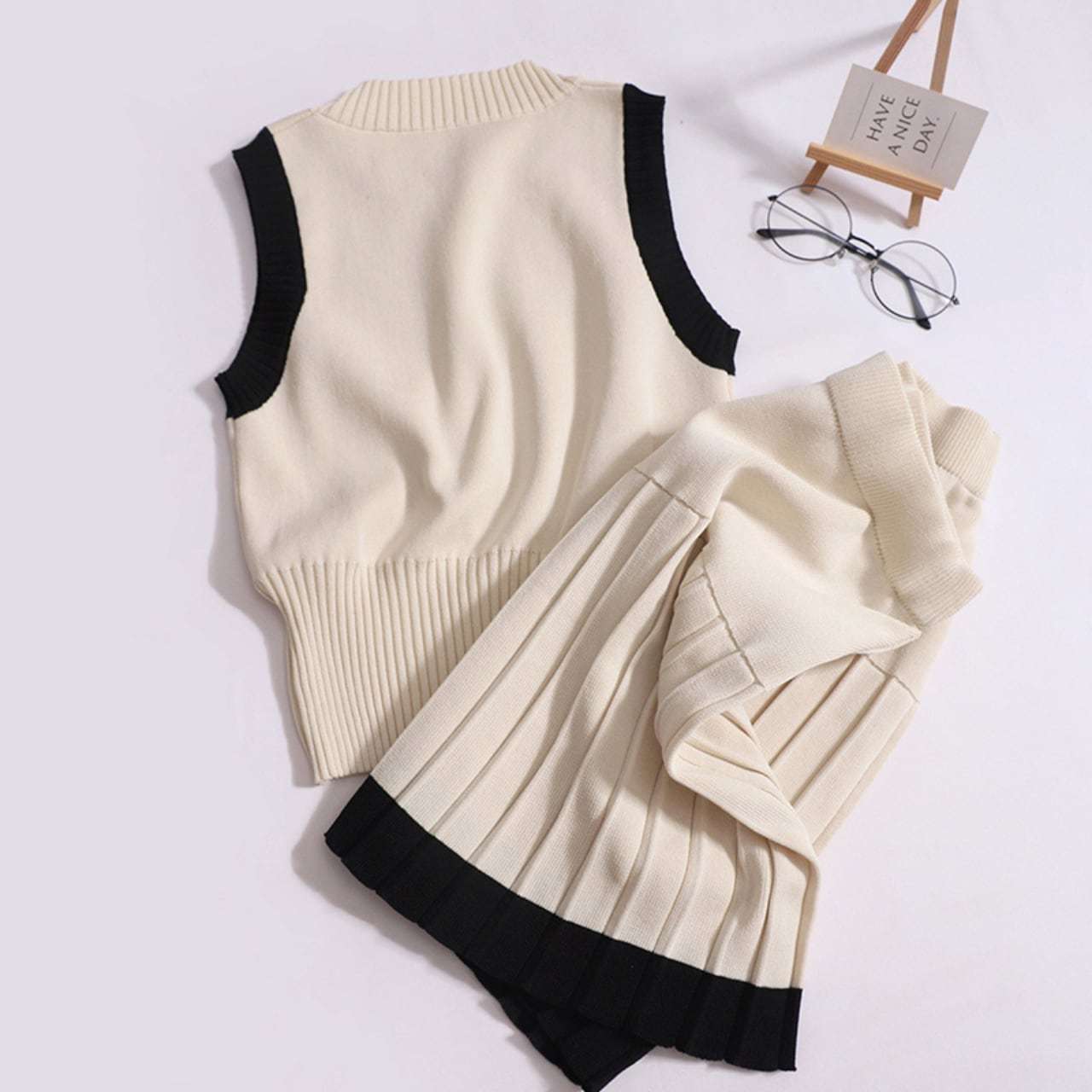 このニットセットアップは、ノースリーブトップスとプリーツスカートの組み合わせで、カジュアルなお出かけやデートにピッタリのアイテムです。柔らかなニット素材を使用しており、リラックスした着心地を実現しています。両カラーともに、異なるシーンでのコーディネートを楽しむことができるデザインです!