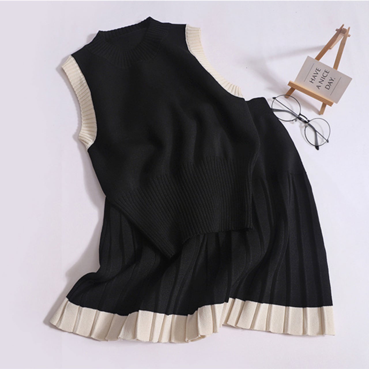 ・スタイリッシュなブラックとベージュの2色展開のニットセットアップです。ワンサイズで、プリーツスカートとノースリーブトップスが組み合わさったデザインは、シンプルながらも遊び心を感じさせる仕上がりです!季節を問わずおしゃれに着こなせる一着です。