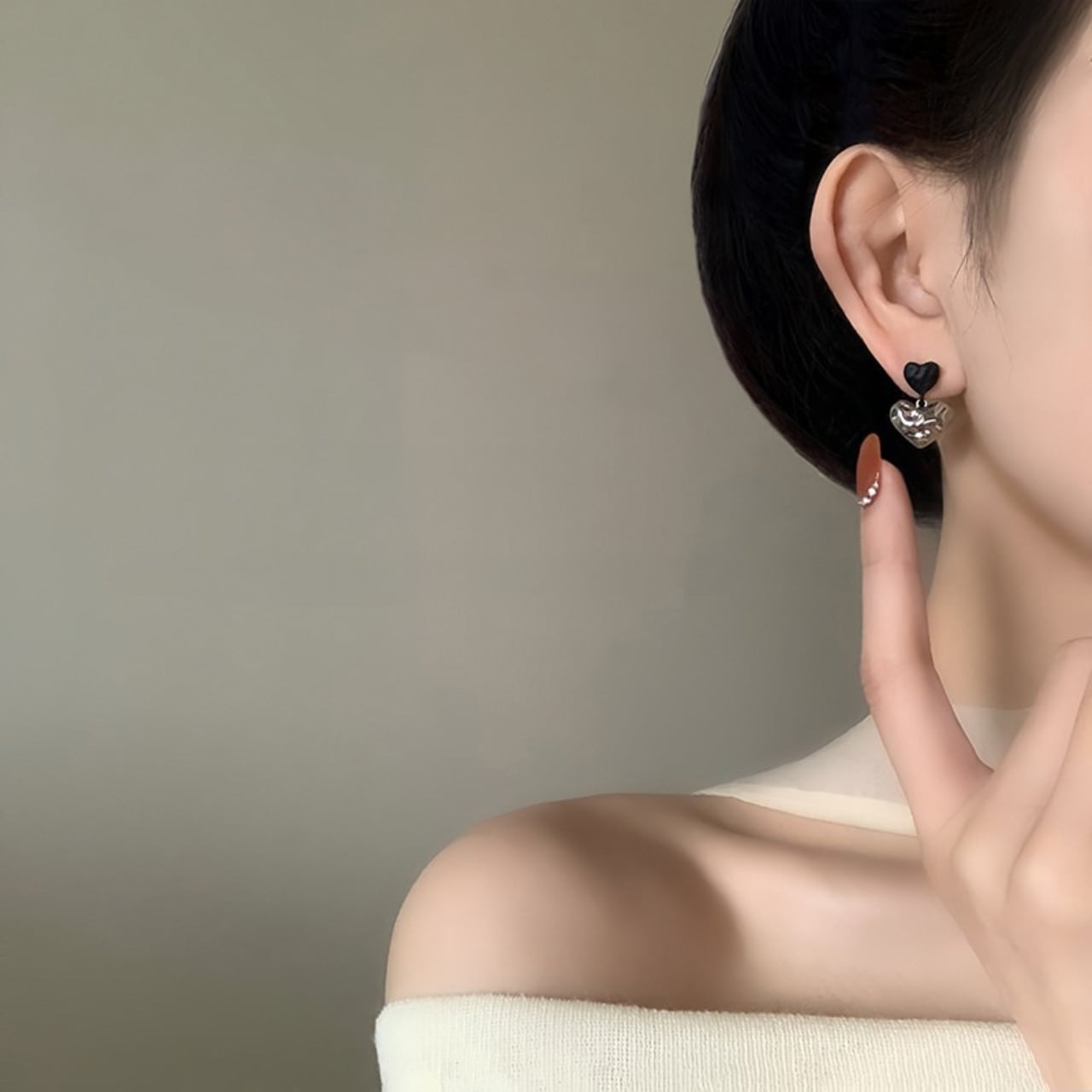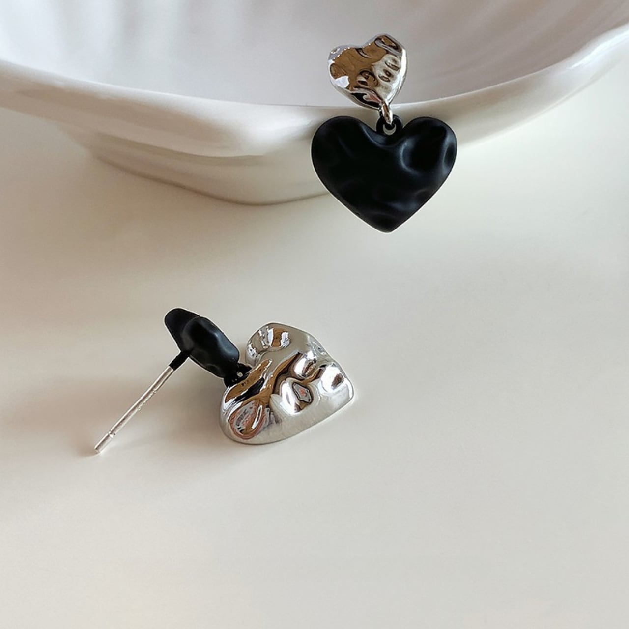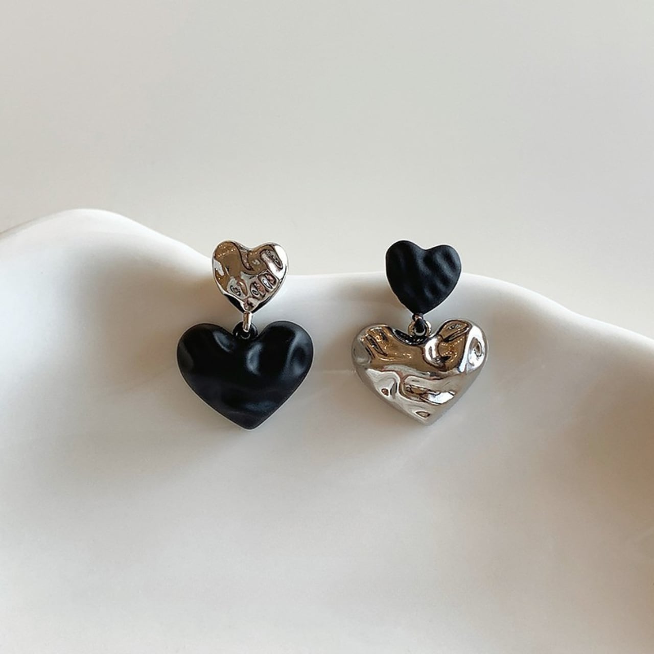 ・シックなブラックとスタイリッシュなシルバーのハートが魅力的なメタルハートピアスです。独自のデザインが耳元を華やかに彩り、シンプルながらも存在感があります!どんなスタイルにもマッチし、デイリーユースから特別なシーンまで幅広く活躍します。