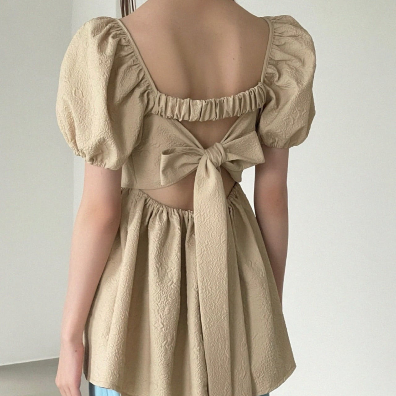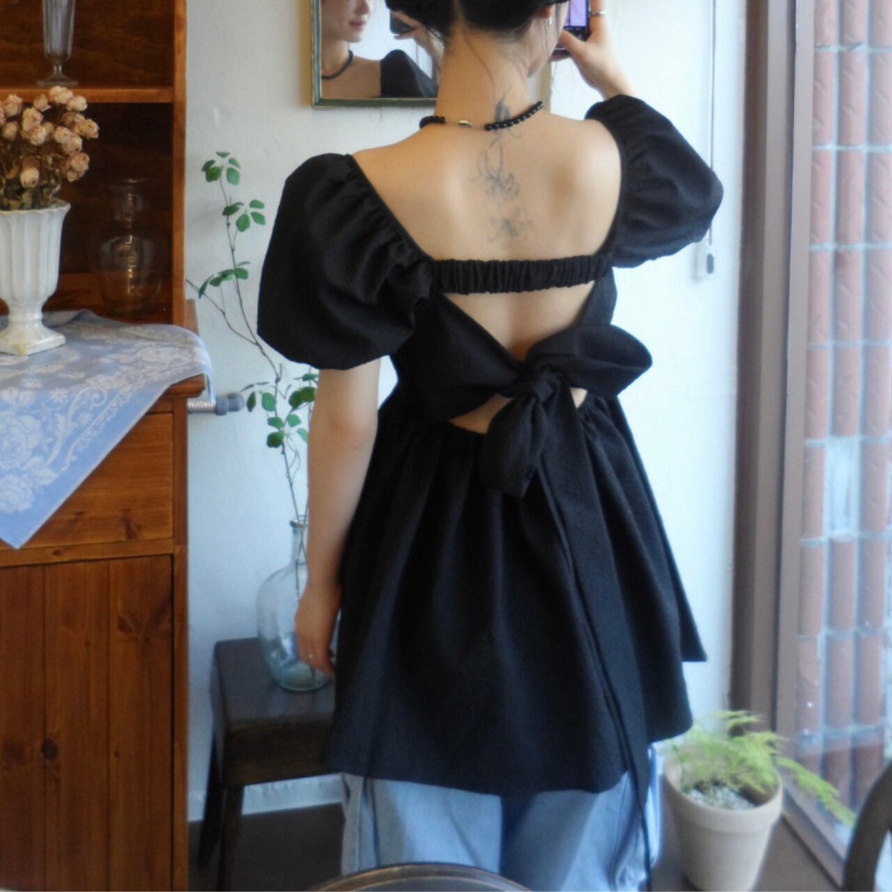 このトップスは軽やかな素材を使用しており、快適な着心地が魅力です。フリーサイズで、多くの体型に対応可能です!バックリボンがアクセントになり、シンプルなコーディネートにも華やかさを添えることができます。カジュアルなデイリーコーデから、ちょっとしたお出かけまで、幅広く活躍する一枚です。