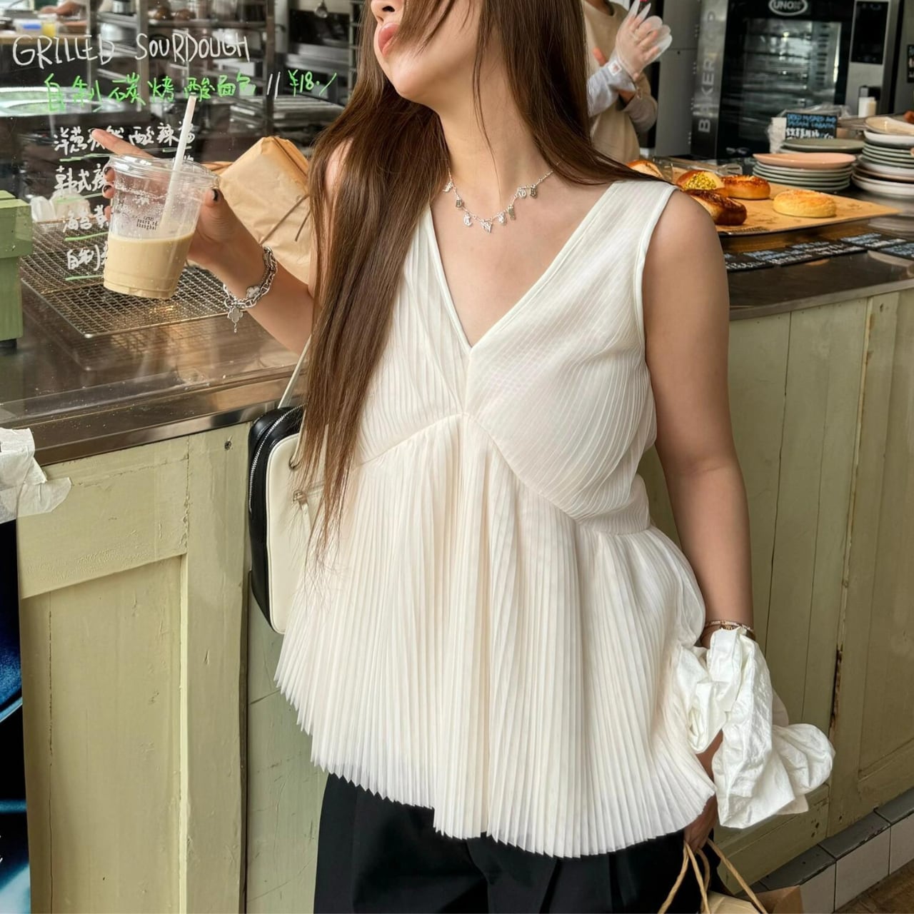 ・洗練されたホワイトのVネックプリーツノースリーブトップスは、SからLサイズまでご用意しております!Vネックデザインとプリーツが織りなすスタイルは、シンプルながらも女性らしい魅力を引き立ててくれます。デイリーユースに最適で、カジュアルからおしゃれなシーンまで幅広くご活用いただける一枚です。