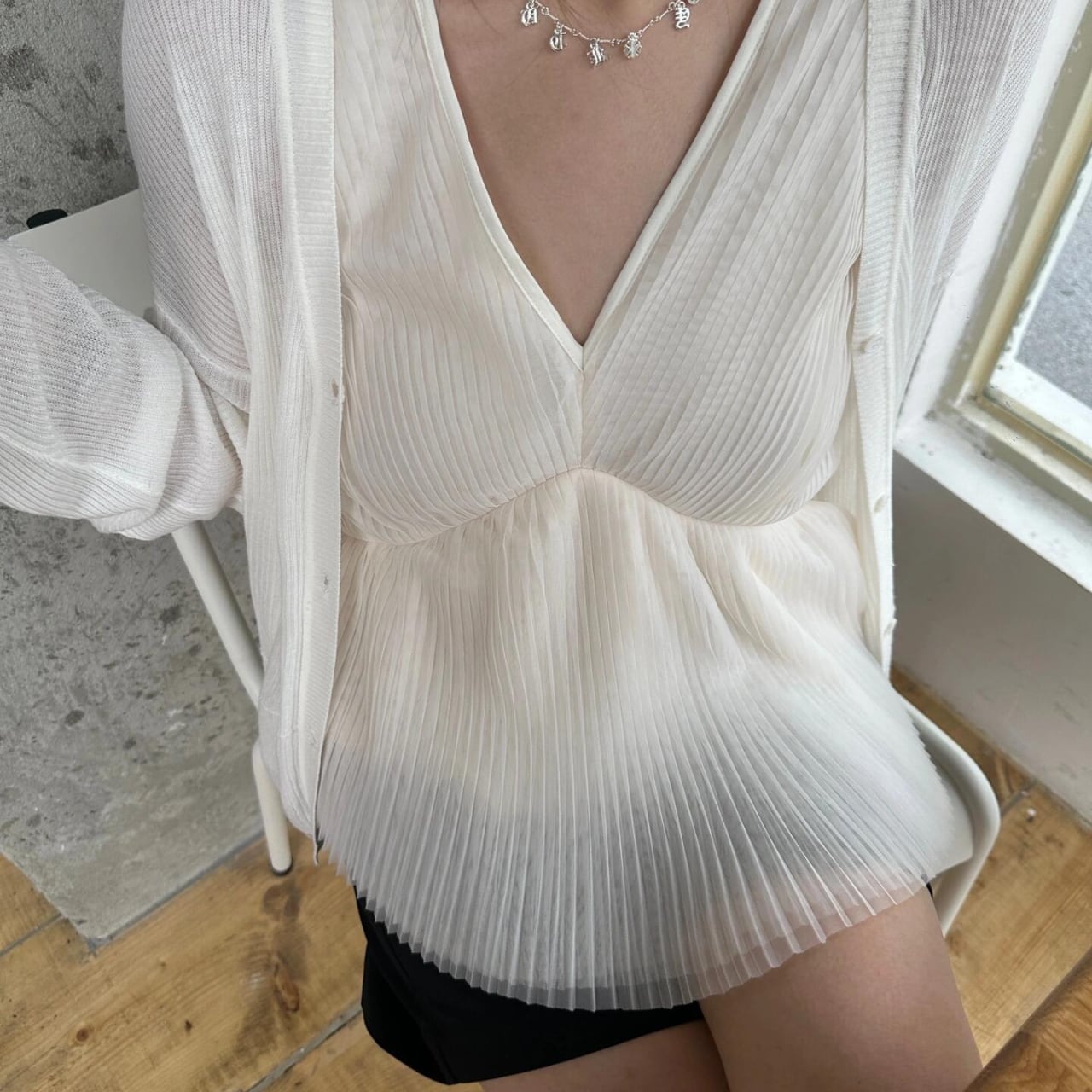 デイリーユースに最適なVネックプリーツノースリーブトップス
