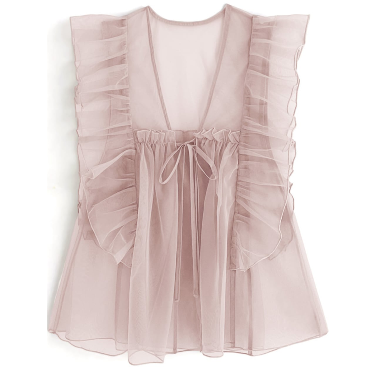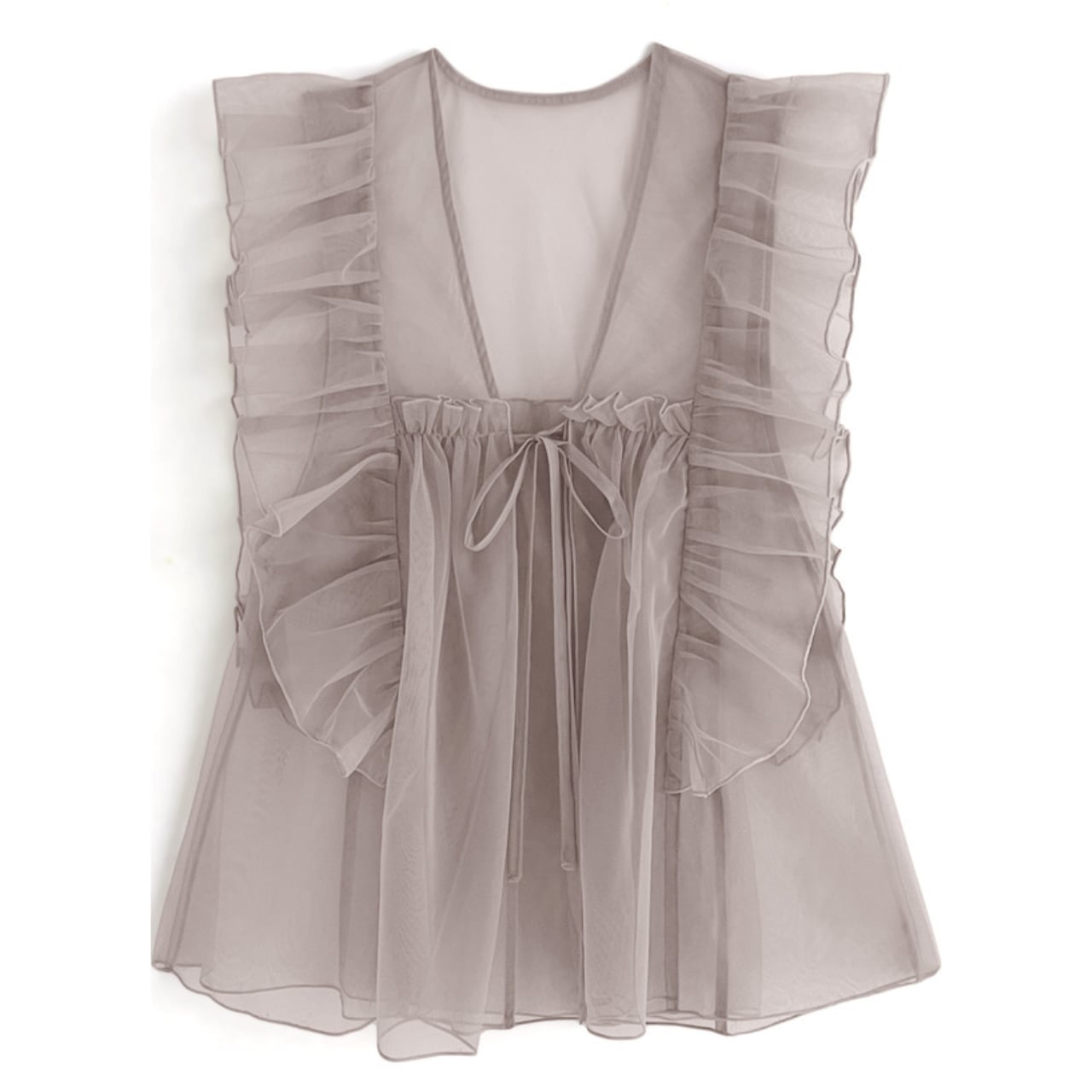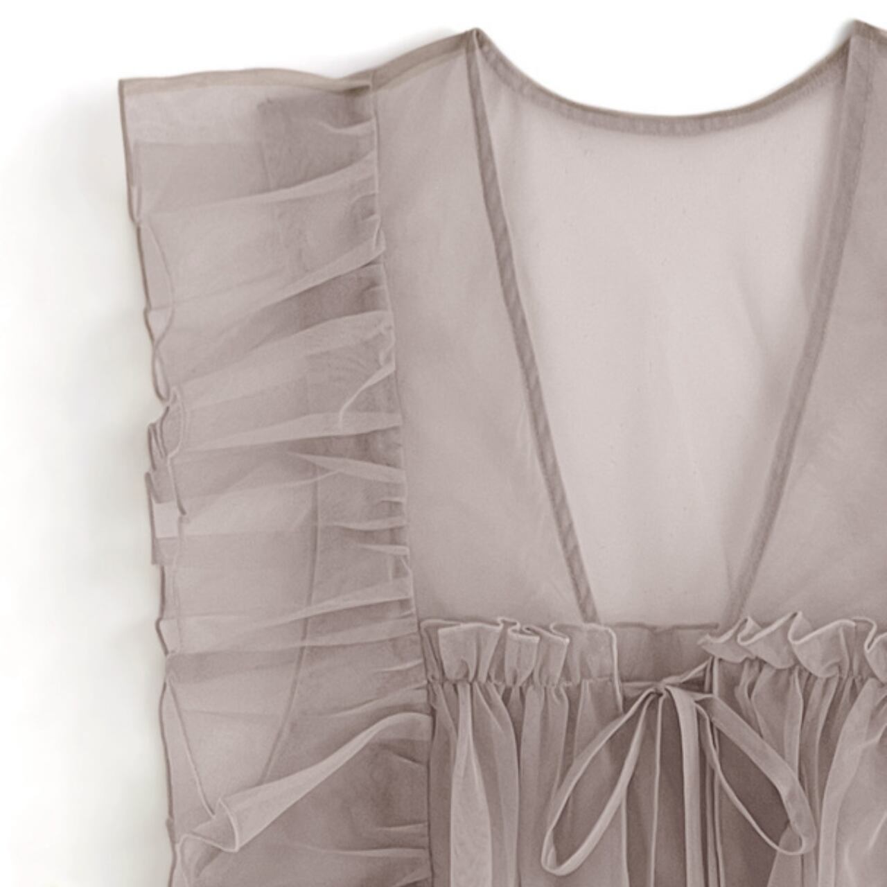 ・華やかなアイボリー、グレージュ、ピンクの3色から選べるシースルーフリルブラウスは、デイリーユースから特別なシーンまで幅広く活躍するアイテムです!胸元のリボンとチュールのフリルデザインが女性らしさを引き立て、上品な印象を与えます。
