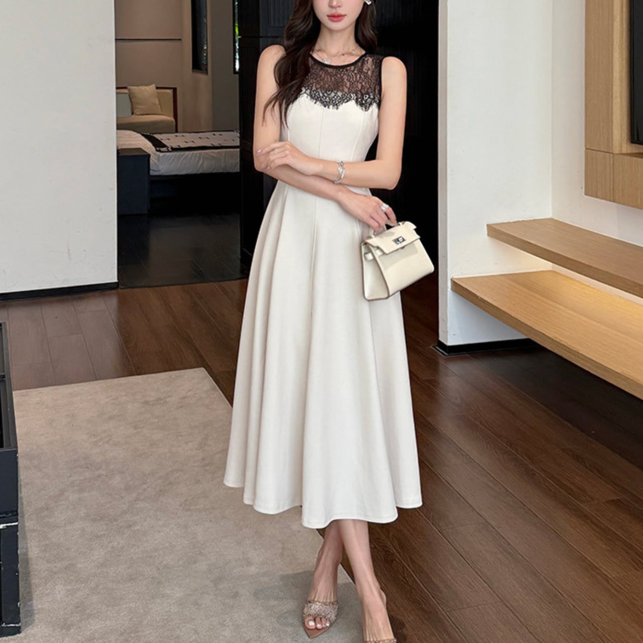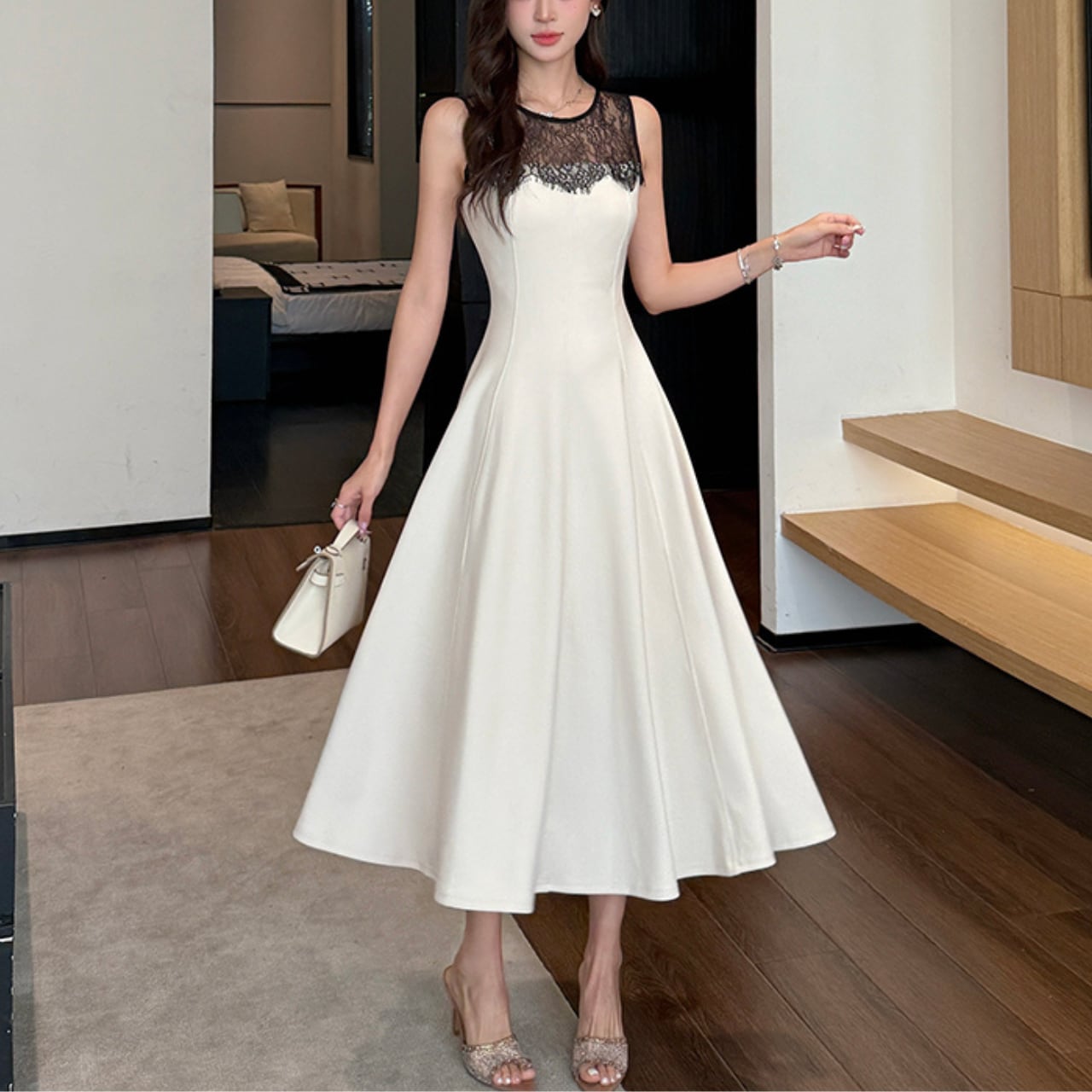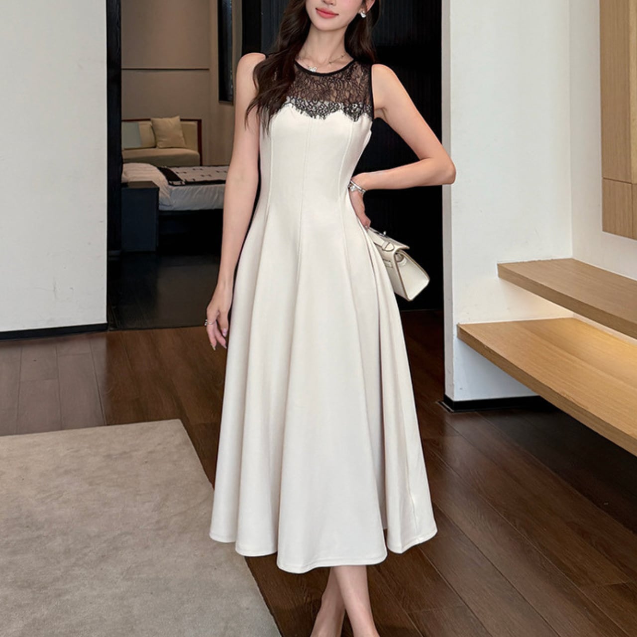 デイリーユースに最適なレース切り替えノースリーブフレアワンピース
