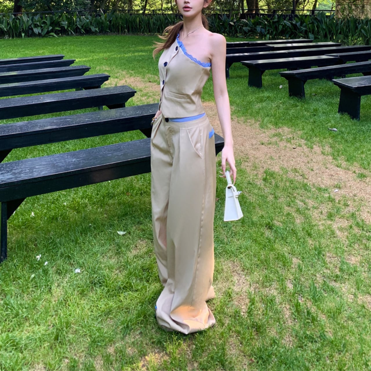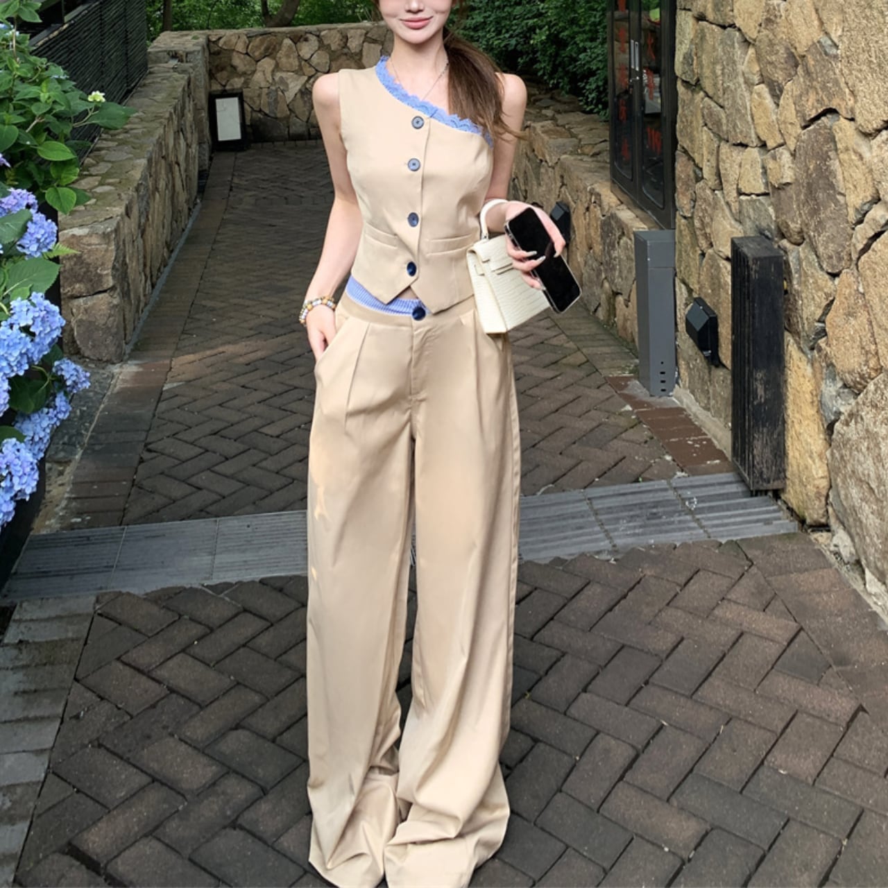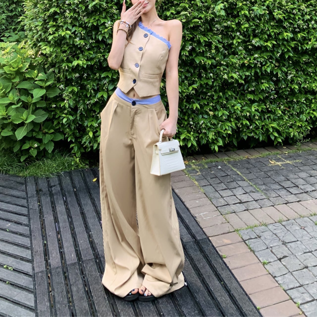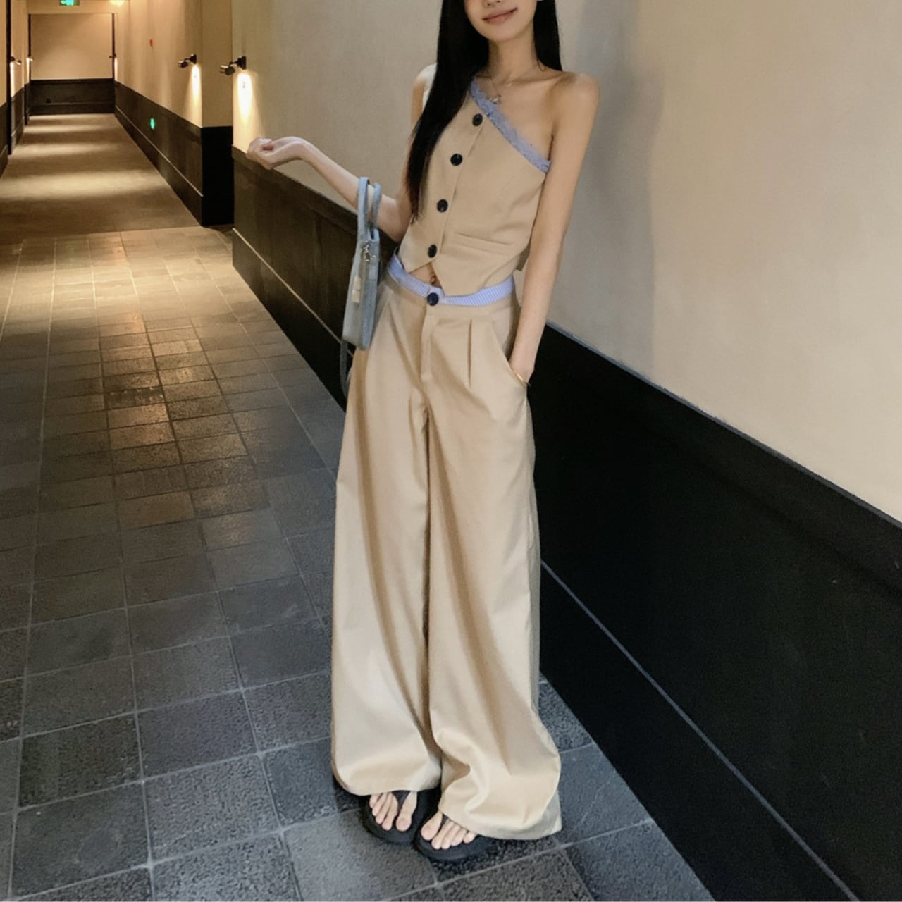 片肩ベスト+ハイウエストワイドパンツ