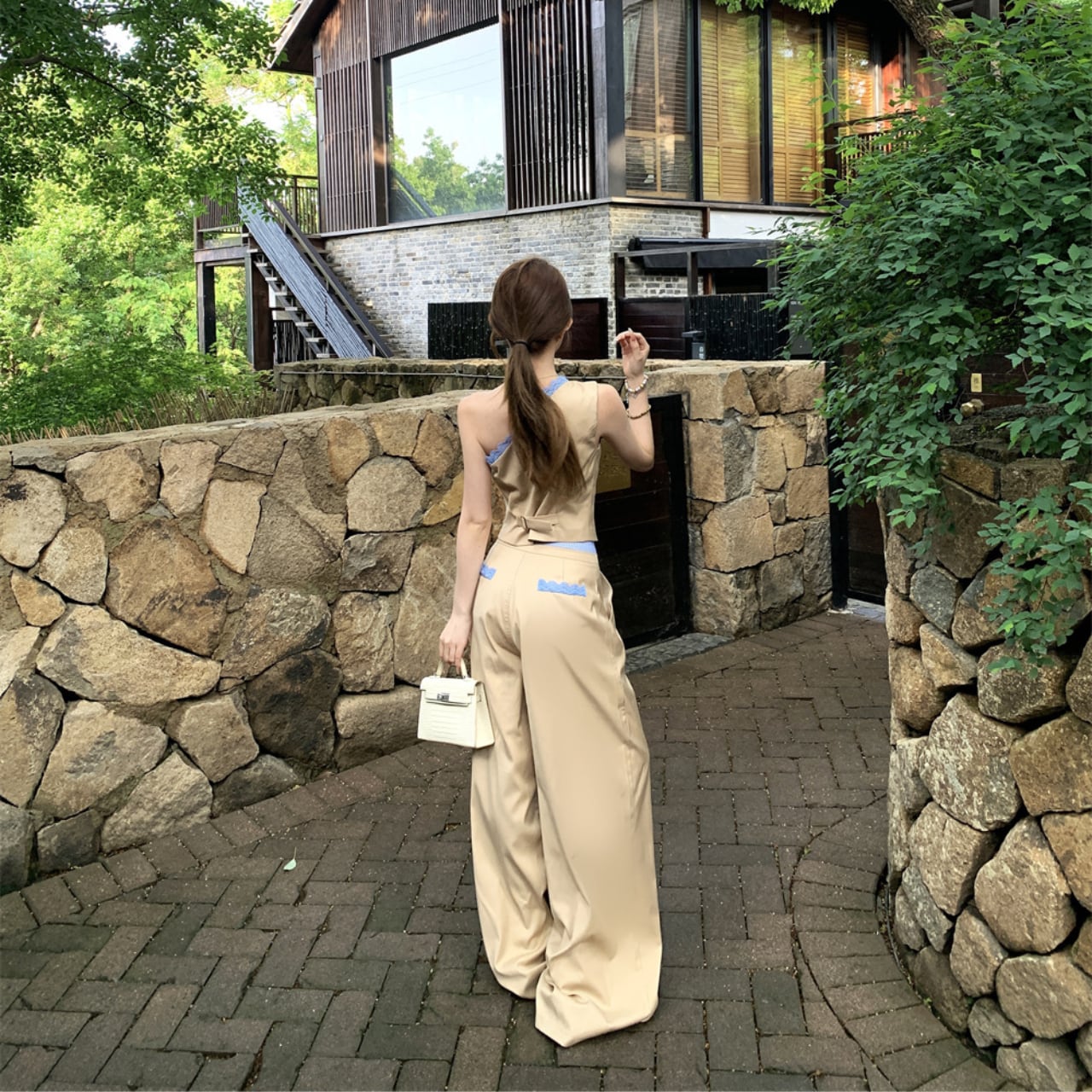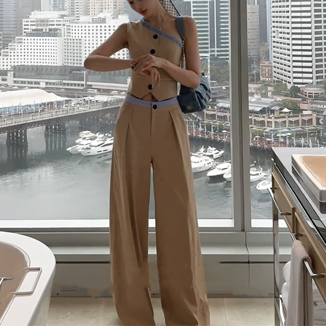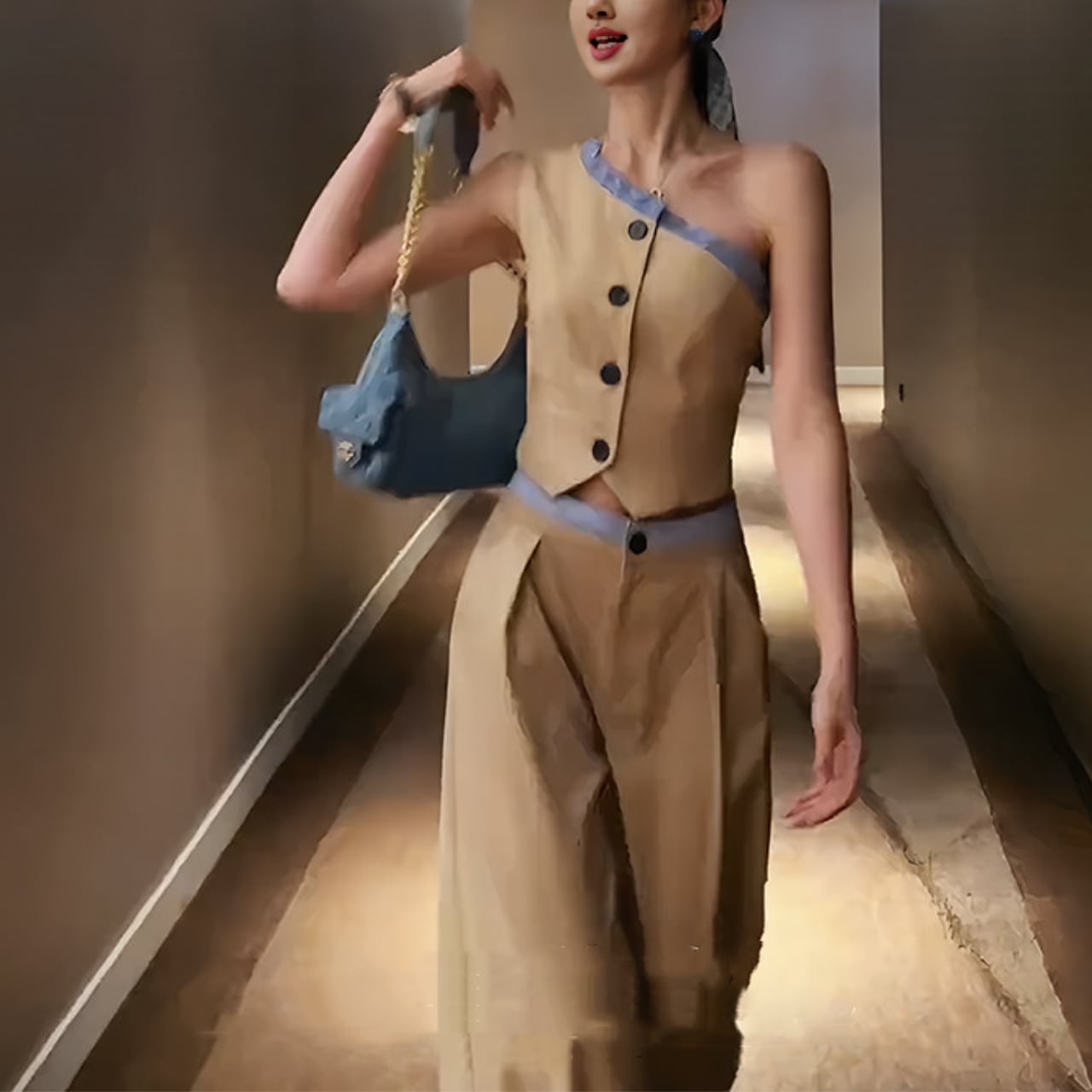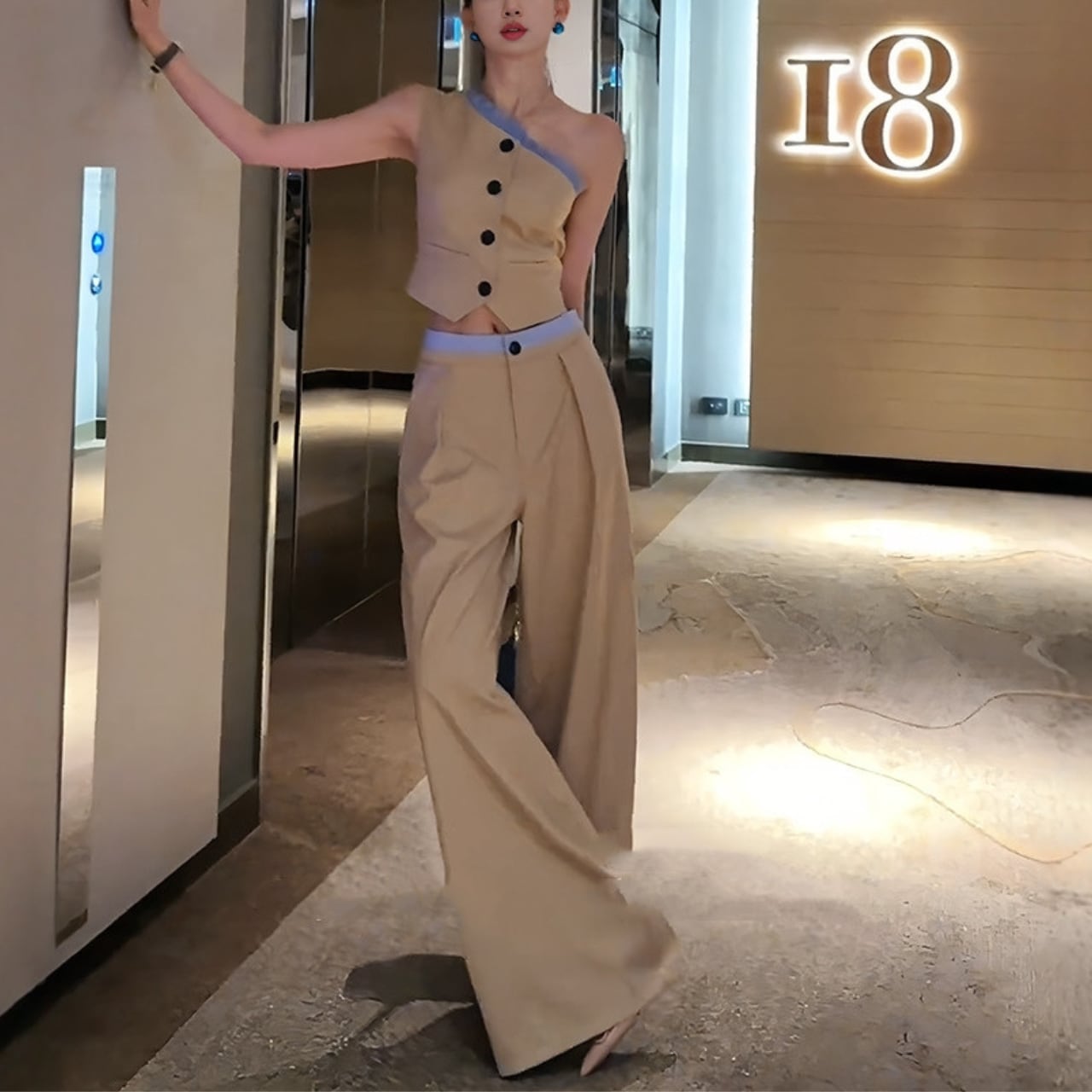 片肩ベスト+ハイウエストワイドパンツ