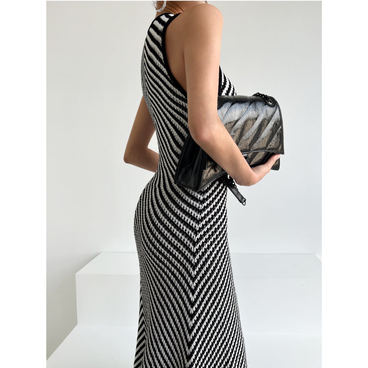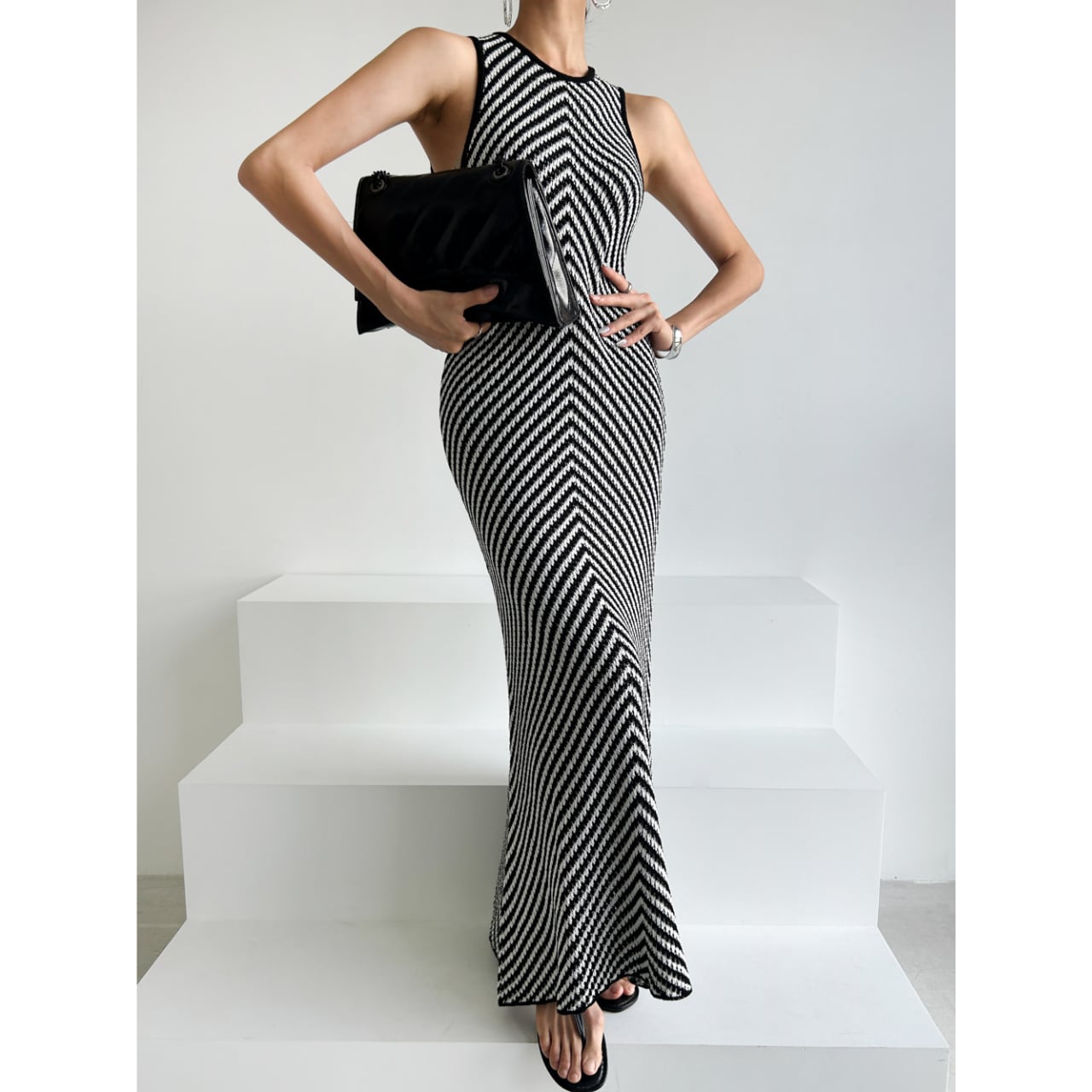 ・魅力的な黒と白のコントラストが目を引くノースリーブニットワンピース!シンプルでありながらスタイリッシュなデザインは、多様なシーンで活躍すること間違いなし。柔らかなニット素材を使用しており、快適な着心地を提供します。