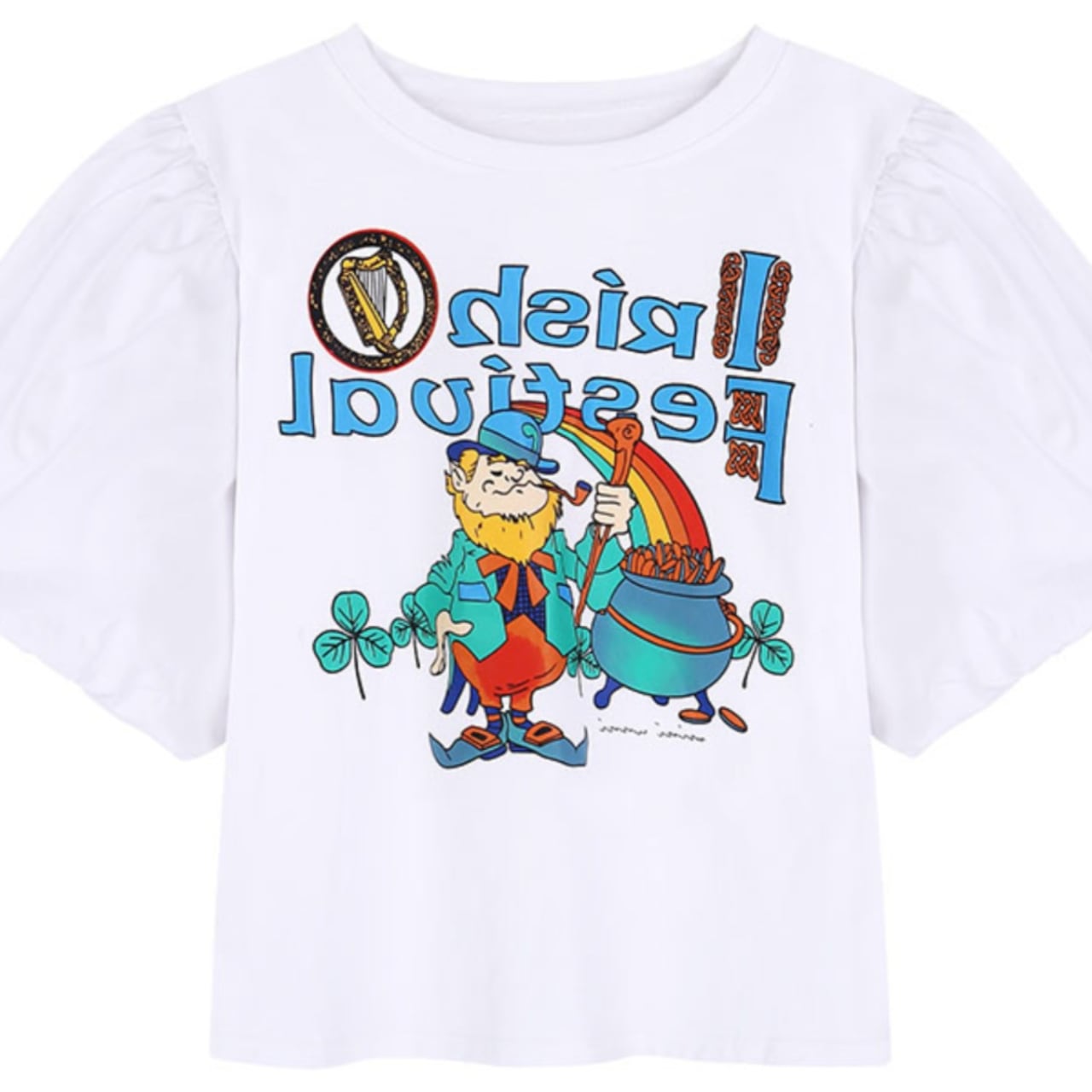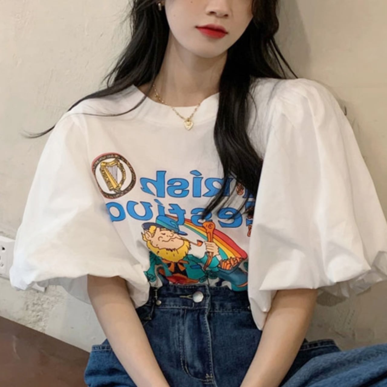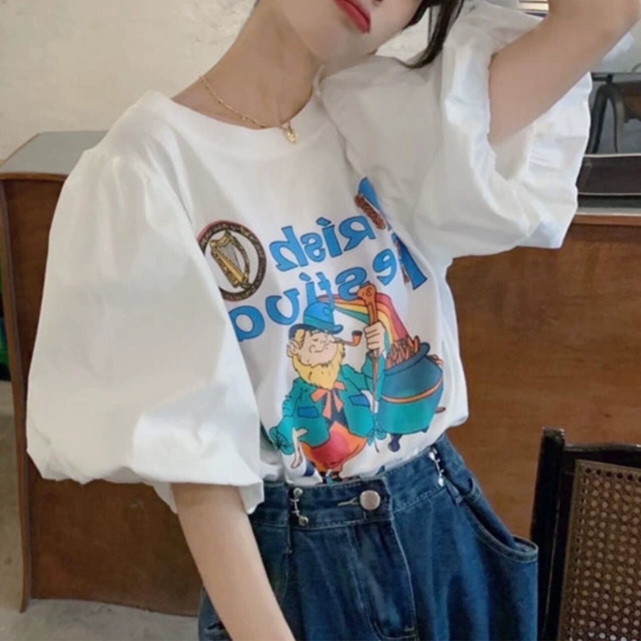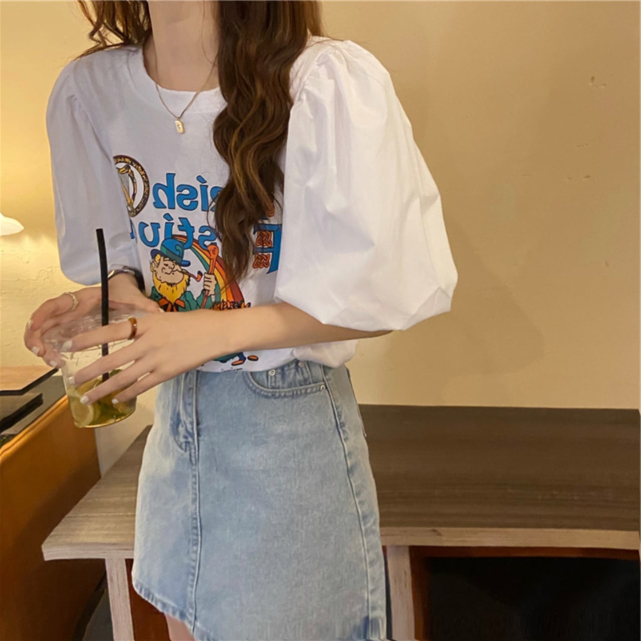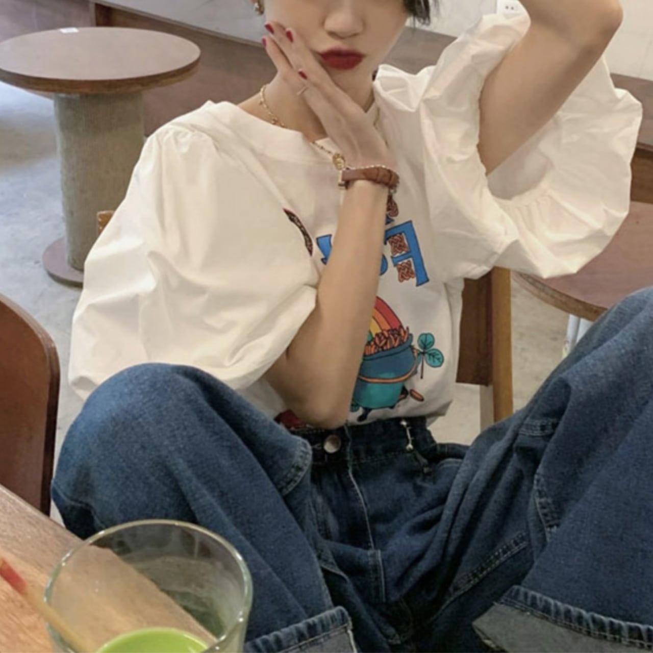 デイリーユースに最適なパフスリーブ プリント Tシャツ