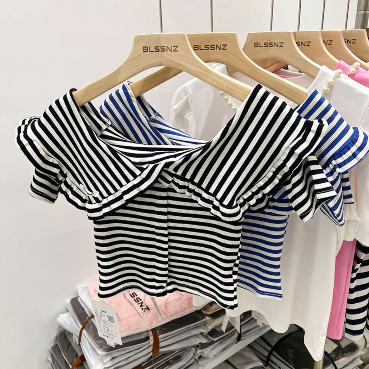 ・スタイリッシュなストライプデザインが目を引くオフショルダートップス!ブルーとブラックの2色展開で、シンプルながらも洗練された印象を与えます。肩を華奢に見せるオフショルダーは、女性らしさを際立て、どんなボトムスとも相性が良く、デイリーコーデに最適です。