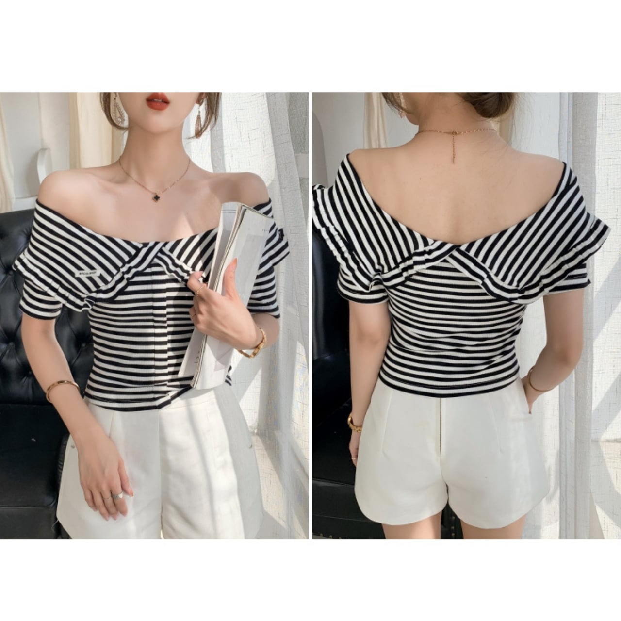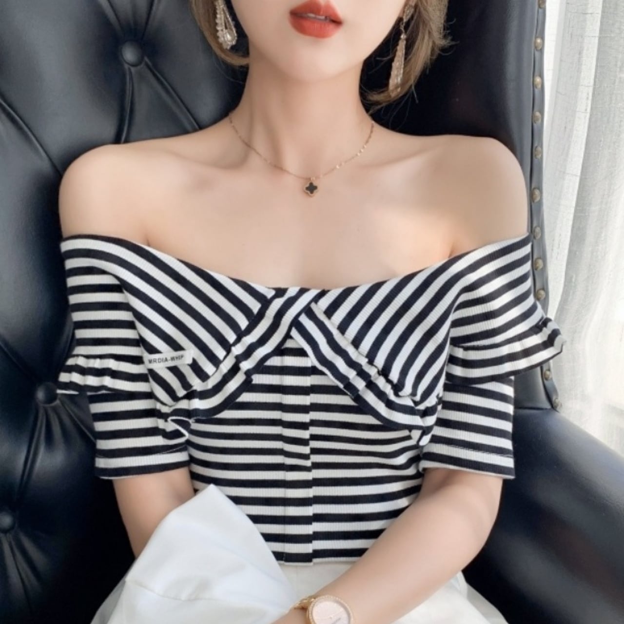 デイリーユースに最適なストライプ オフショルダー トップス