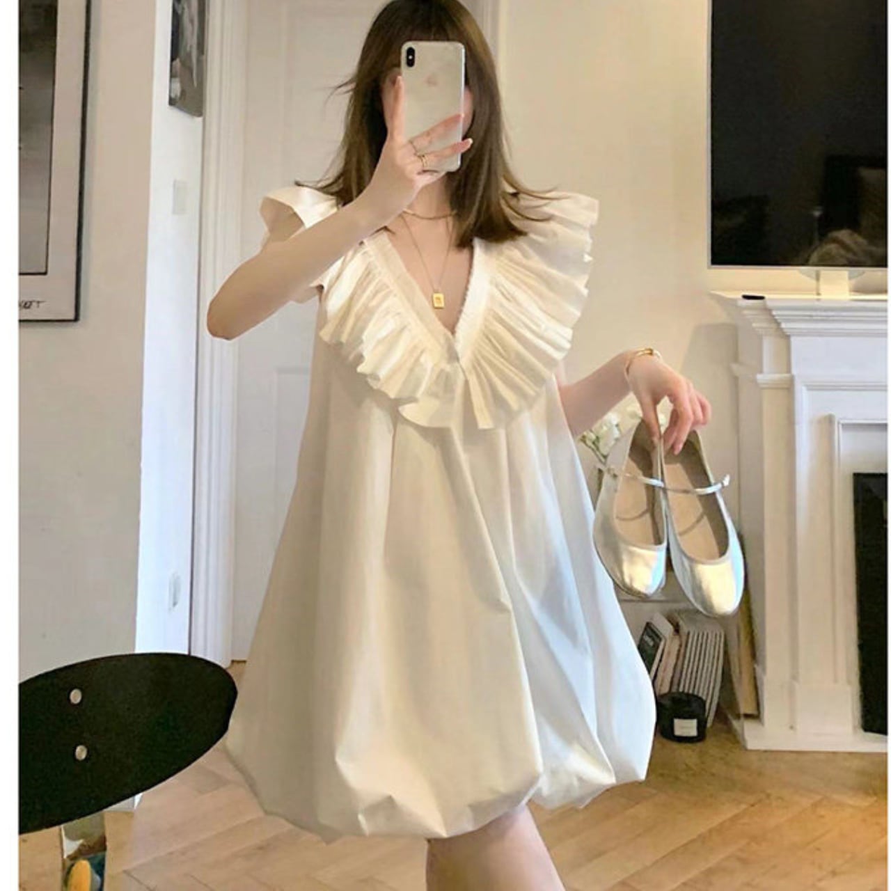 ・可愛らしいフレンチフリルが特徴のミニ丈ワンピース!Vネックデザインがデコルテを美しく見せ、シンプルながらも存在感のある一着です。デイリーコーデから特別なシーンまで、幅広くおしゃれを楽しめるアイテムです。