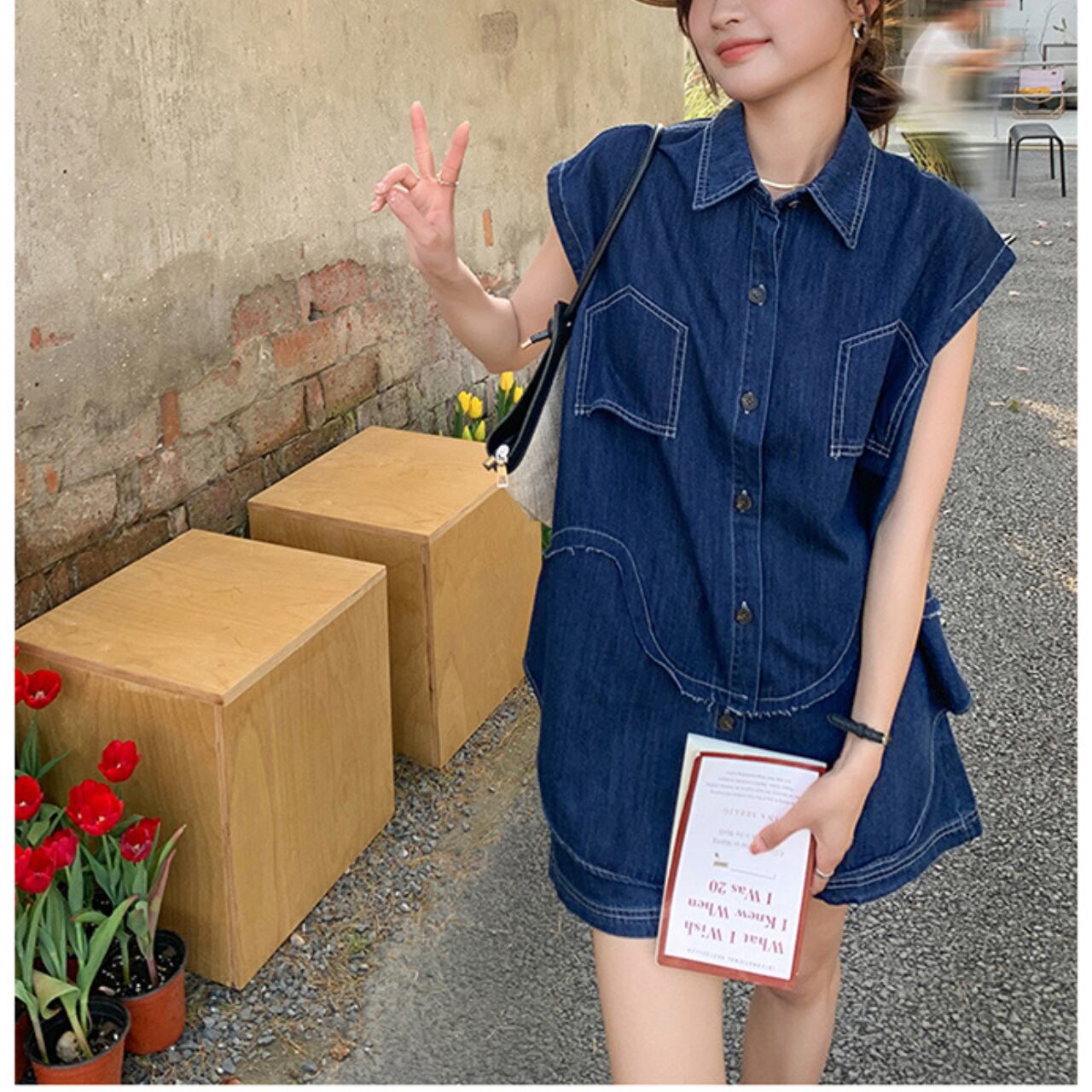 ノースリーブデニム ショートパンツ セットアップ a214