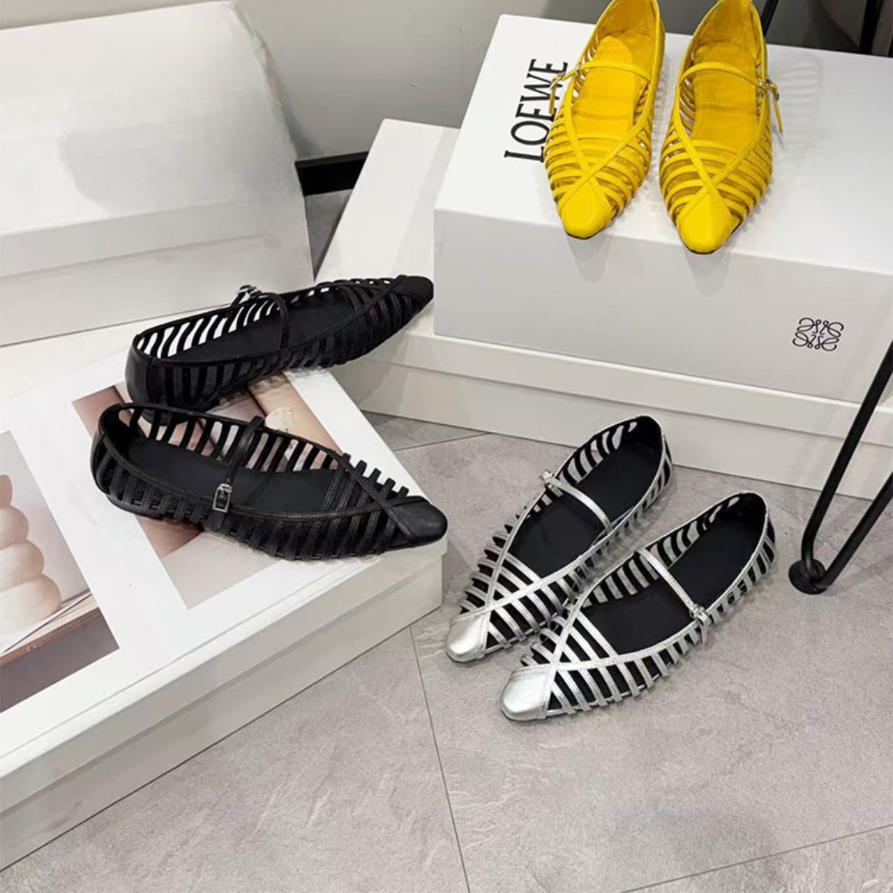 ・洗練されたデザインのポインテッドトゥ サンダルが新登場!シャローカットのスタイリッシュなシルエットで、足元を美しく見せるアイテムです。カラーはイエロー、シルバー、ブラックの3色展開で、カジュアルからフォーマルなシーンまで幅広く対応します。サイズは35から40までご用意しており、多様な足のサイズにフィットします。