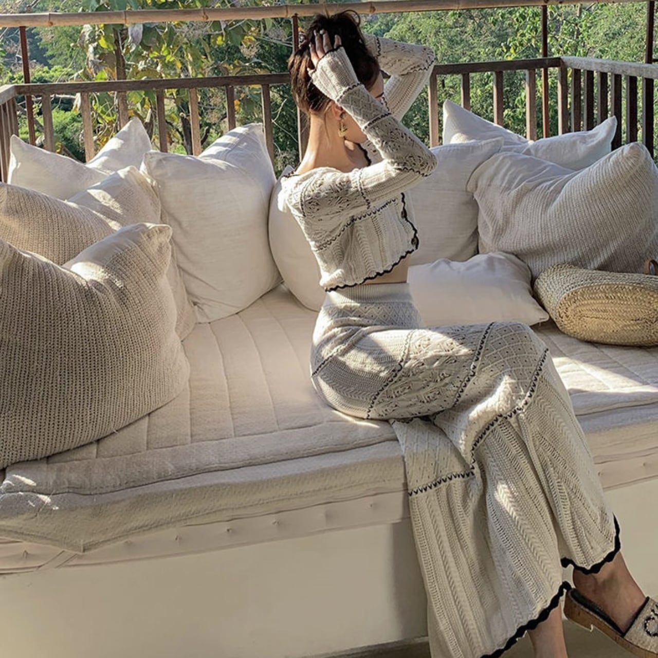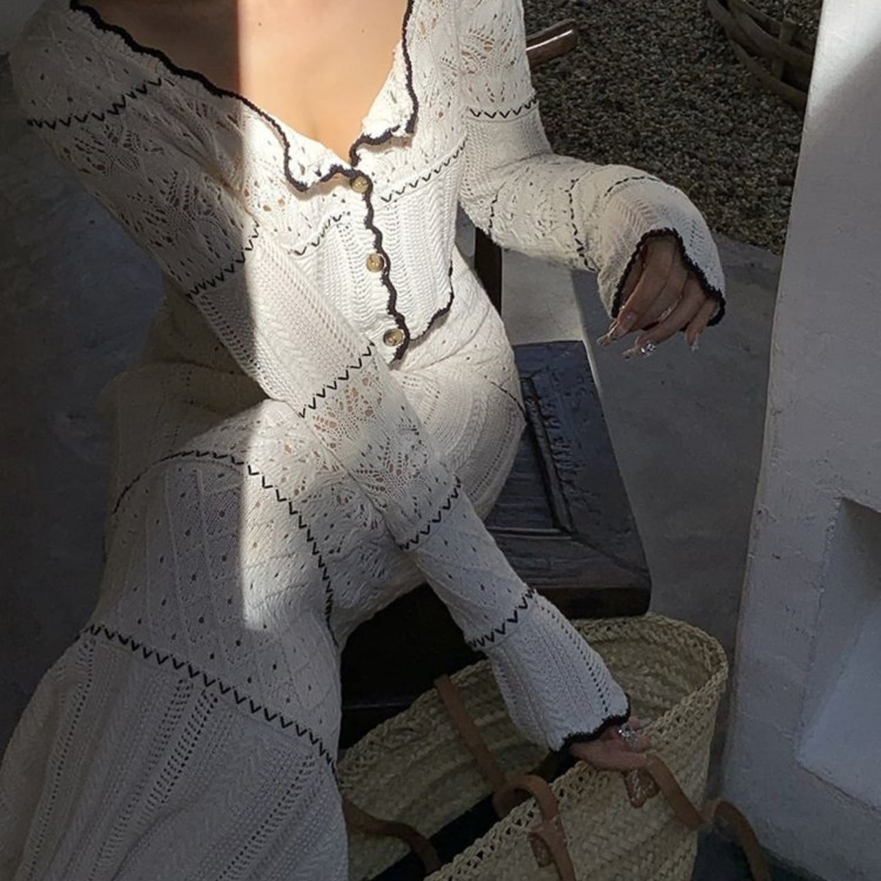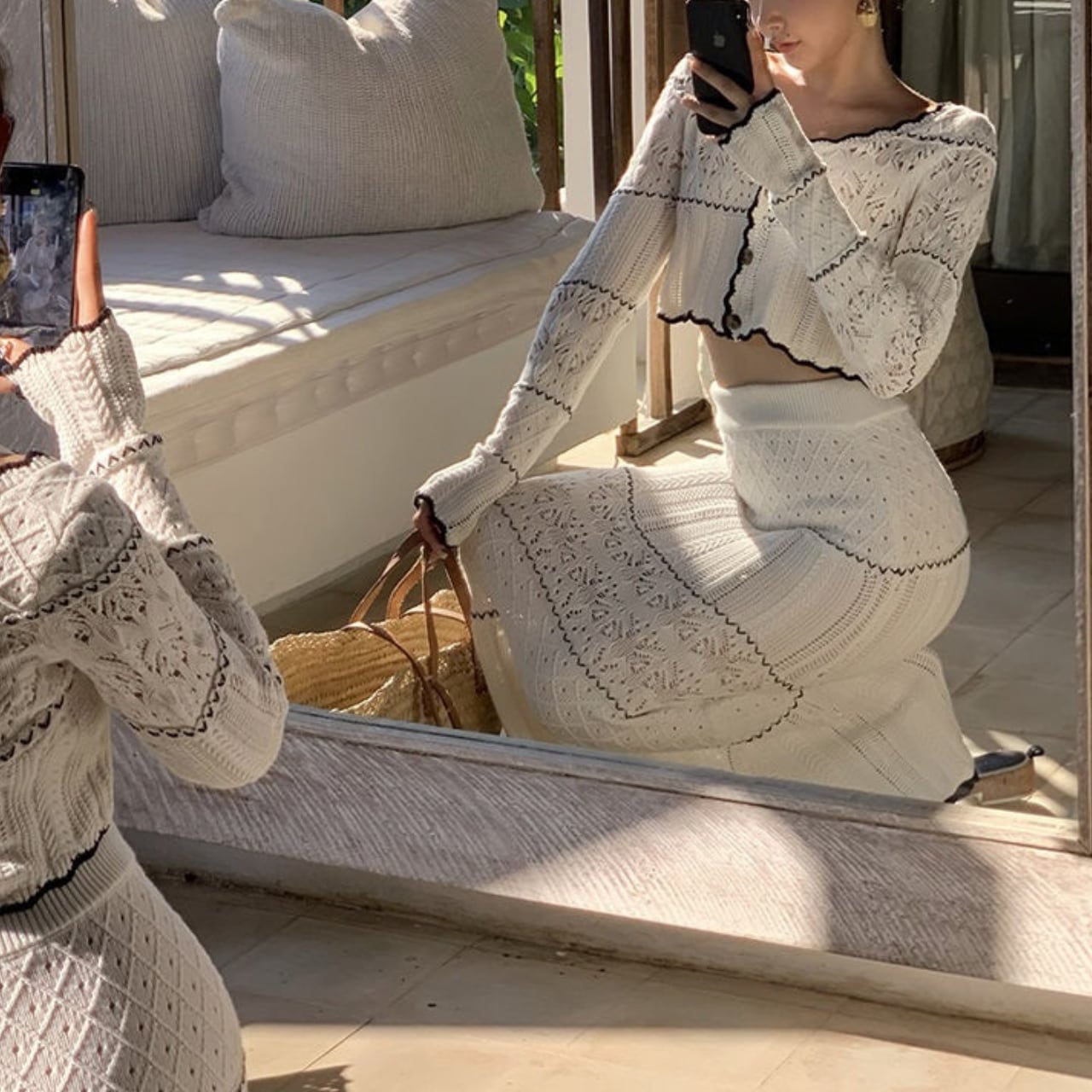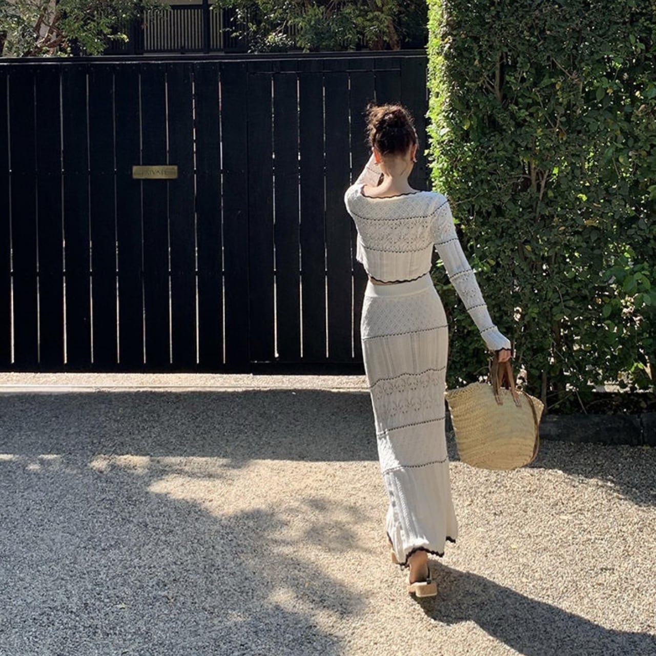このニットカーディガン ロングスカートセットアップは、透かし編みのデザインが特徴で、季節感を漂わせる一着です。涼しげな素材感で着心地も快適、カーディガンはさらりと羽織れるので、コーディネートの仕上げに最適です。リーズナブルなのに高見えするアイテムで、普段使いからお出かけまで幅広く対応します!