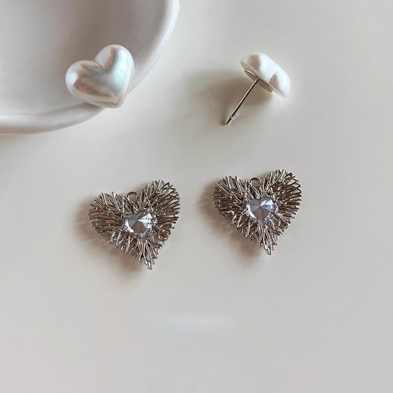 ・愛らしいデザインのラブ パールピアスが新登場!人工パールとキュービックジルコニアを組み合わせたこのアイテムは、どんなシーンでも華やかさをプラスします。ハート型のディテールは約1×1.3cmで、存在感がありつつも使いやすいサイズ感です。カジュアルからフォーマルまで幅広く使えるため、さまざまなコーディネートに合わせて楽しめます。