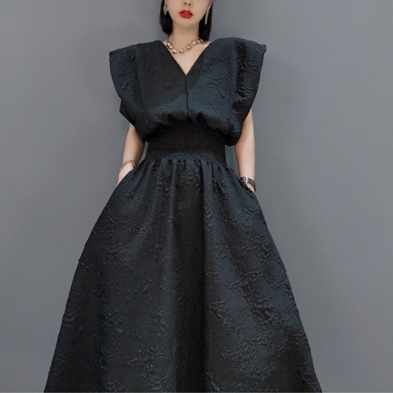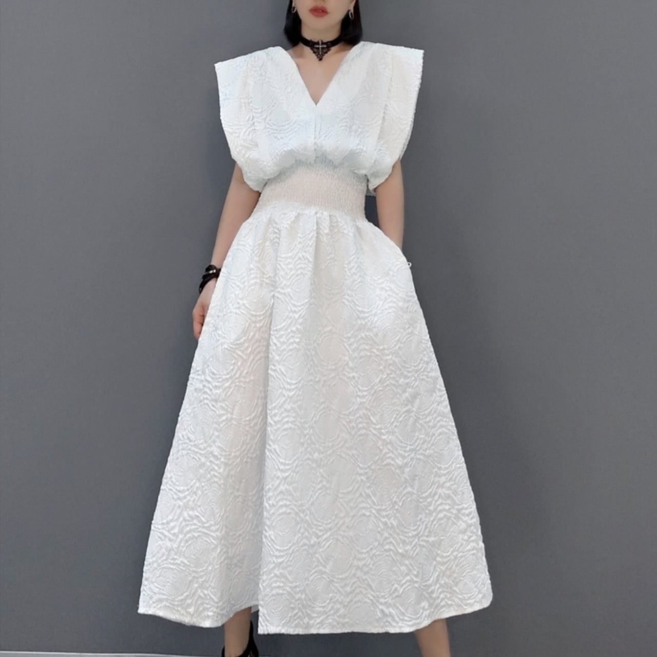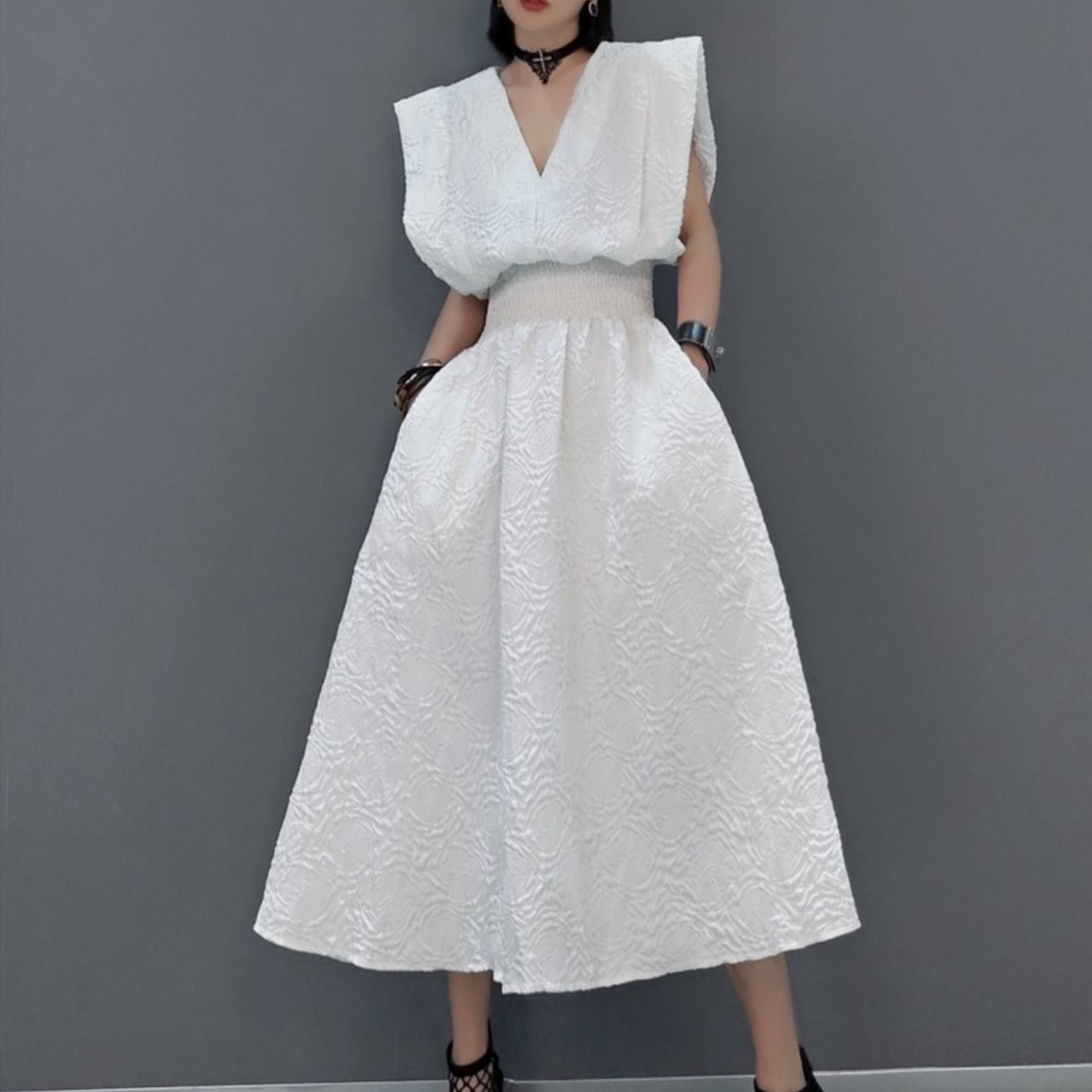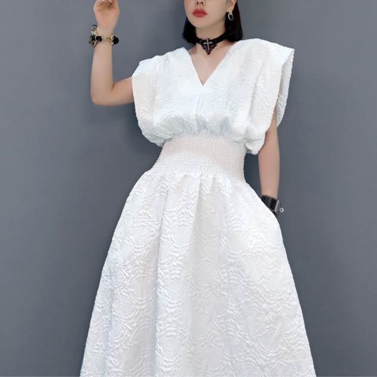・洗練されたVネックデザインのジャガード ワンピースが新登場!ホワイトとブラックの2色展開で、シンプルながらも存在感のあるアイテムです。ワンサイズのため、様々な体型にフィットし、日常のカジュアルシーンから特別なイベントまで幅広く活躍します。