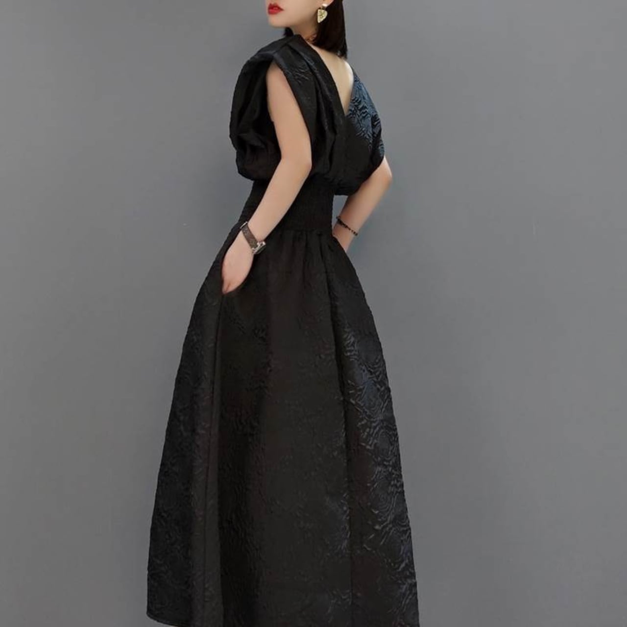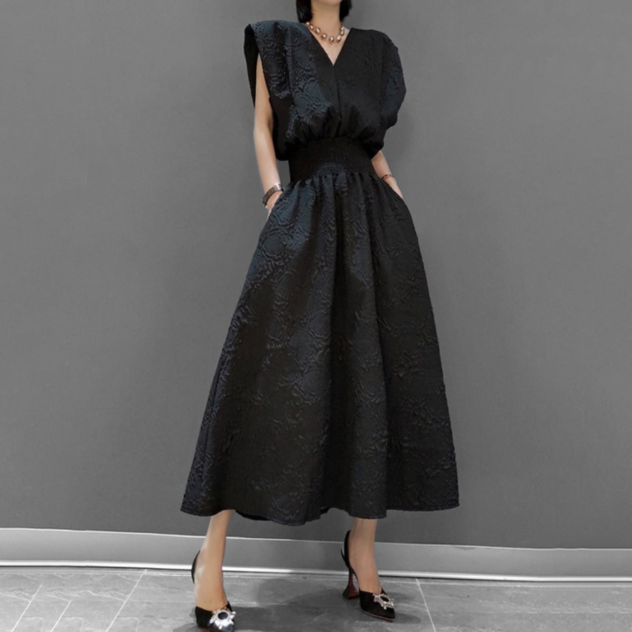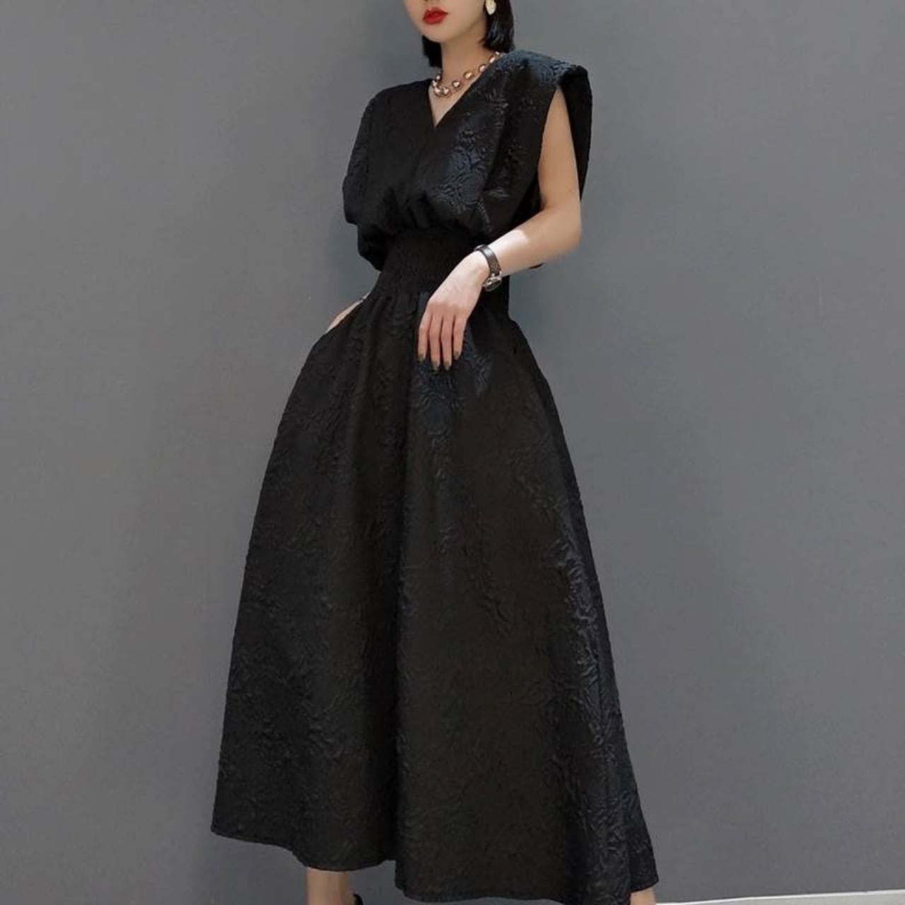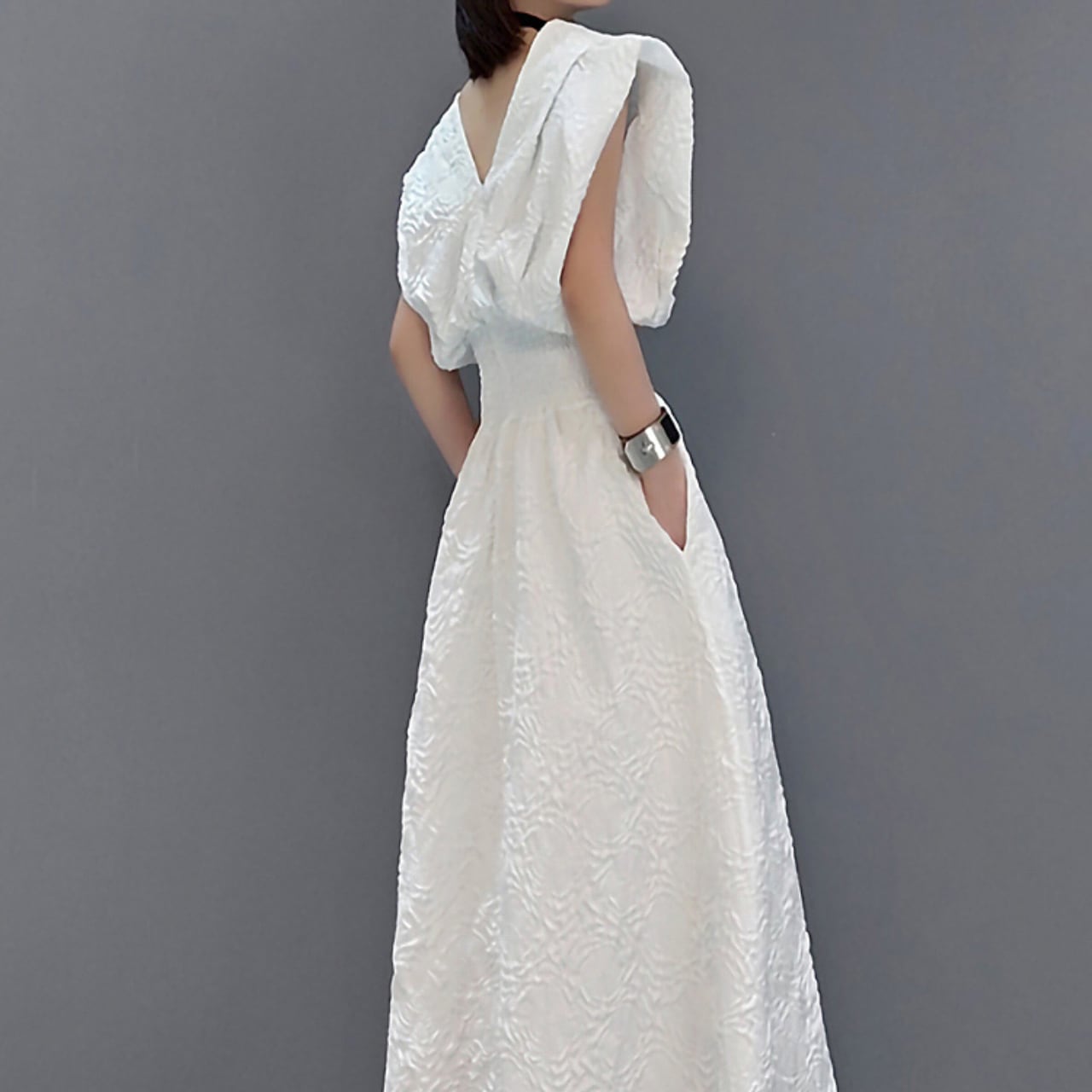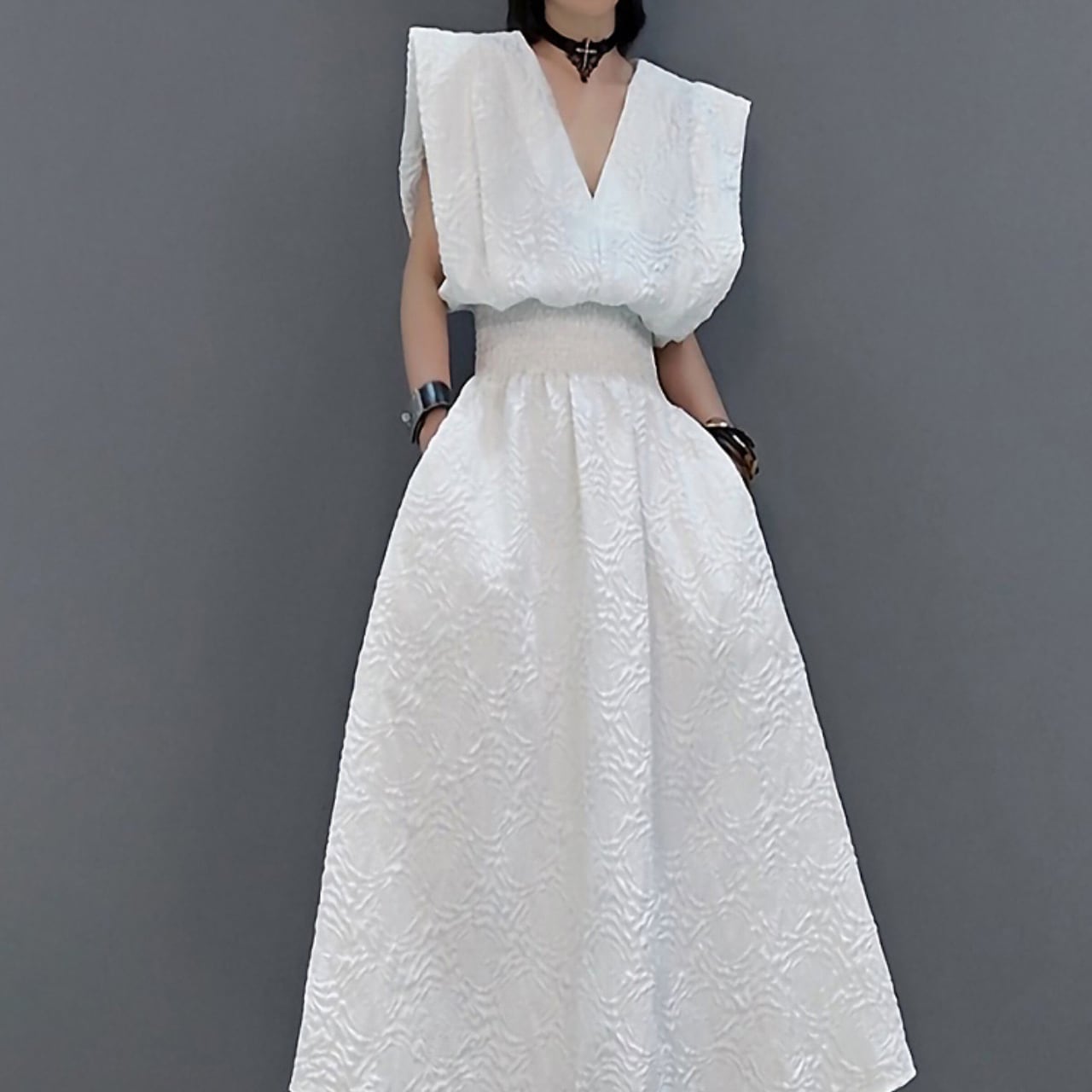 ・洗練されたVネックデザインのジャガード ワンピースが新登場!ホワイトとブラックの2色展開で、シンプルながらも存在感のあるアイテムです。ワンサイズのため、様々な体型にフィットし、日常のカジュアルシーンから特別なイベントまで幅広く活躍します。