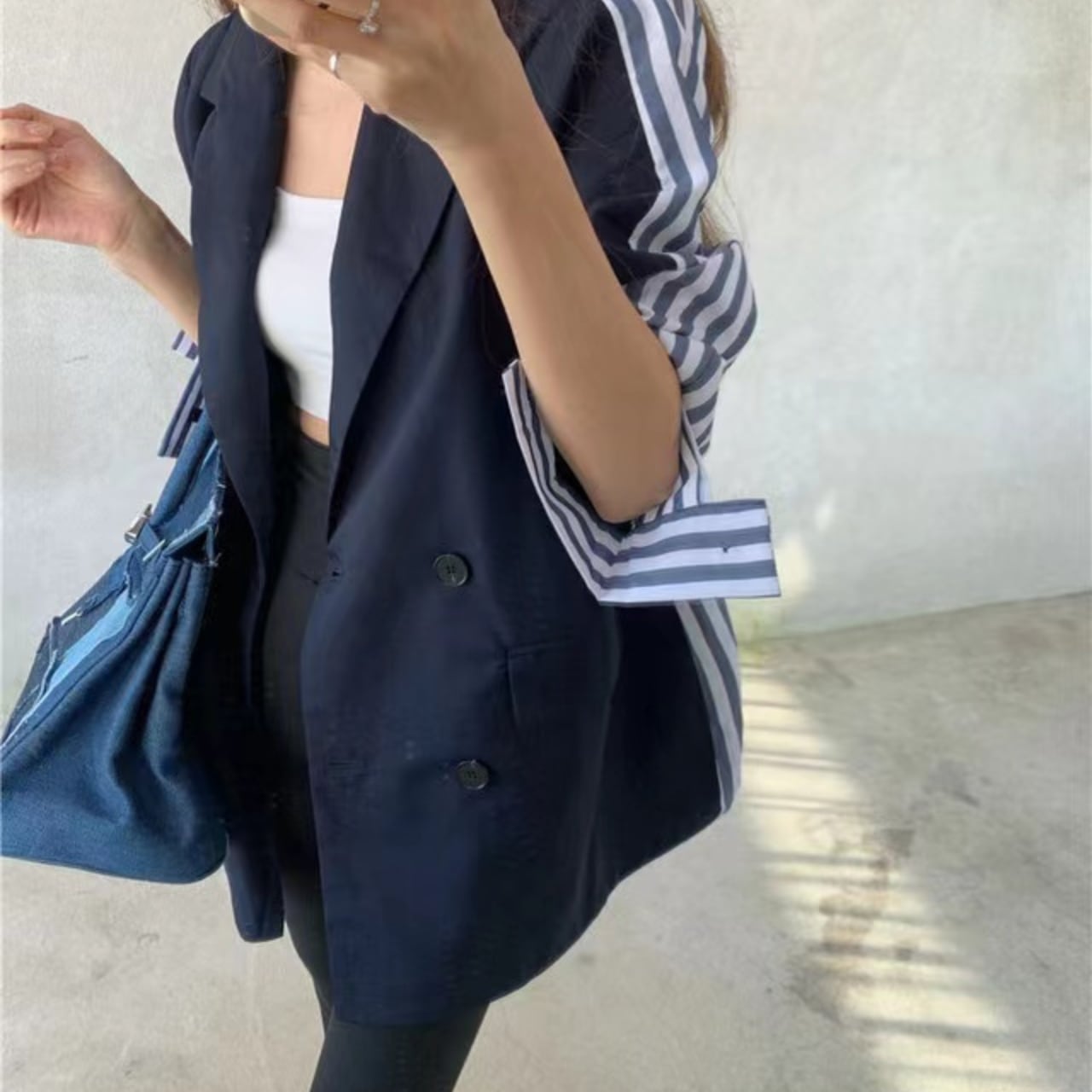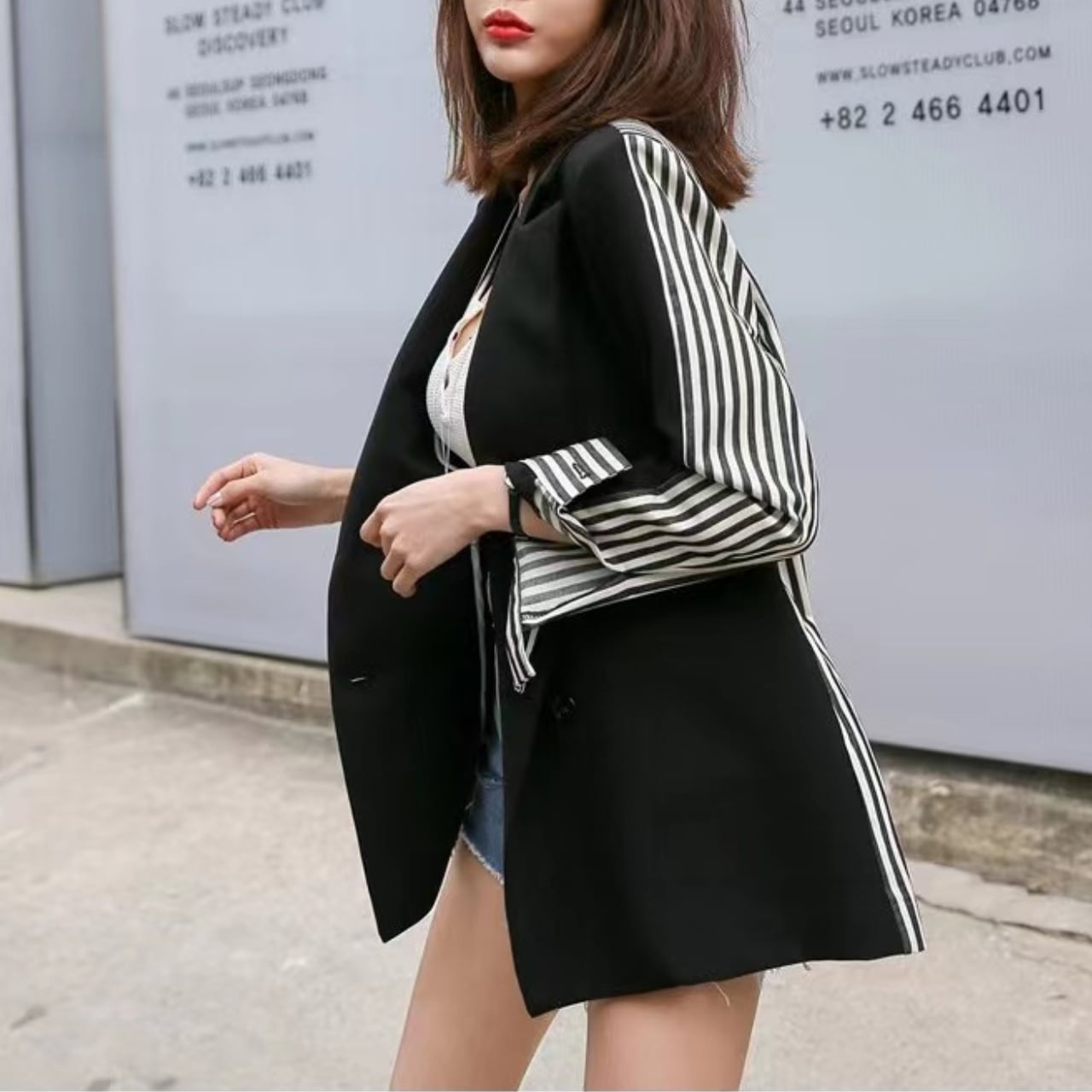 ・おしゃれなストライプ カジュアル ジャケットが新登場!背中と腕にストライプのデザインが施され、リラックスしたスタイルを実現します。シンプルなブラック、洗練されたネイビーの2色展開で、SからXLまでのサイズをご用意。カジュアルな日常使いや友人とのお出かけ、さまざまなシーンでお楽しみいただけます!