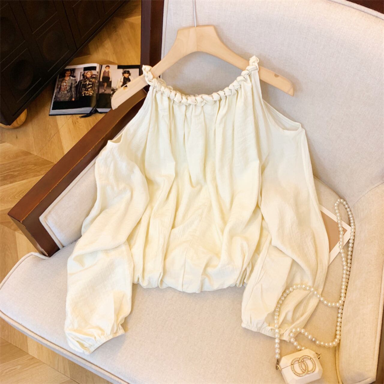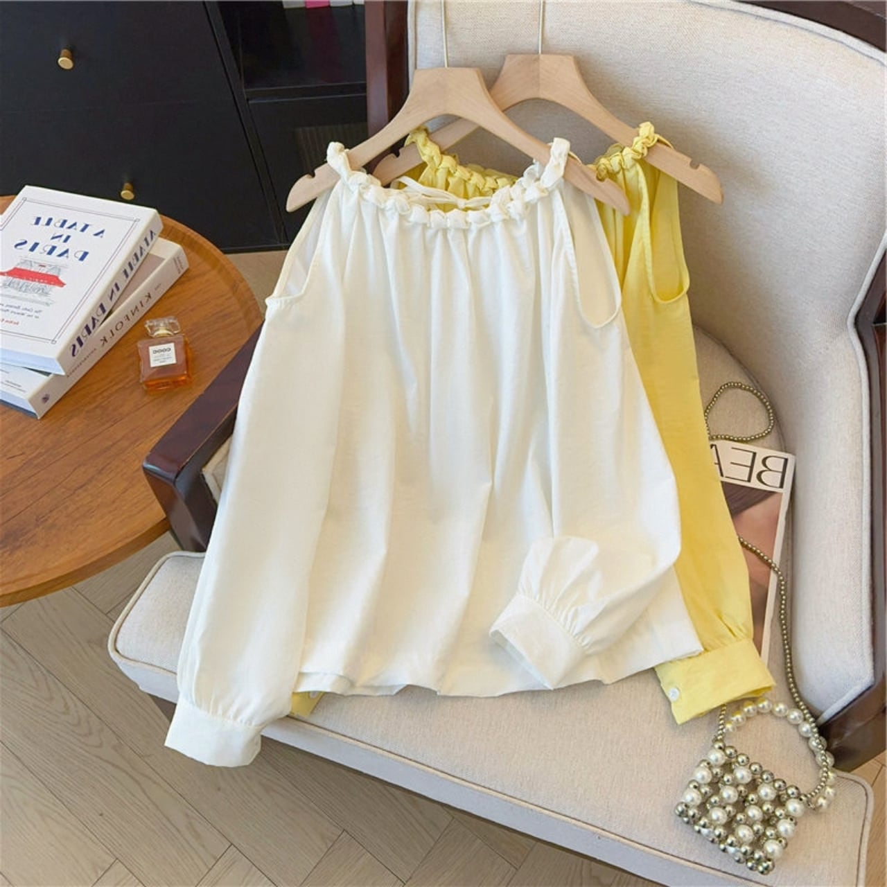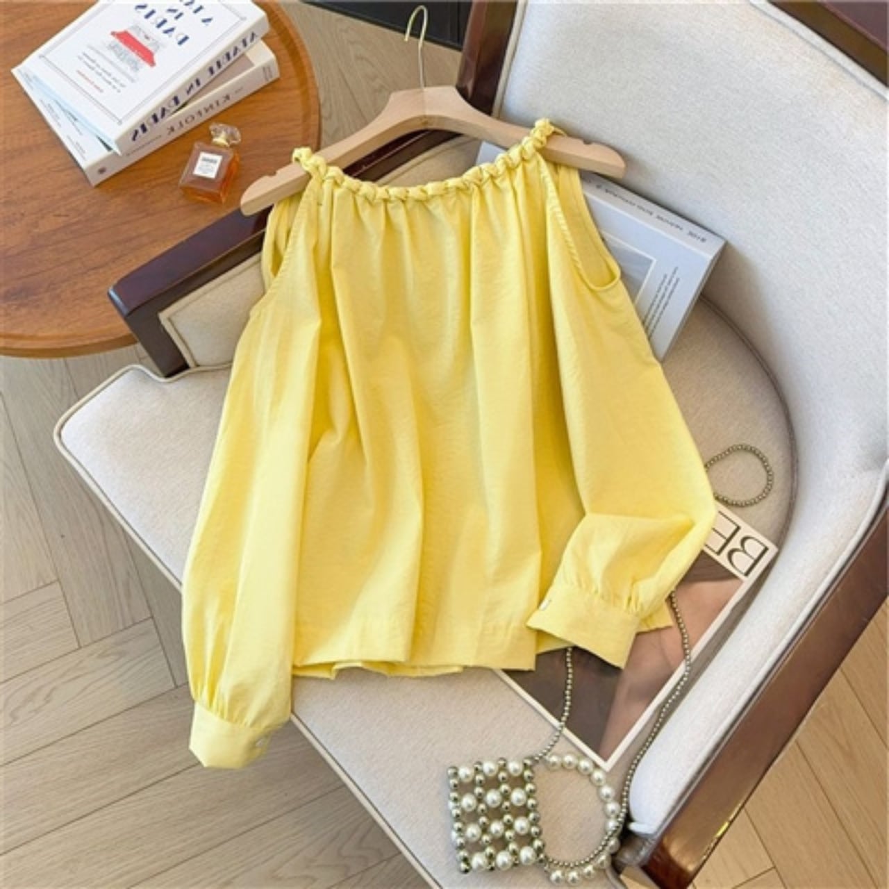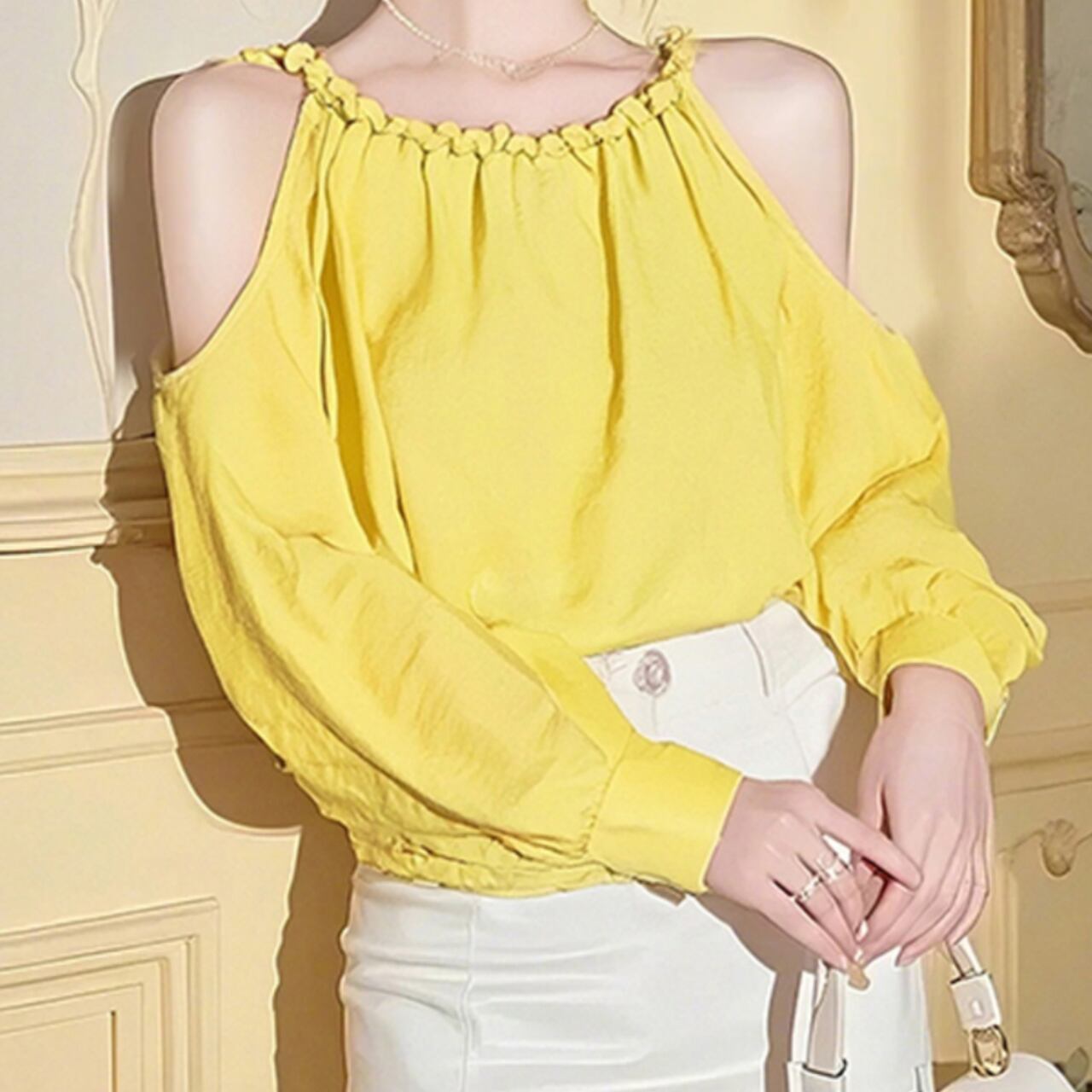 ・トレンディなオフショルダー 長袖 シャツが新登場!華やかなイエローとシンプルで清潔感のあるホワイトの2色展開で、SからLまでのサイズをご用意しております。リラックスした日常スタイルや、おしゃれな外出時にも最適なアイテムです!