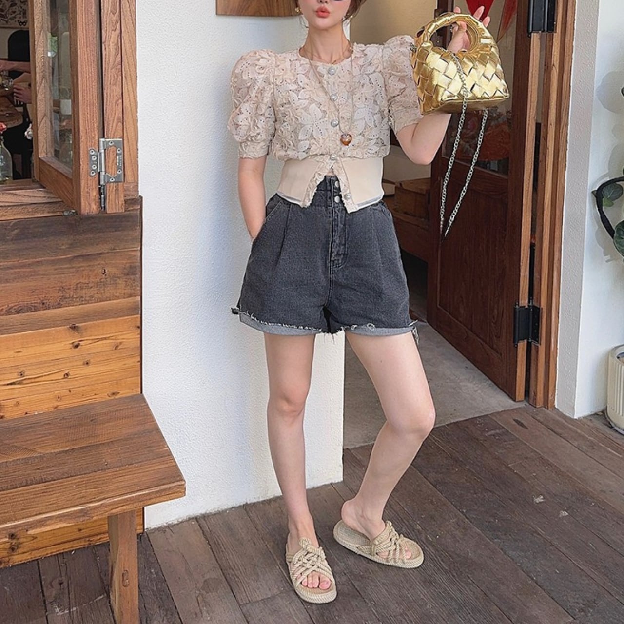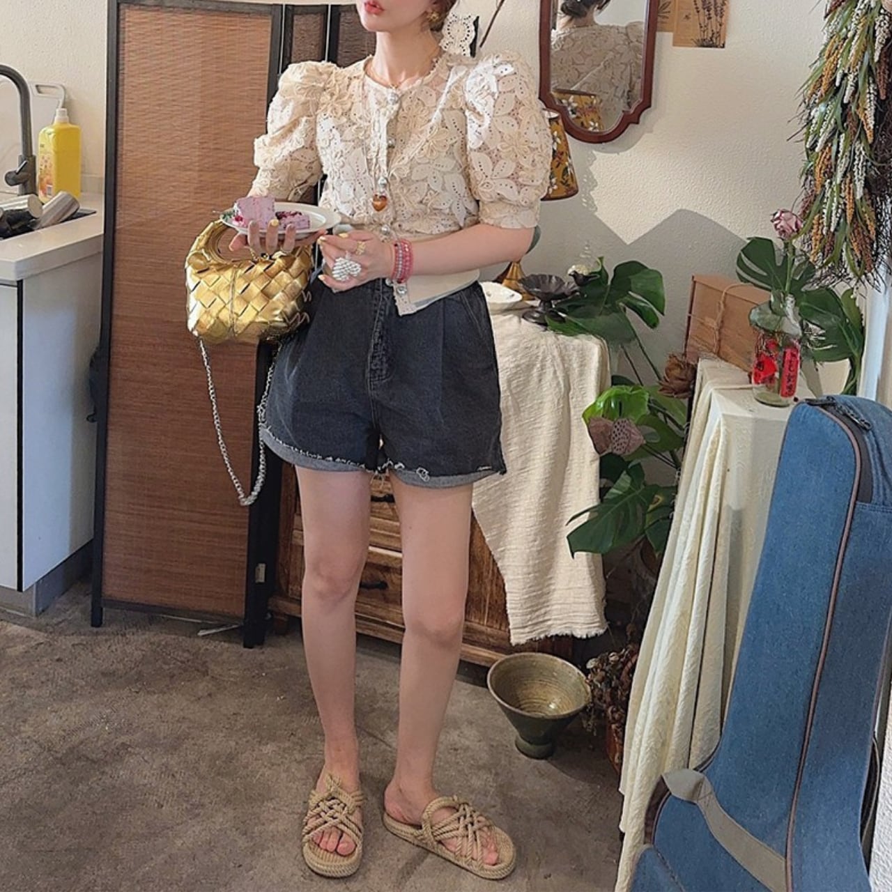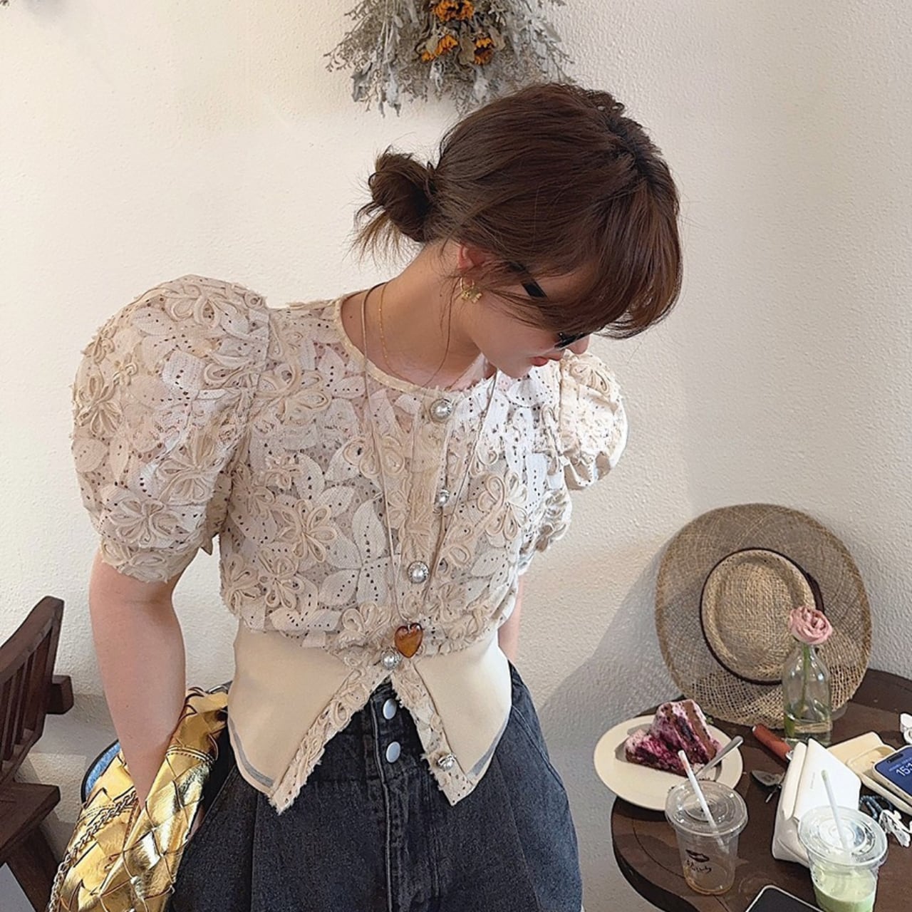 このパフスリーブレースシャツは、デイリーユースから特別なシーンまで幅広く活躍します。ボトムスにデニムやスカートを合わせることで、カジュアルスタイルからエレガントなスタイルまで、シーンに応じたコーディネートが可能です。レースの繊細なデザインが着こなしに華やかさを与えます。