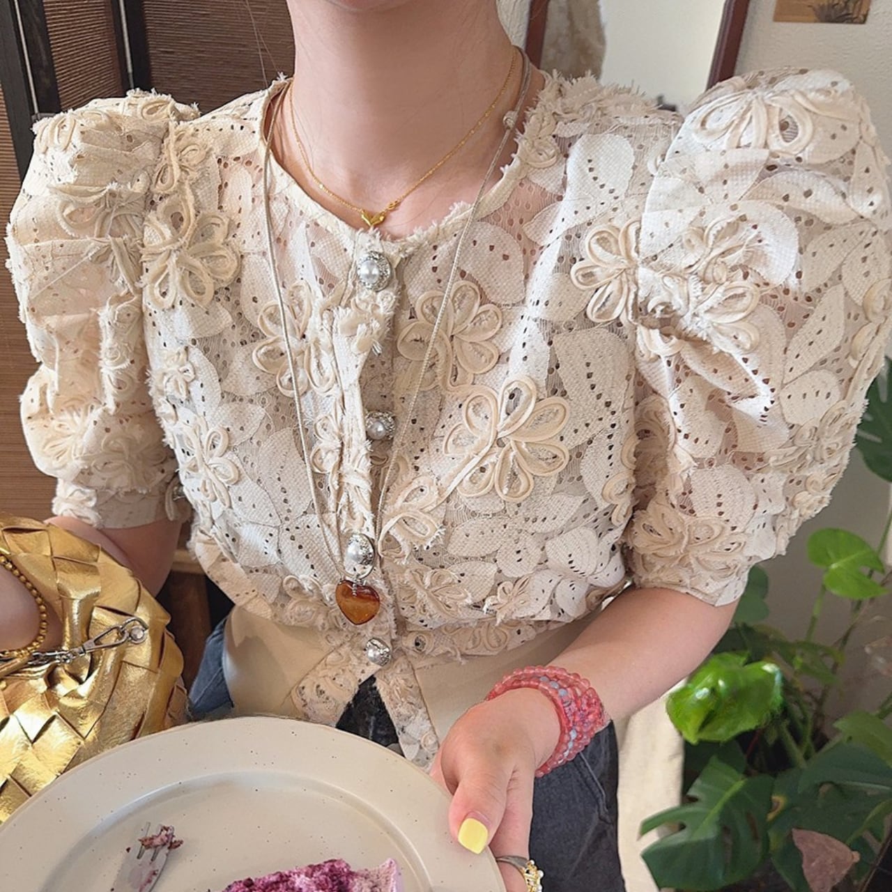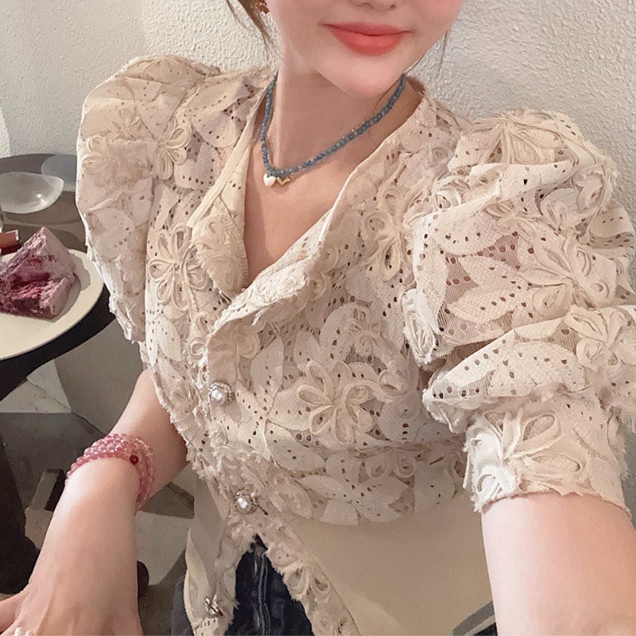 ・上品なベージュカラーが特徴のパフスリーブレースシャツが新登場!ショルダーパッド付きで、立体感のあるシルエットを演出し、女性らしさを引き立てます。ワンサイズで、多くの体型にフィットするデザインになっています!