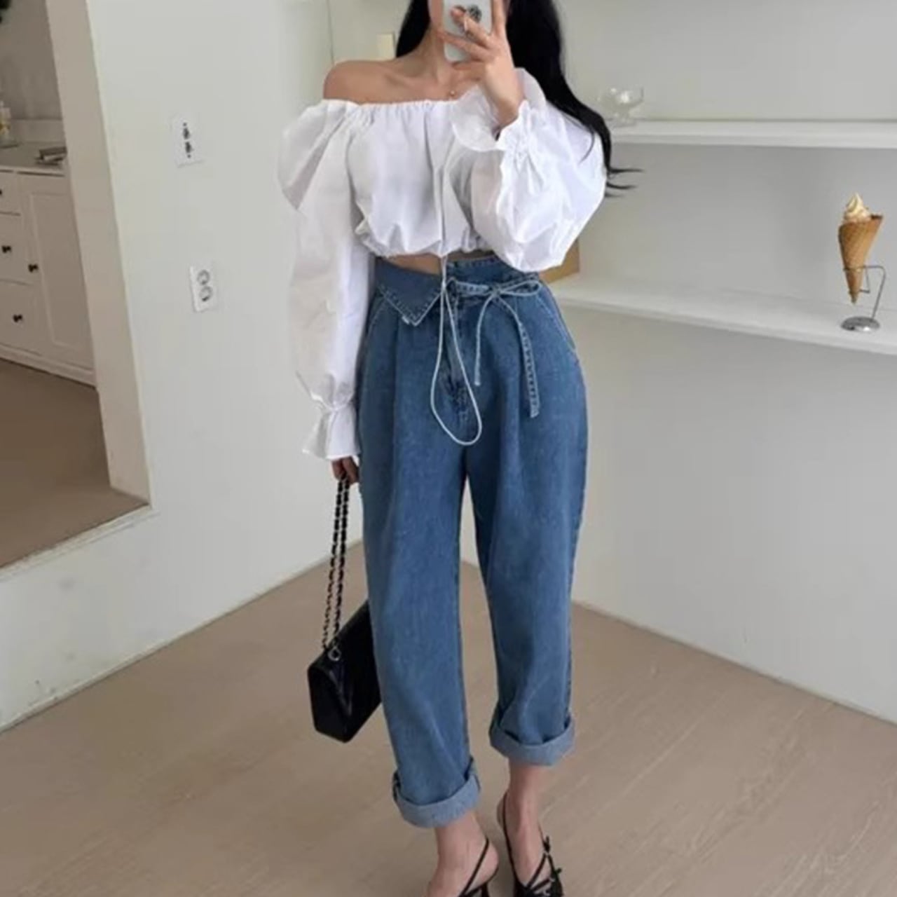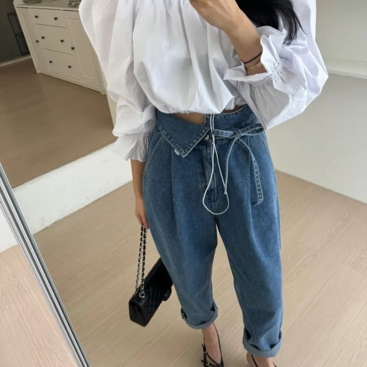 ハイウエスト×テーパードシルエットで、