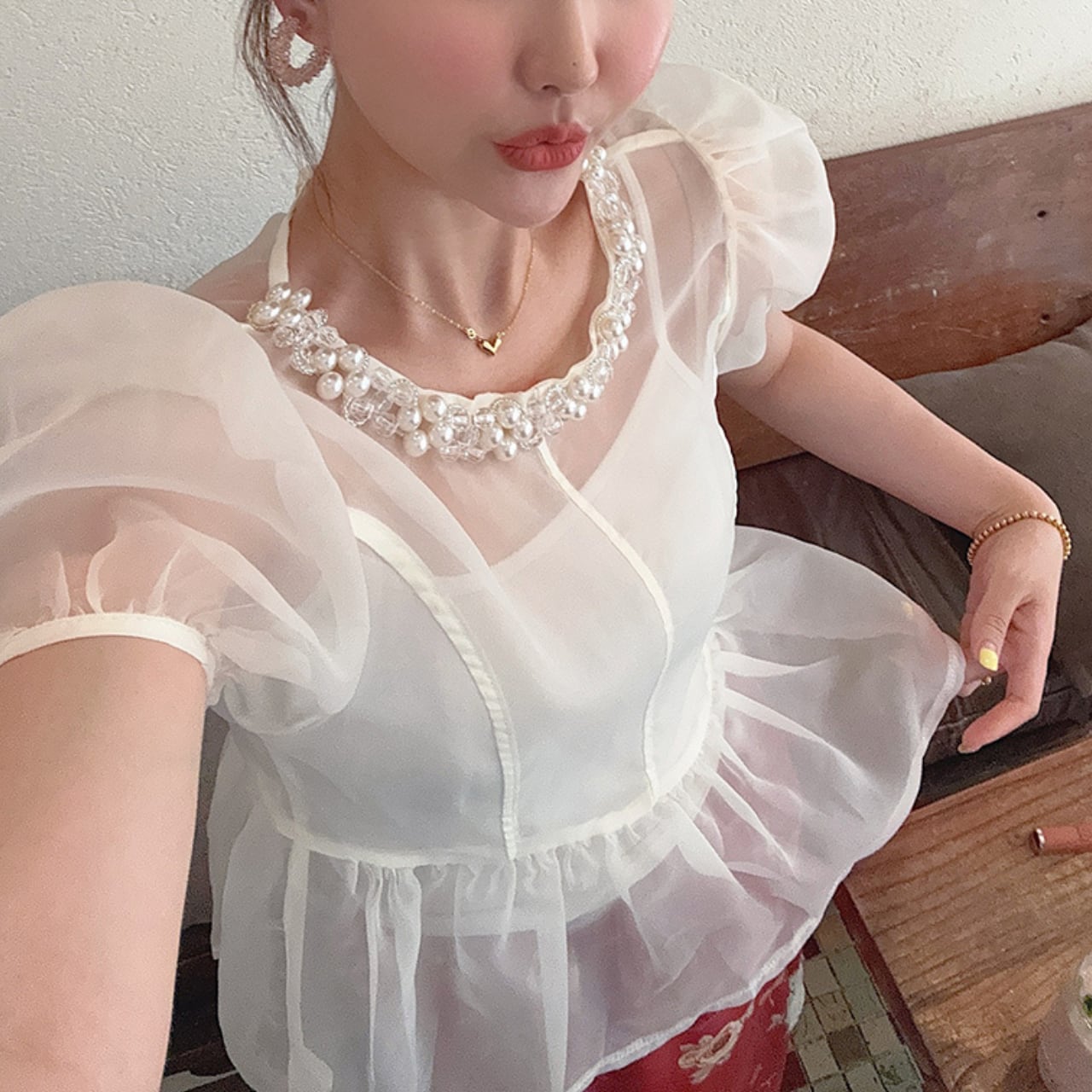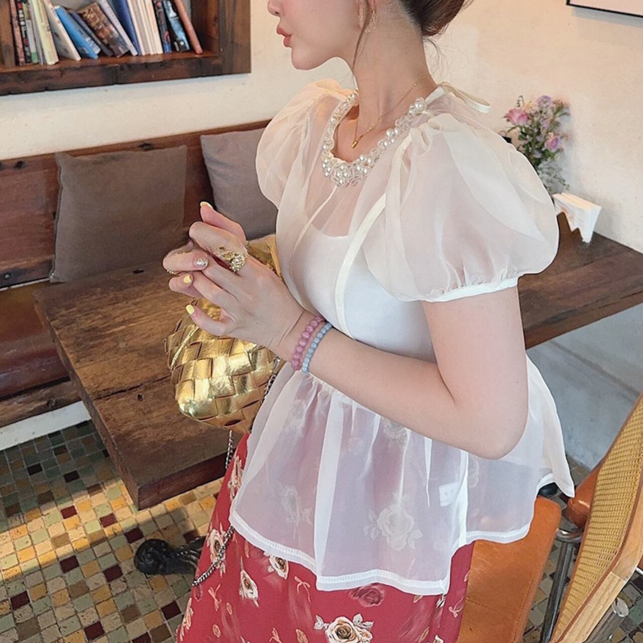 パールビジューパフスリーブトップス a284