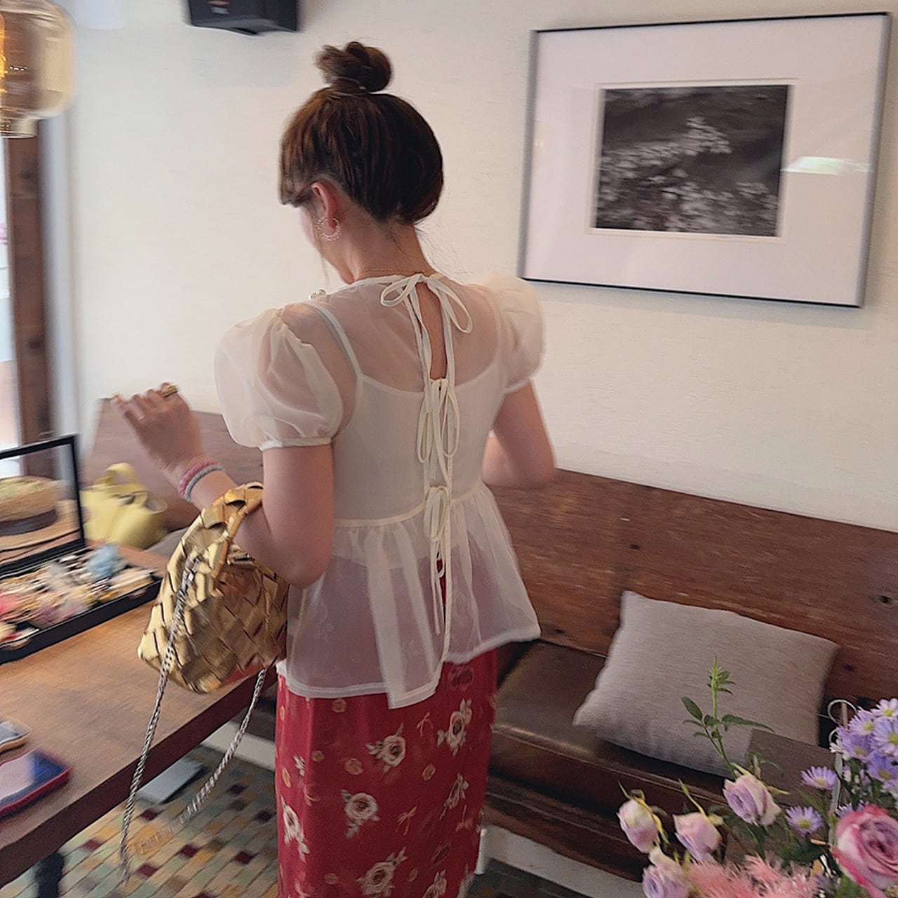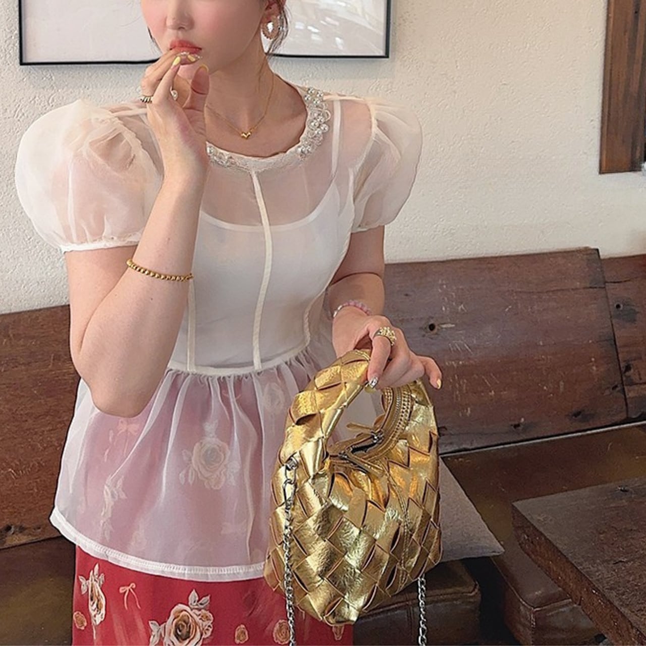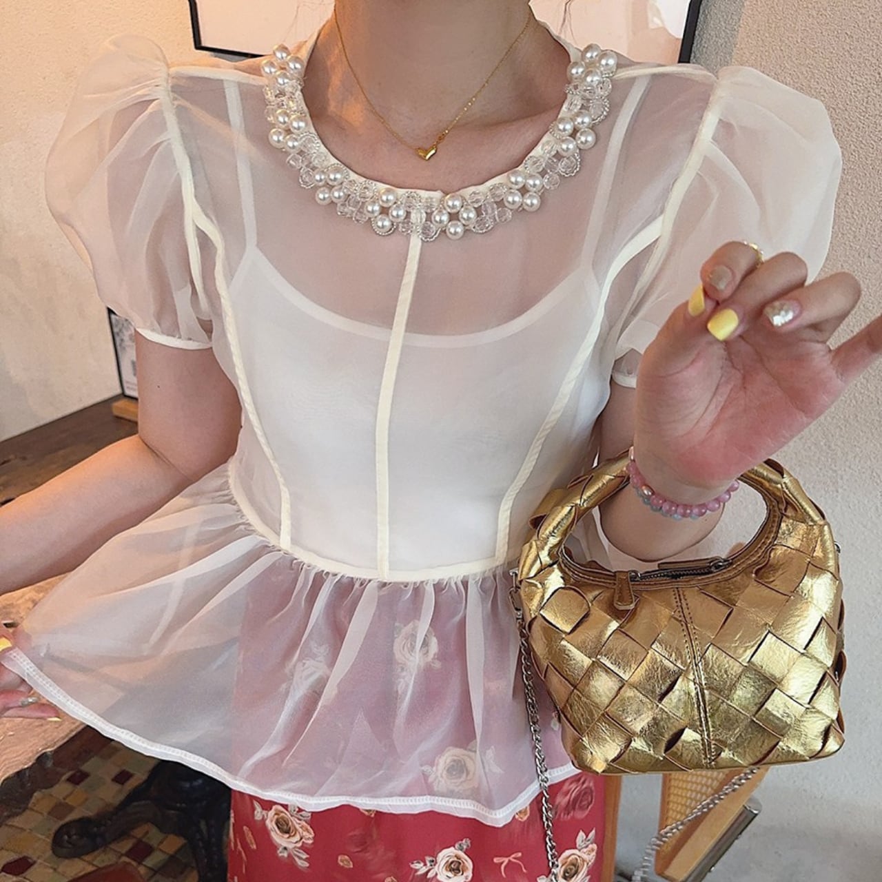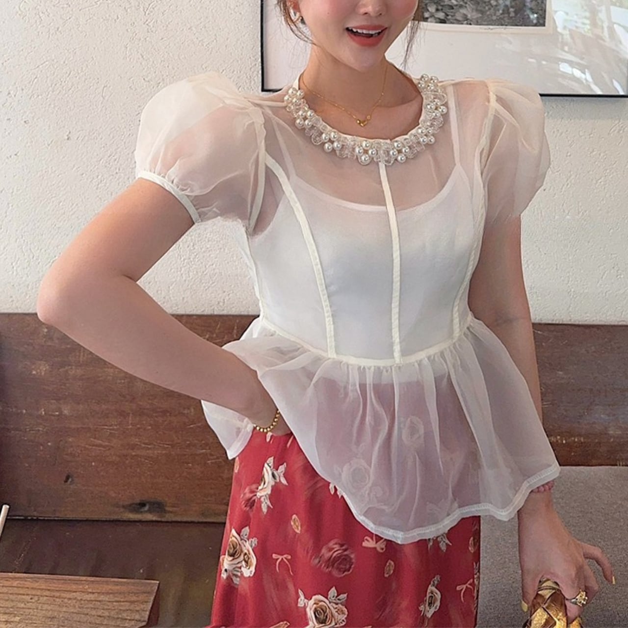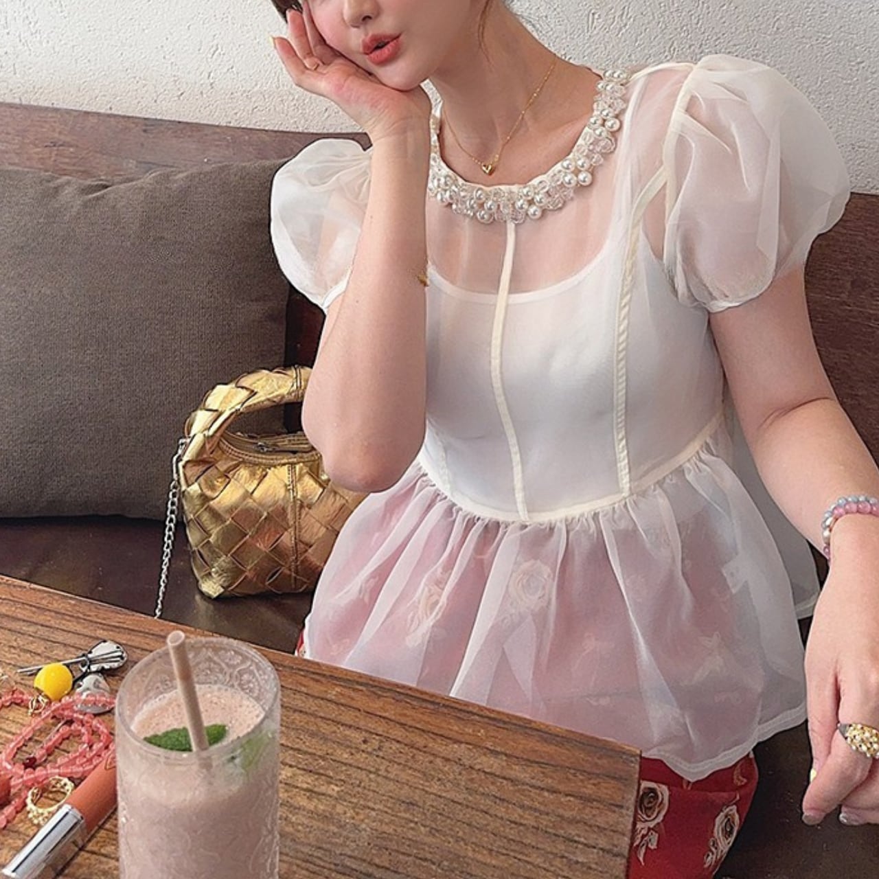・華やかなパールビジューデザインが特徴のパフスリーブトップスが新登場!オーガンジー素材を使用し、軽やかさと透け感があり、特別なシーンにもぴったりなアイテムです。ワンサイズ展開ですが、デザインにより、様々な体型にマッチしやすいのが魅力!