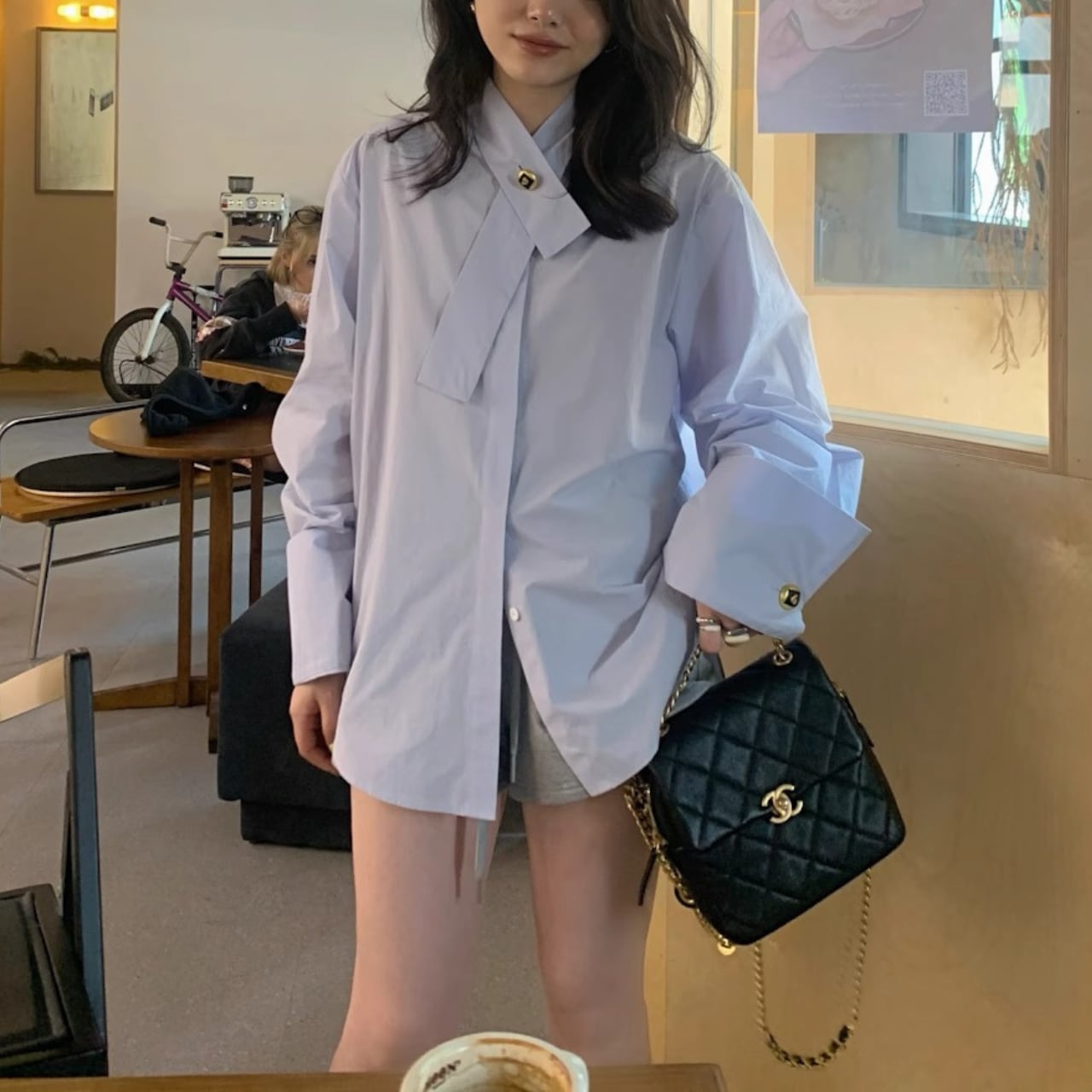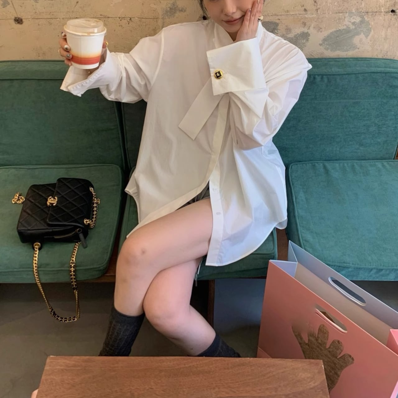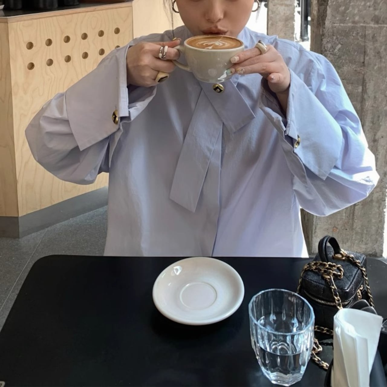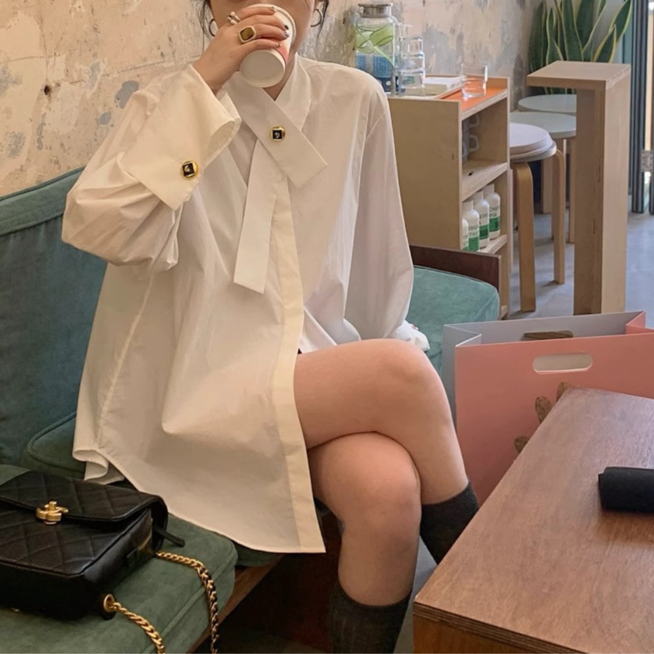 クラシカルな印象のリボンタイがポイントのオーバーシャツ。